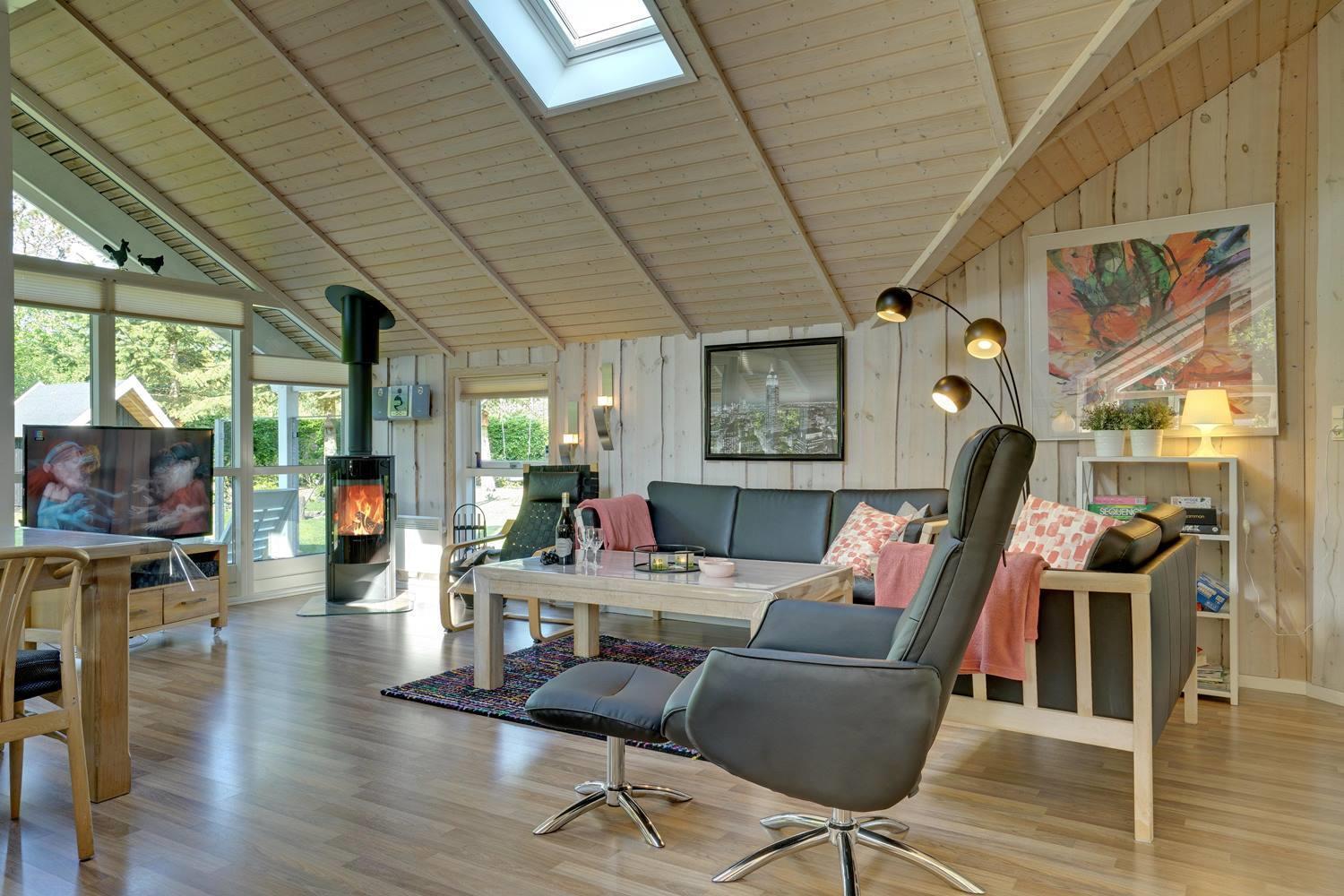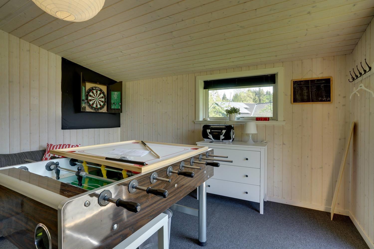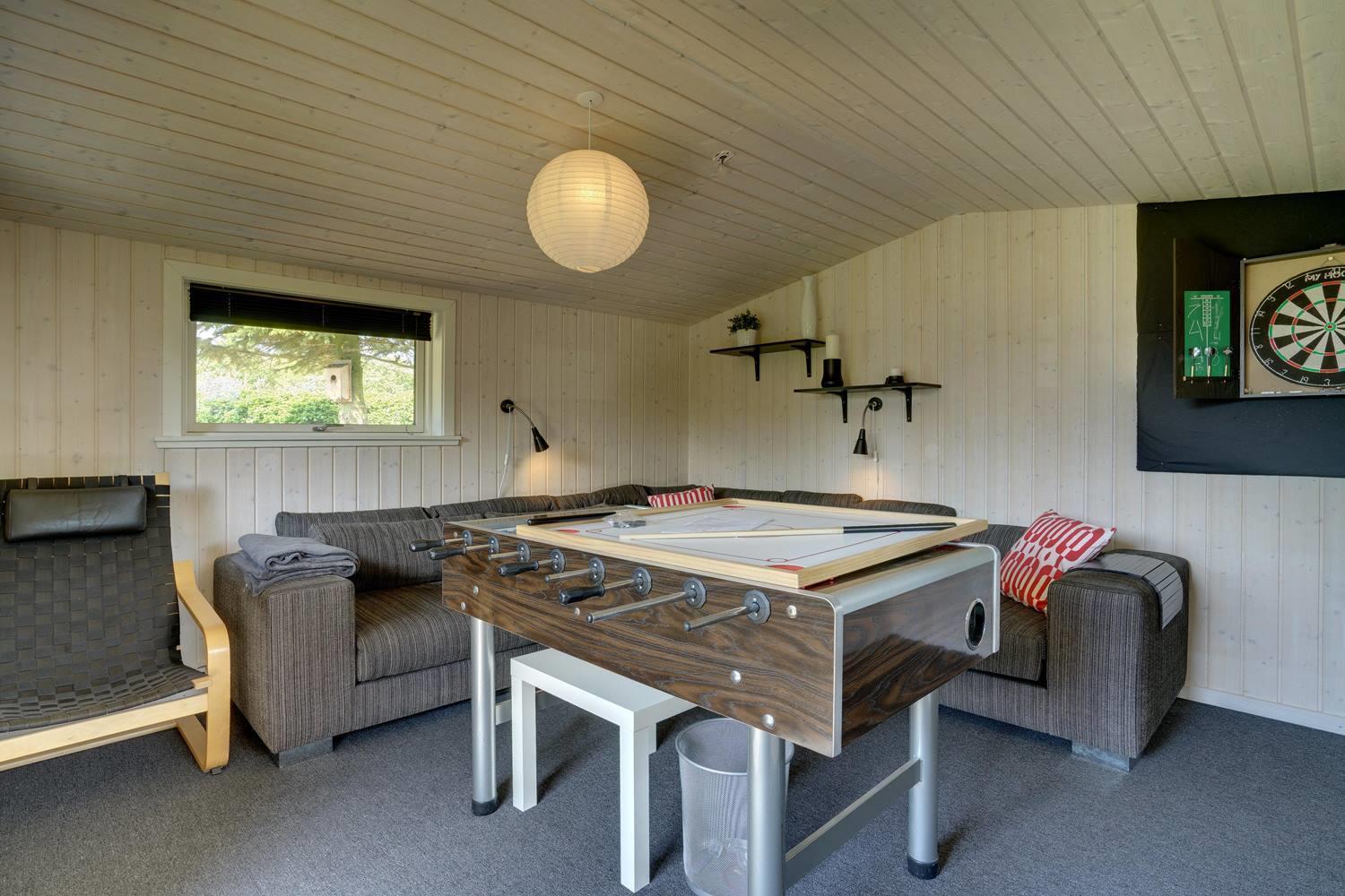 Køkkenet er moderne med store vinduespartier og åbner op mod en hyggelig stue, hvor både TV, brændeovn og varmepumpe skaber en varm og indbydende atmosfære. I anneks er der et aktivitetsrum med blandt andet fodboldbord og dart, perfekt til familieunderholdning.