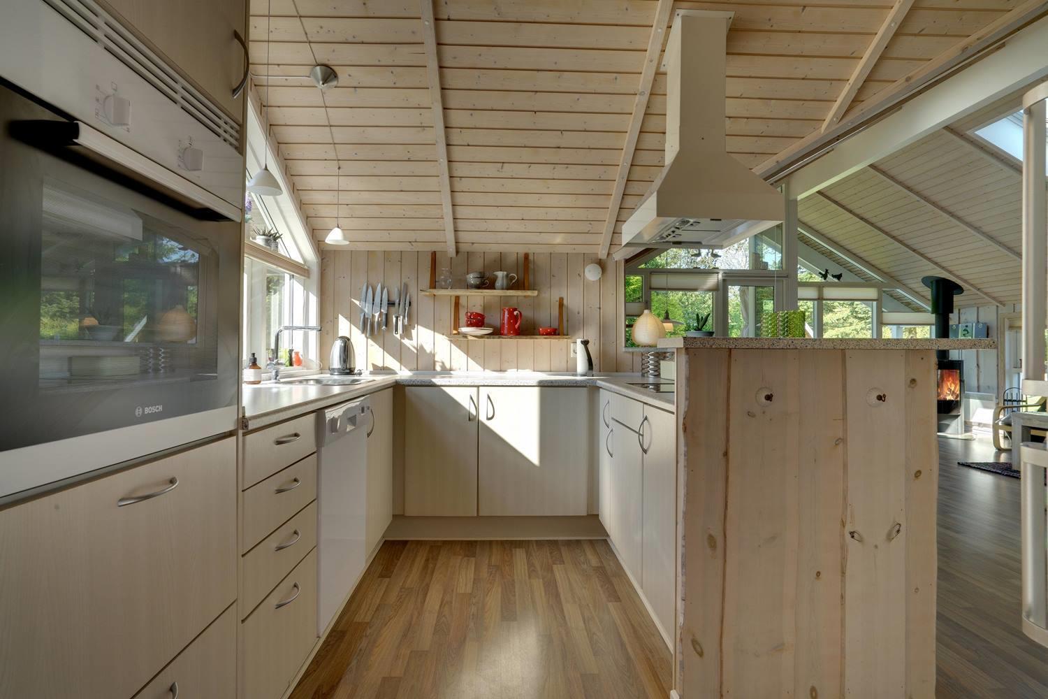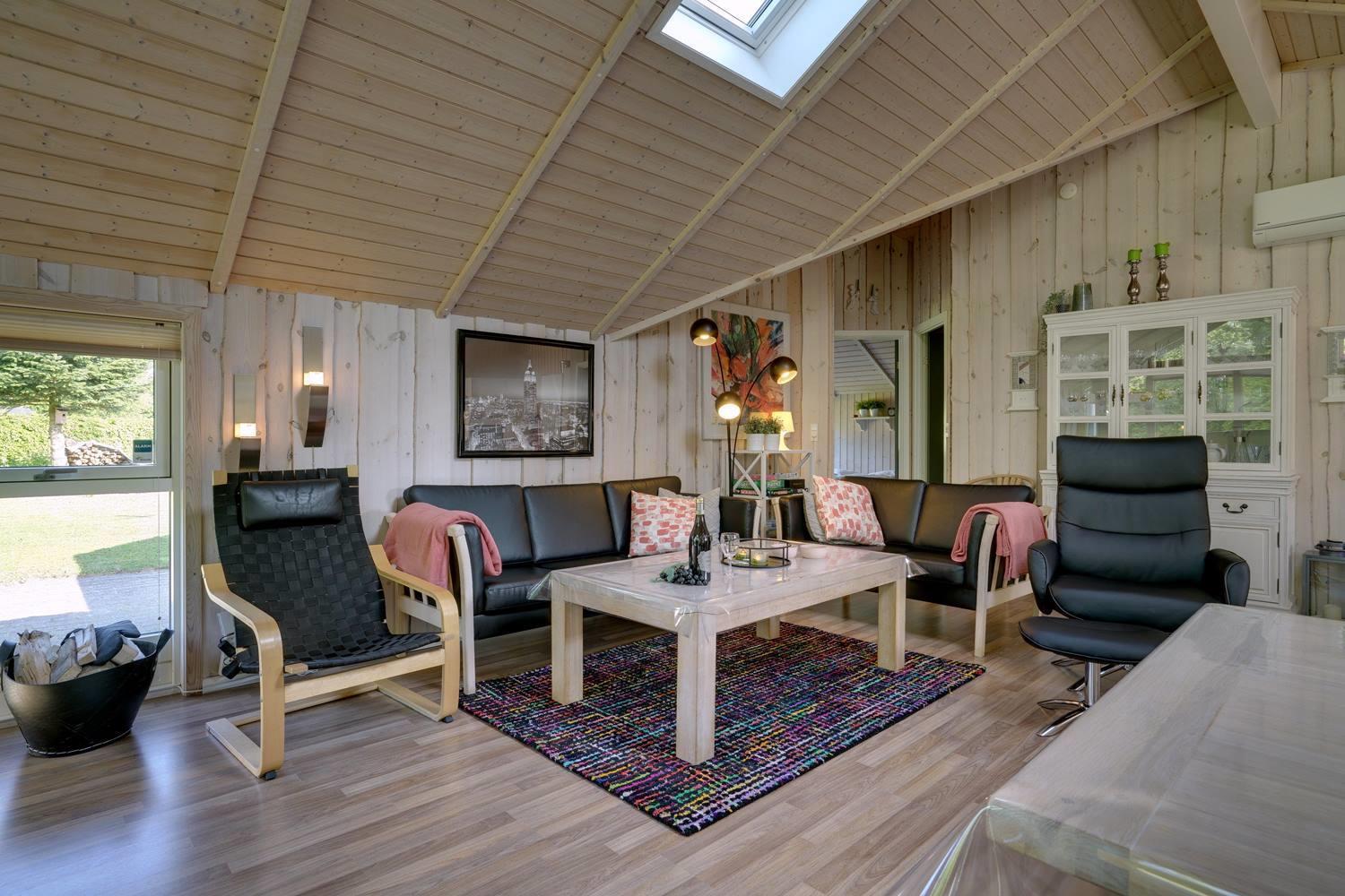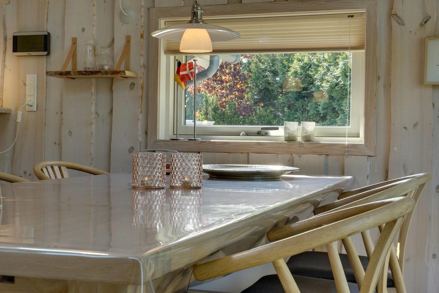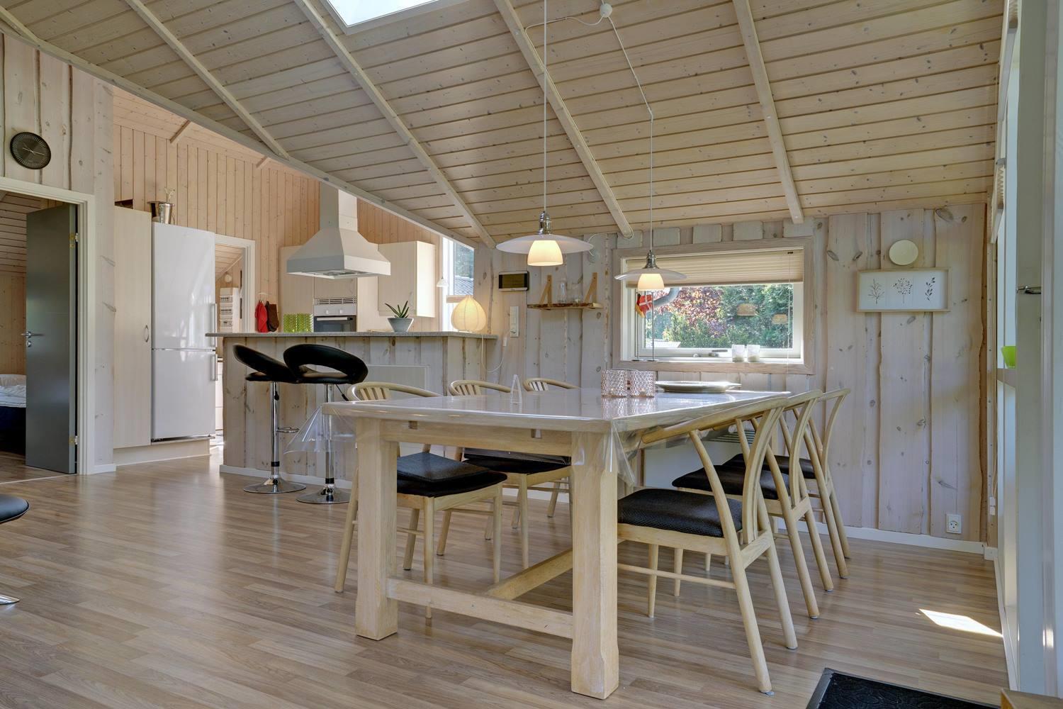 Køkkenet er moderne med store vinduespartier og åbner op mod en hyggelig stue, hvor både TV, brændeovn og varmepumpe skaber en varm og indbydende atmosfære. I anneks er der et aktivitetsrum med blandt andet fodboldbord og dart, perfekt til familieunderholdning.