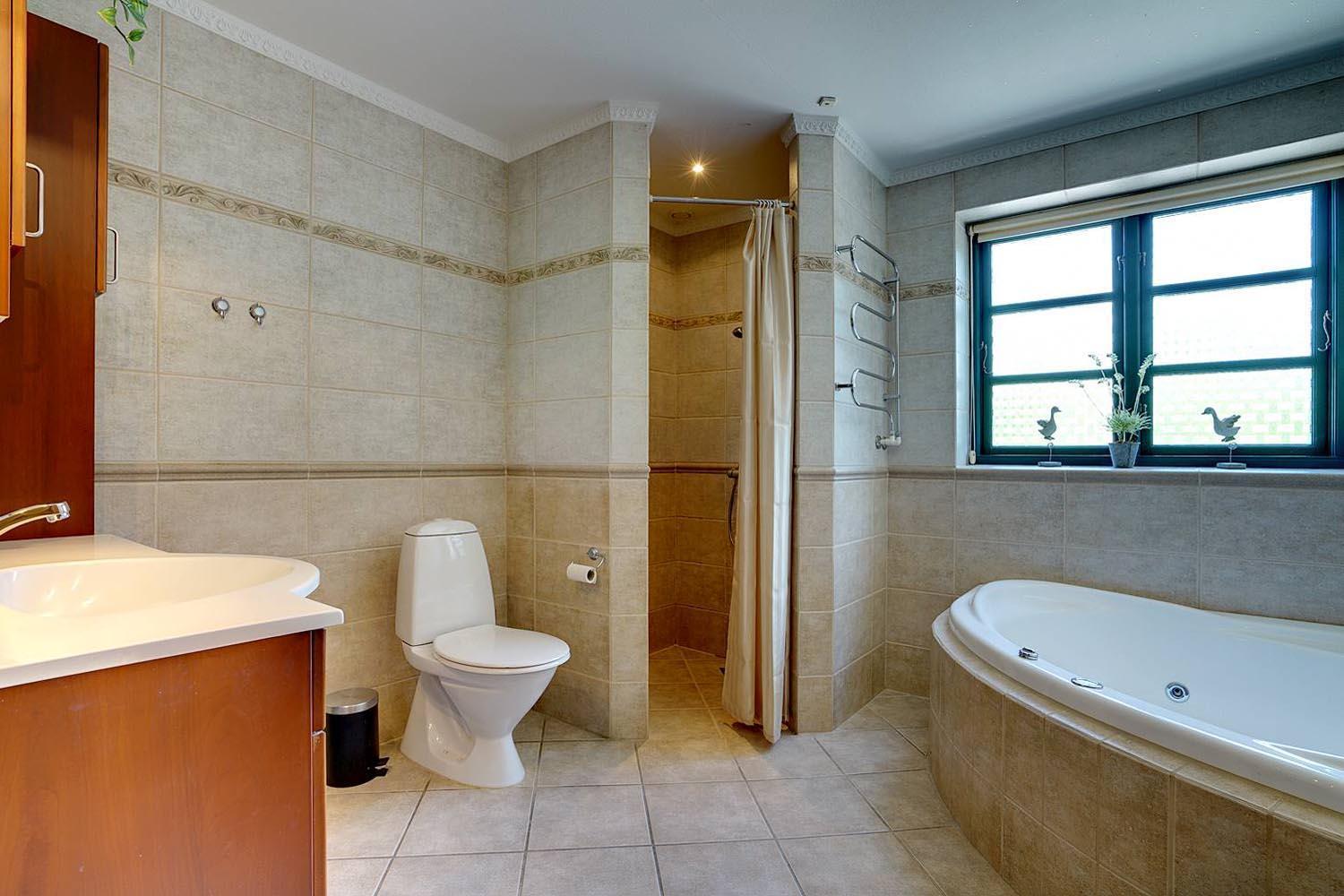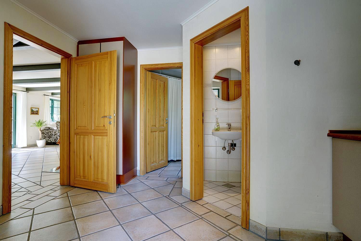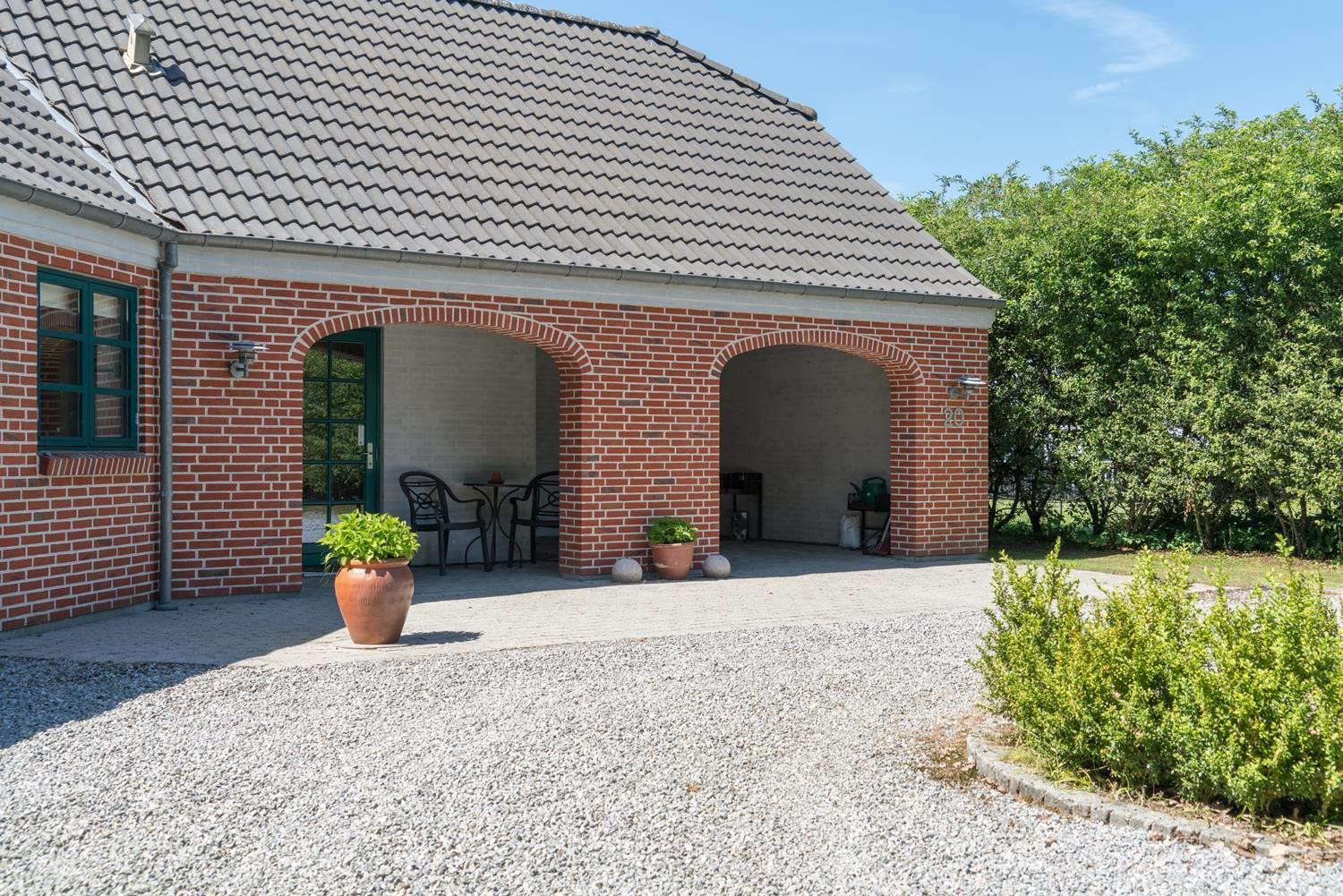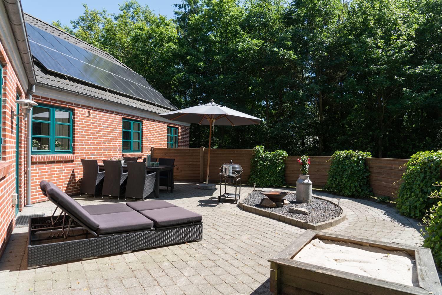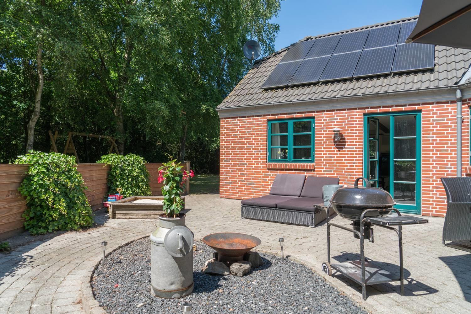 Badeværelse med spa for de ømme muskler. Ekstra toilet. Huset har gulvvarme overalt. Vaskerum med vaskemaskine og tørretumbler, samt bryggers. Grunden er velbeplantet og med høre træer. Stor gårdsplads og carport. Sandkasse på terrassen og gynger på grunden. Huset har synlige bjælker i loftet, der er med til at skabe stemning sammen med de hyggelige 'bondevinduer'. Læfuld terrasse med hygge.