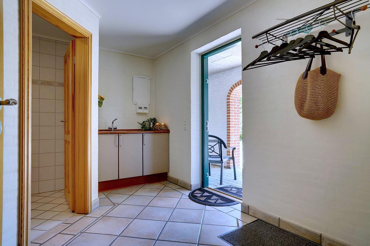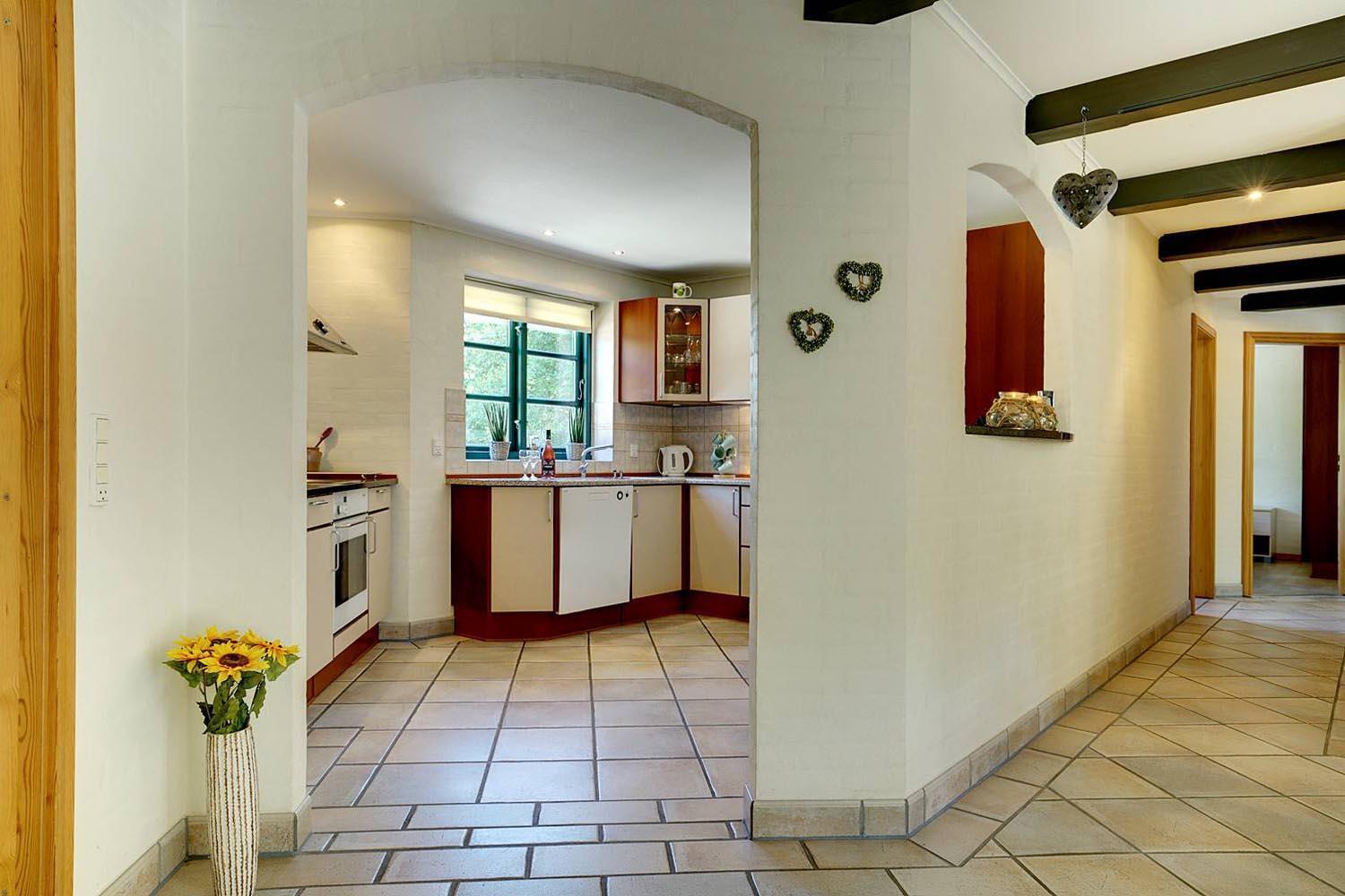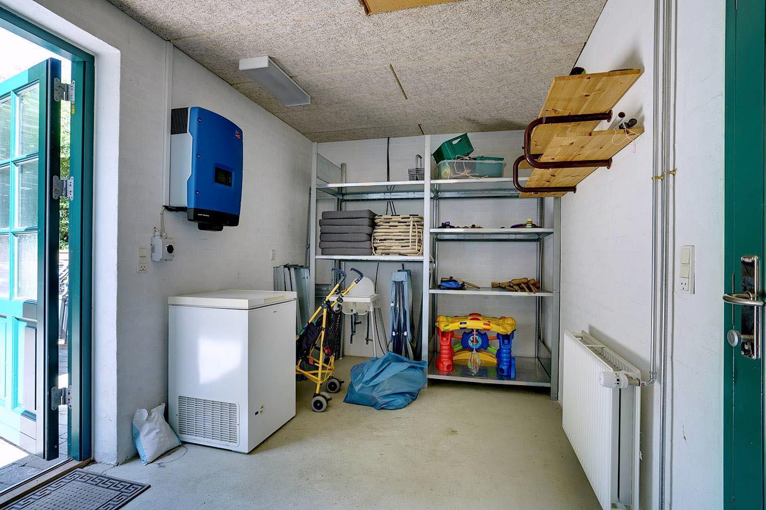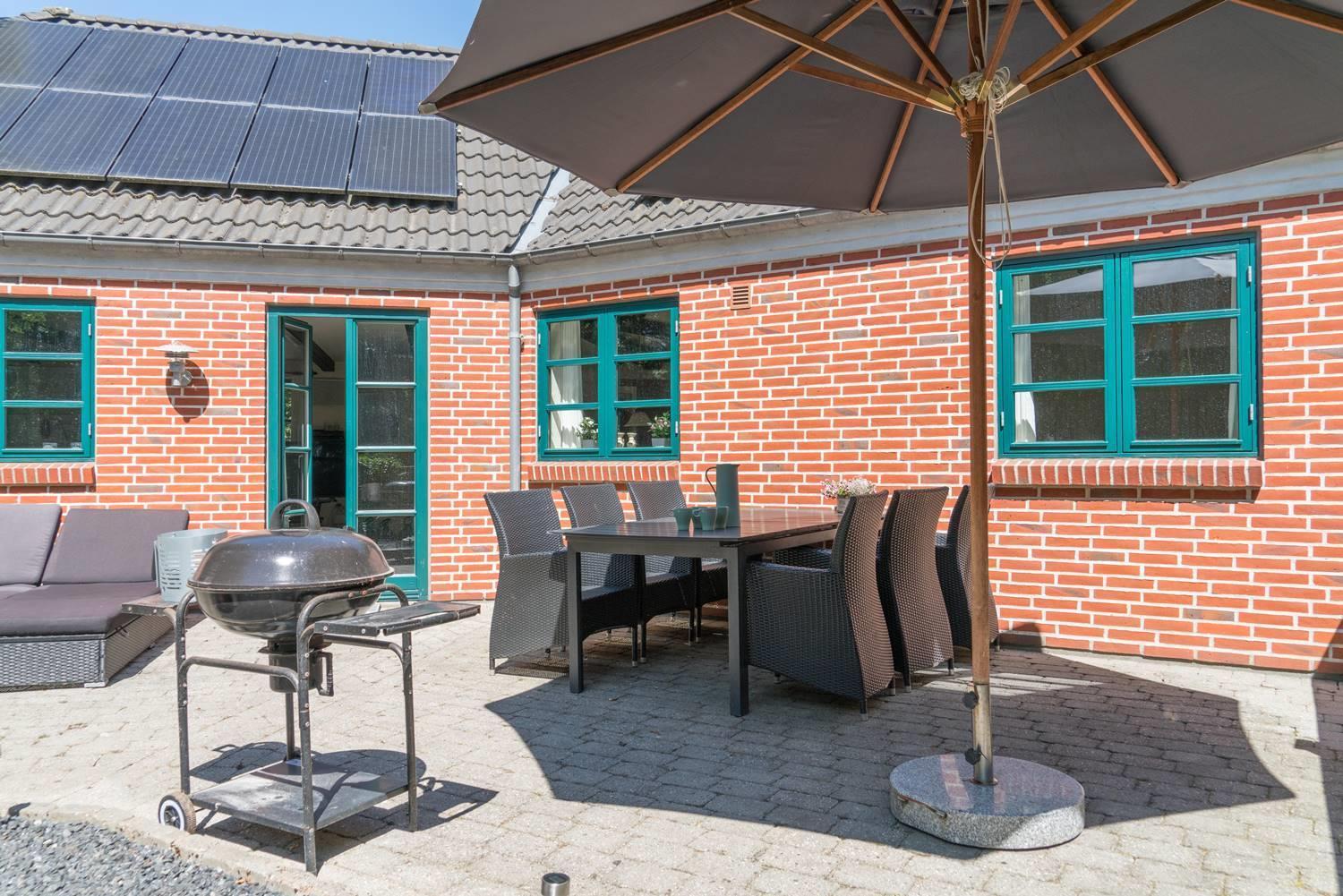 Badeværelse med spa for de ømme muskler. Ekstra toilet. Huset har gulvvarme overalt. Vaskerum med vaskemaskine og tørretumbler, samt bryggers. Grunden er velbeplantet og med høre træer. Stor gårdsplads og carport. Sandkasse på terrassen og gynger på grunden. Huset har synlige bjælker i loftet, der er med til at skabe stemning sammen med de hyggelige 'bondevinduer'. Læfuld terrasse med hygge.