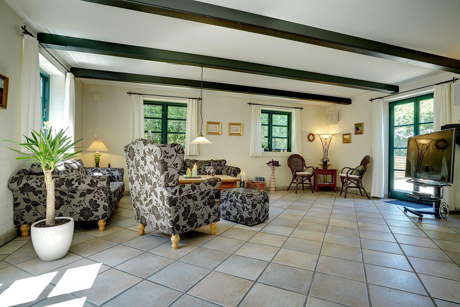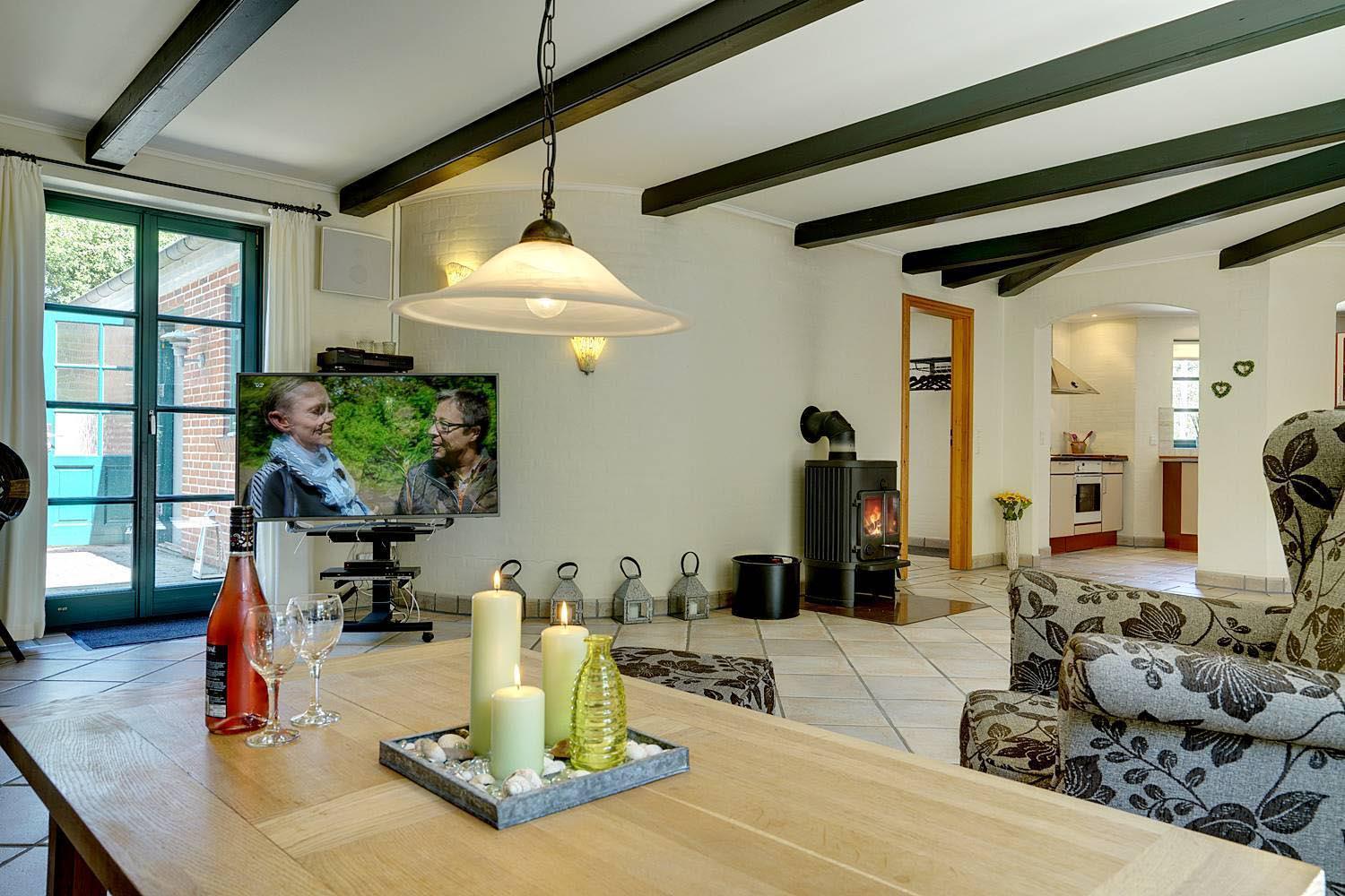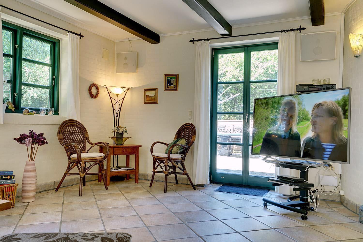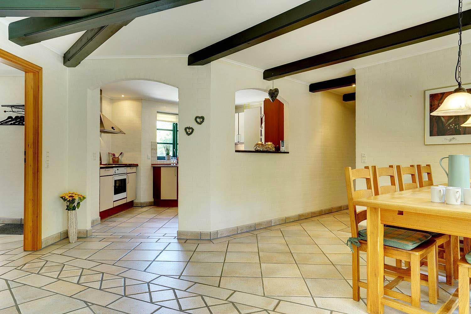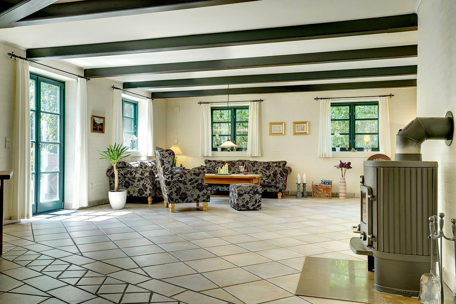 Badeværelse med spa for de ømme muskler. Ekstra toilet. Huset har gulvvarme overalt. Vaskerum med vaskemaskine og tørretumbler, samt bryggers. Grunden er velbeplantet og med høre træer. Stor gårdsplads og carport. Sandkasse på terrassen og gynger på grunden. Huset har synlige bjælker i loftet, der er med til at skabe stemning sammen med de hyggelige 'bondevinduer'. Læfuld terrasse med hygge.
