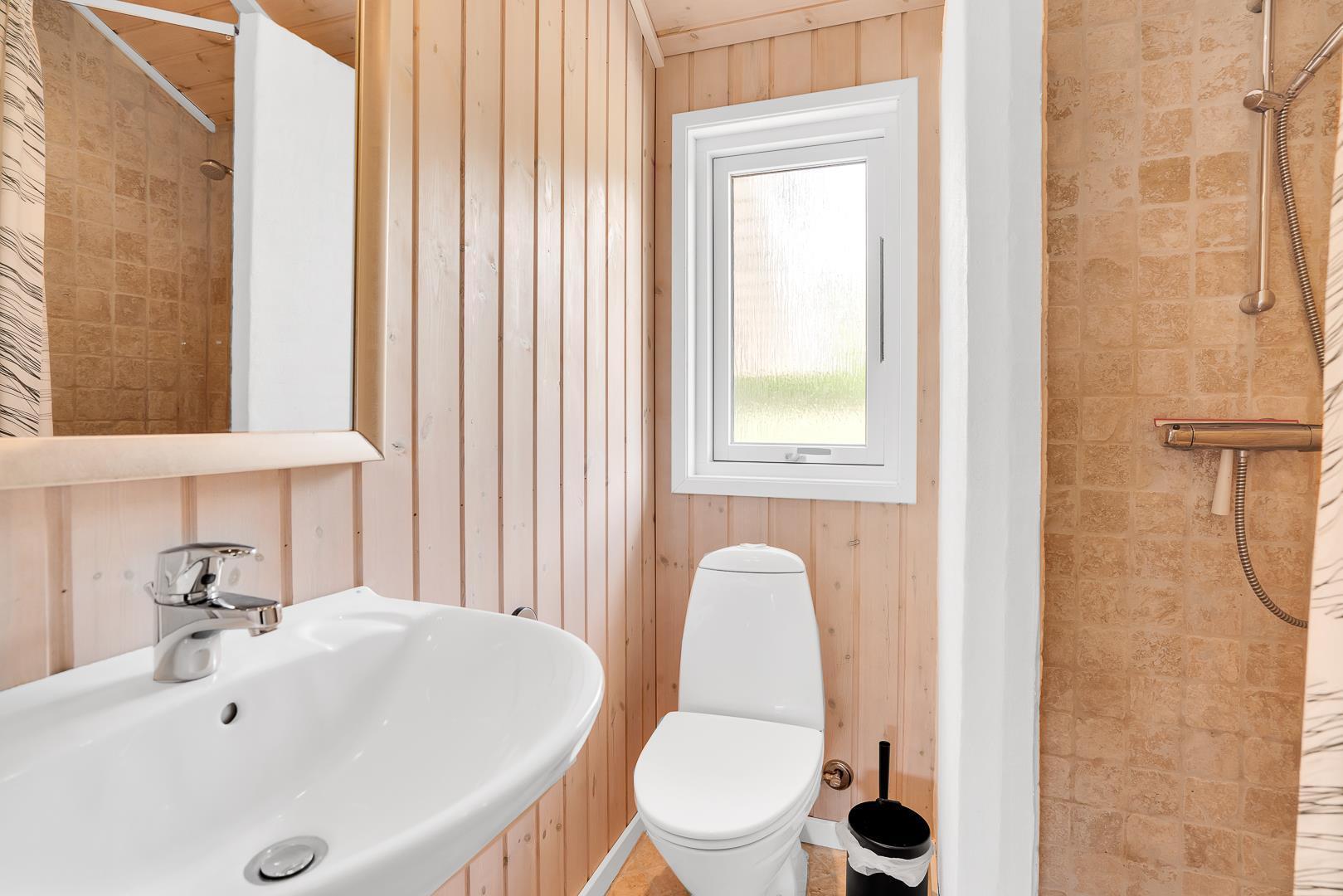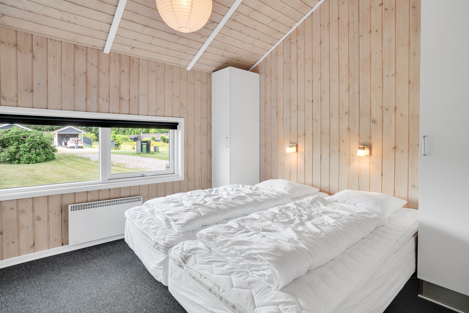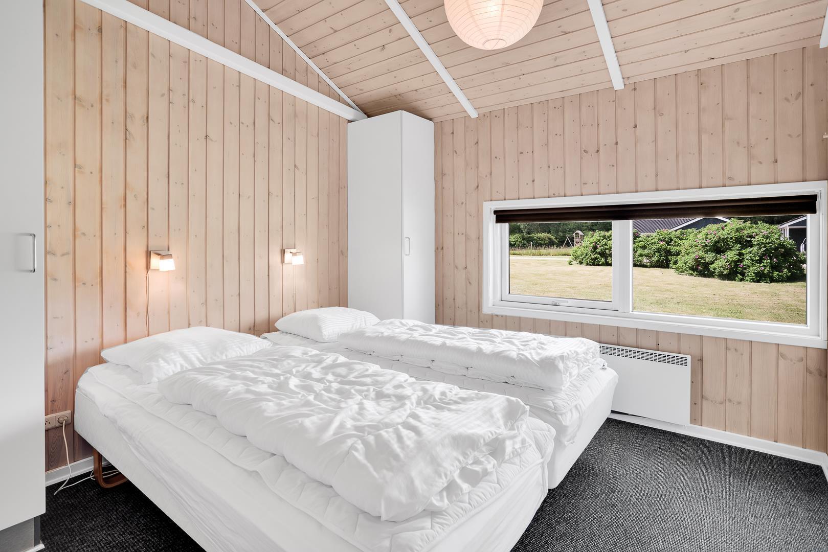 Sommerhuset har tre gode soveværelser – to med dobbeltsenge og ét med to enkeltsenge – og to flotte badeværelser med bruser og gulvvarme. I det ene badeværelse finder I både spa og sauna, så I kan nyde ægte wellness efter en aktiv dag i naturen.