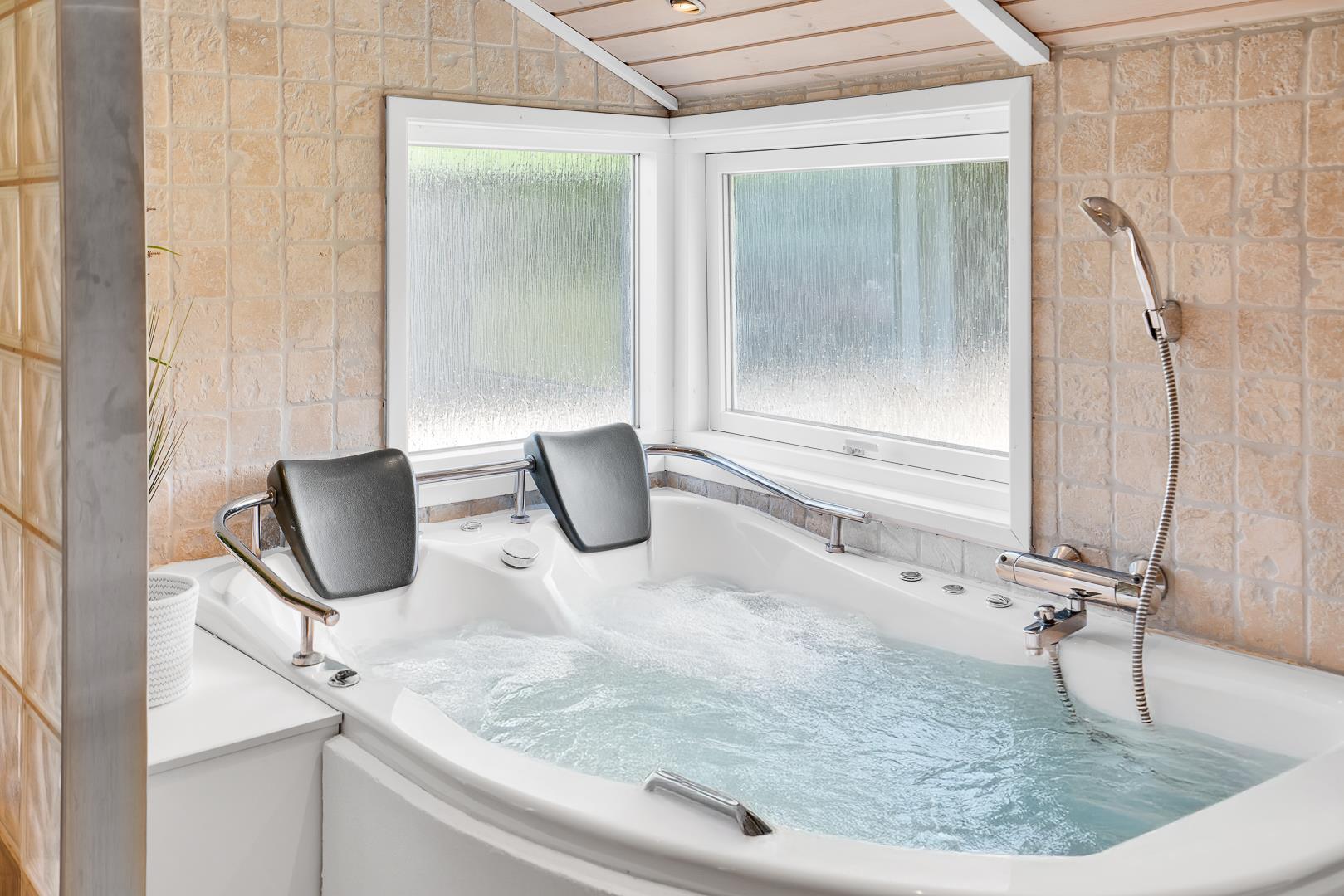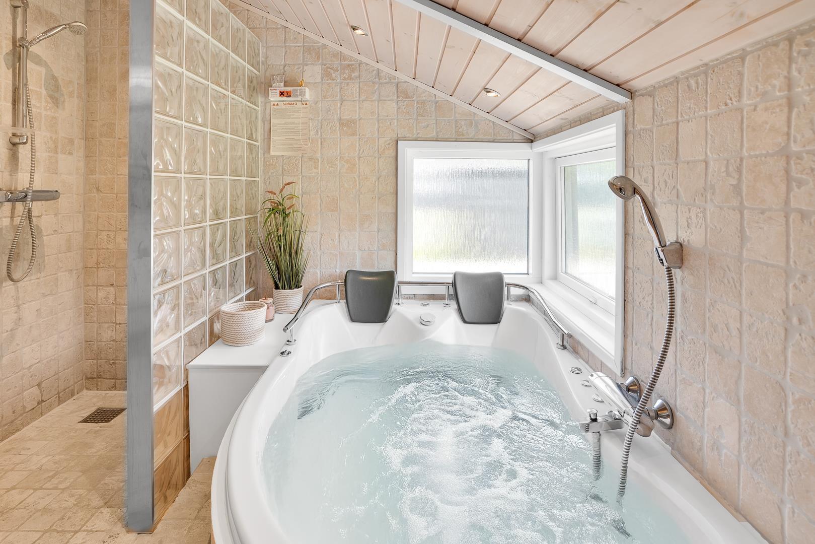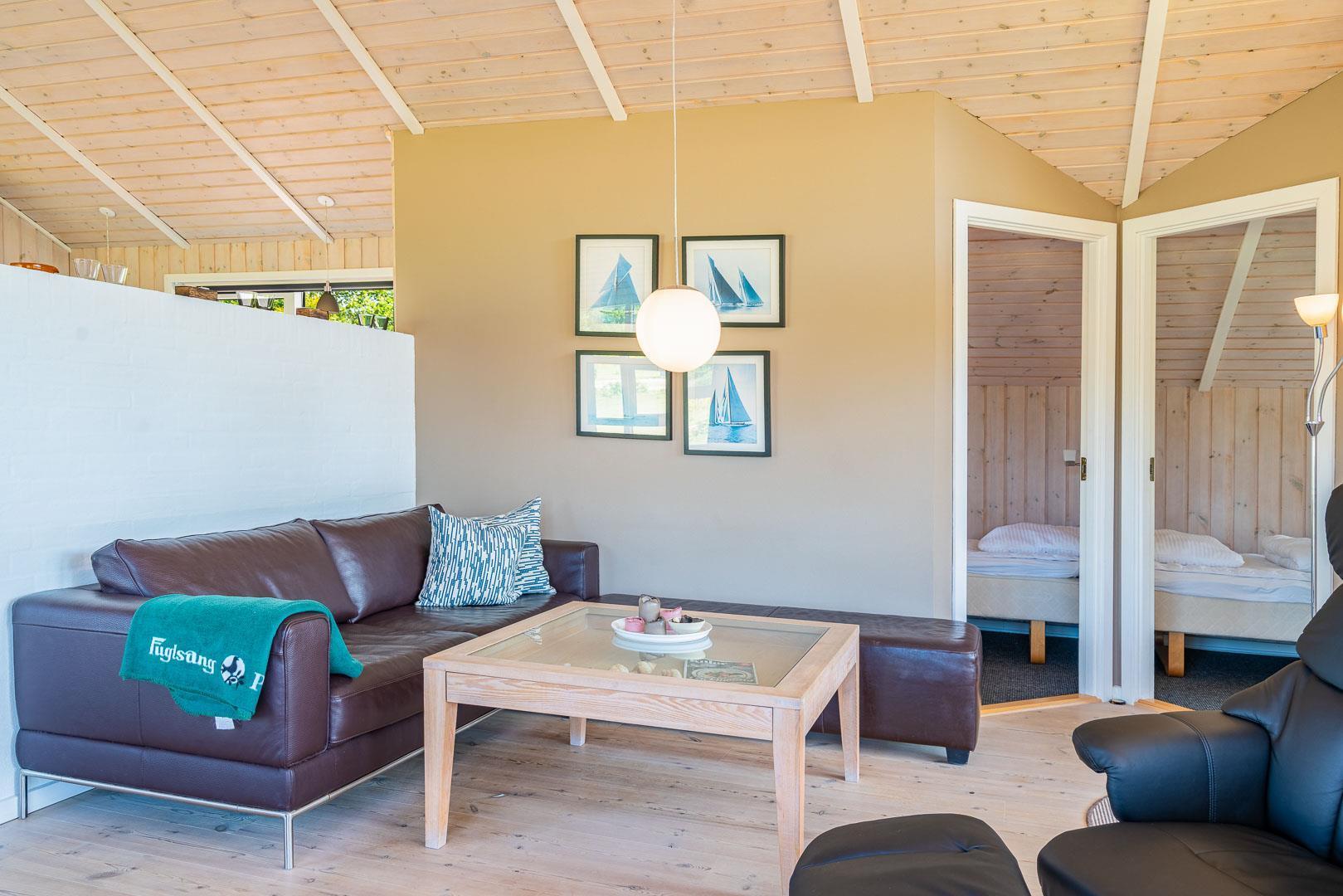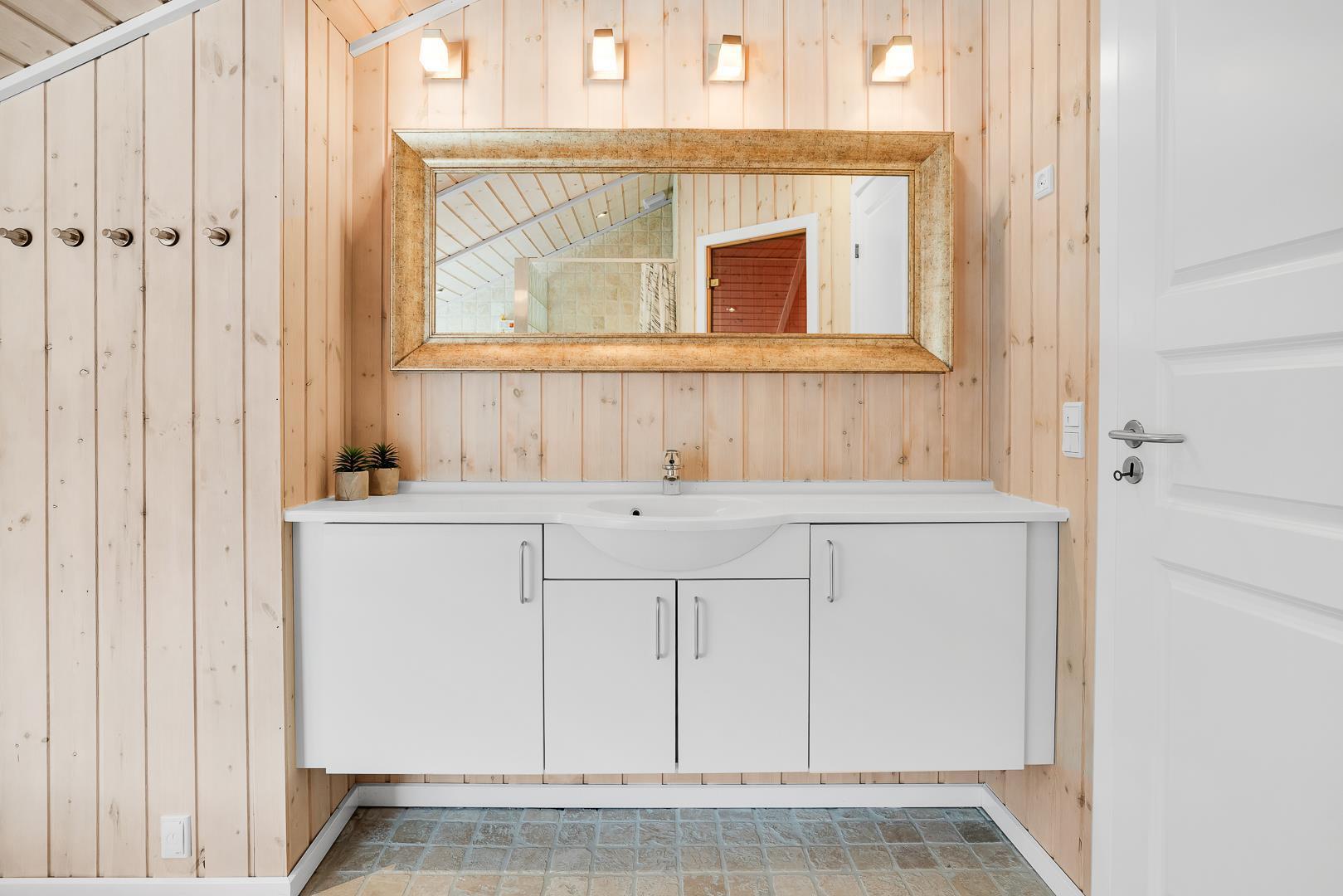 Sommerhuset har tre gode soveværelser – to med dobbeltsenge og ét med to enkeltsenge – og to flotte badeværelser med bruser og gulvvarme. I det ene badeværelse finder I både spa og sauna, så I kan nyde ægte wellness efter en aktiv dag i naturen.