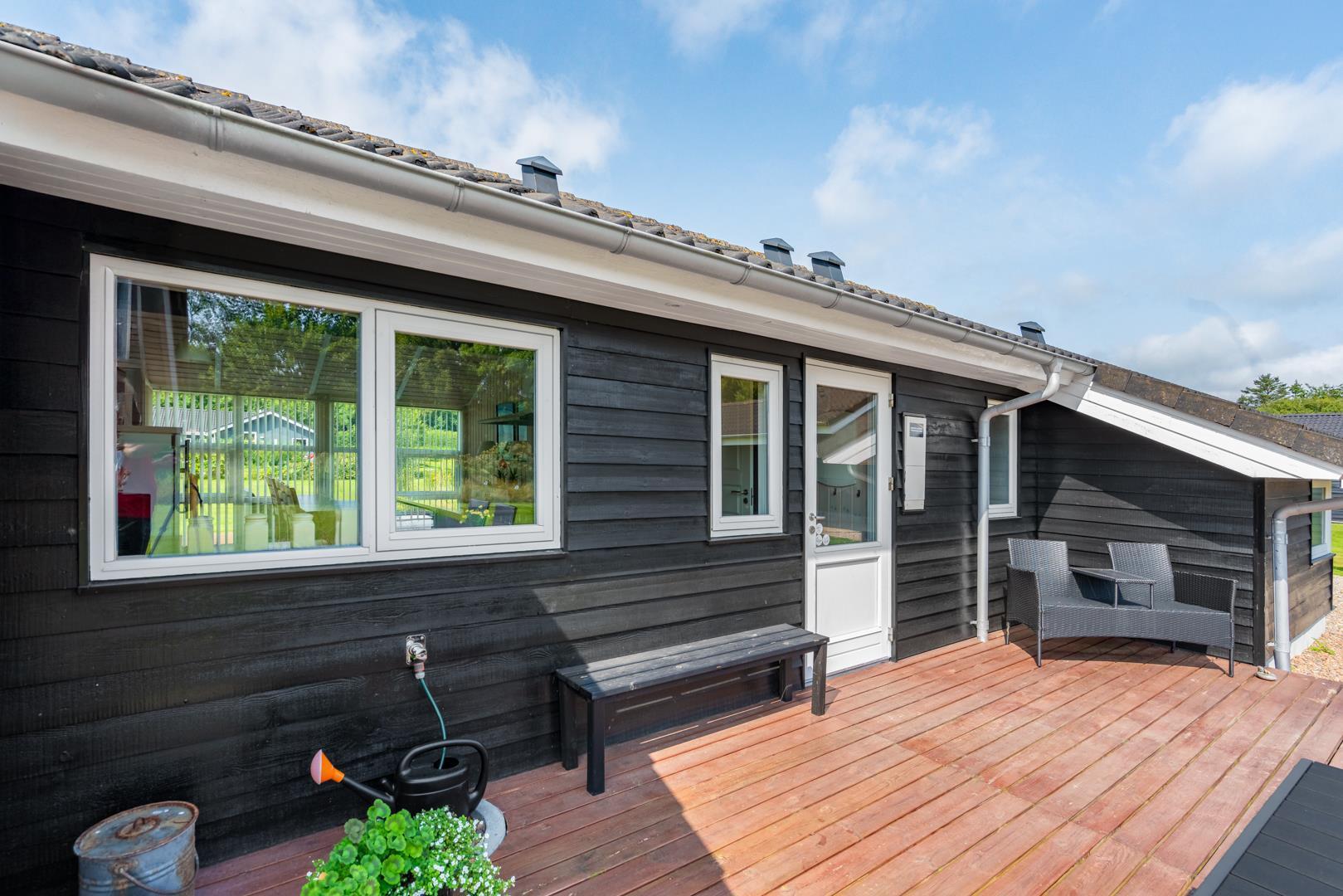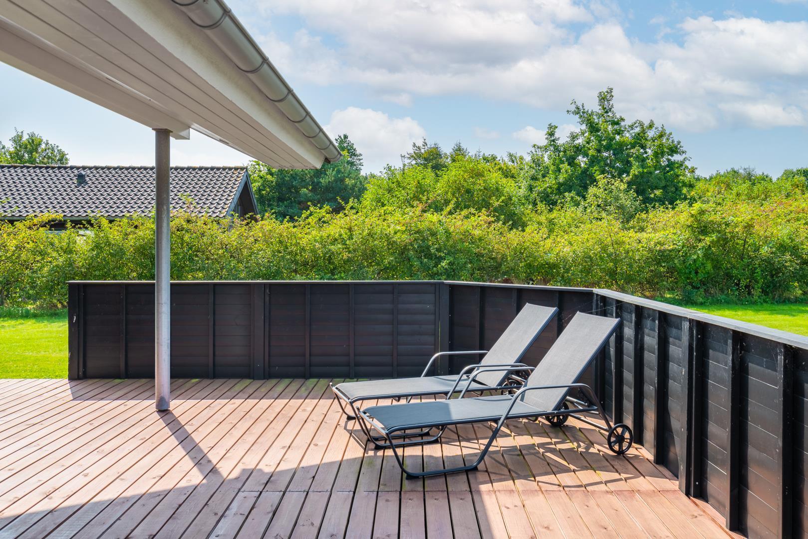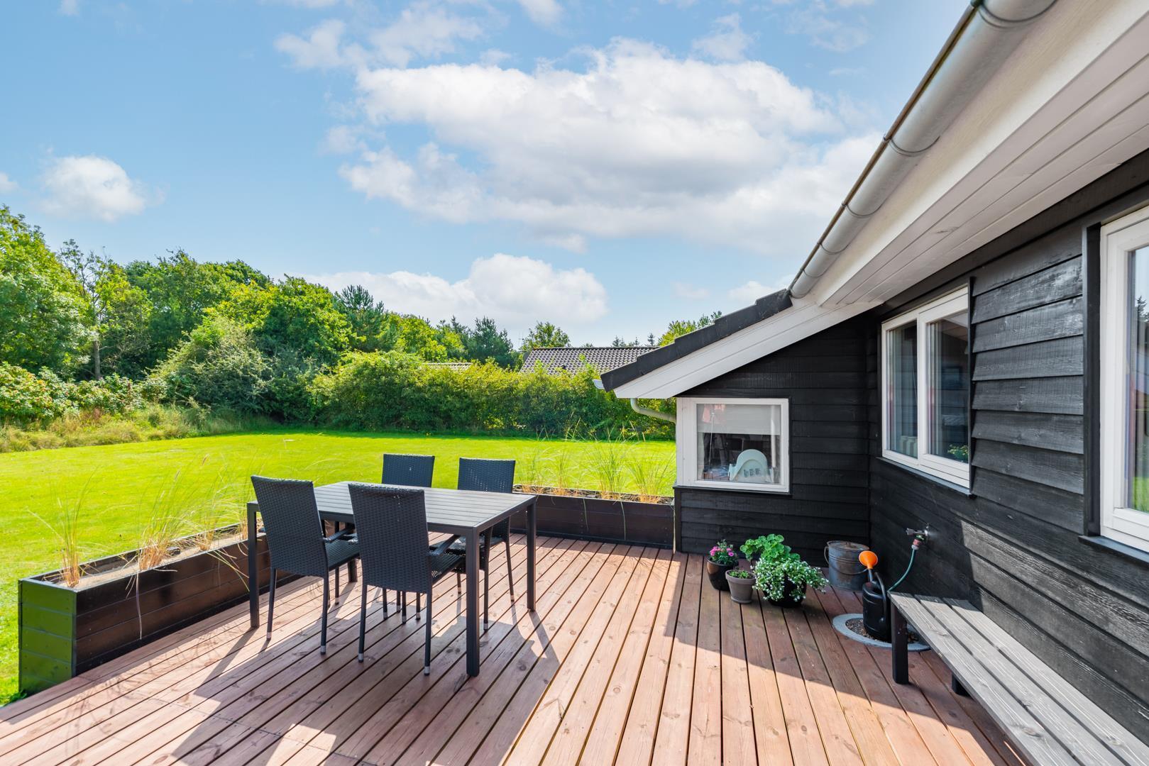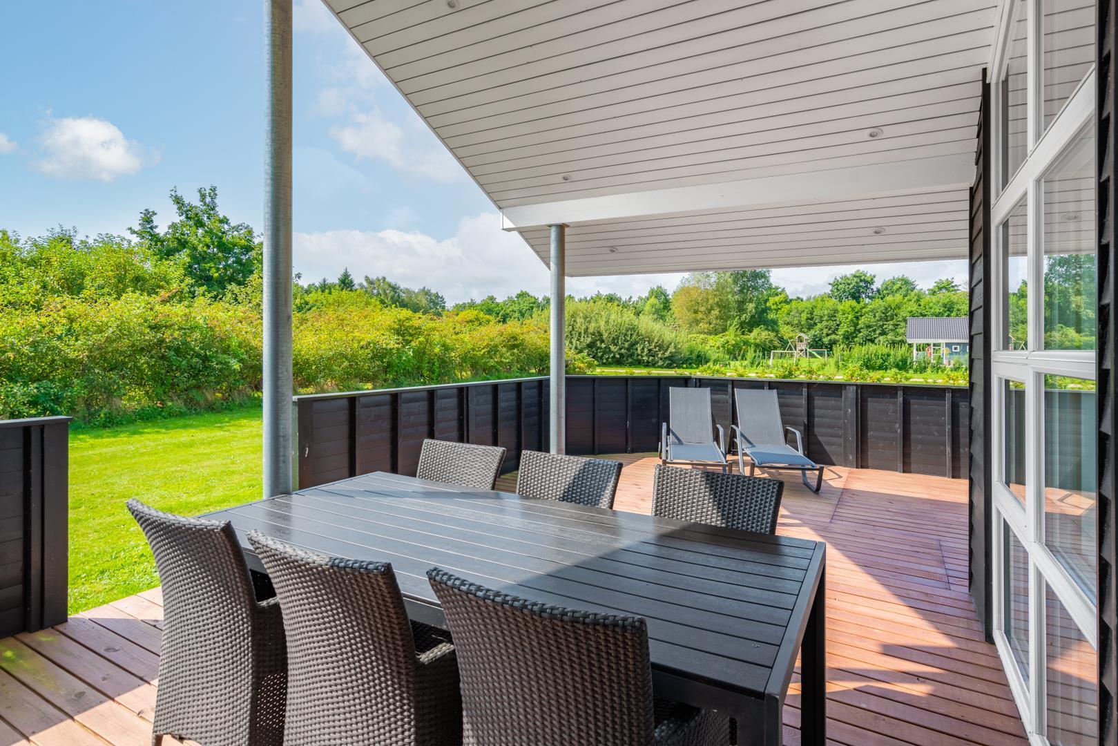 Udenfor kan I nyde den friske luft på den store, delvist overdækkede terrasse – perfekt til morgenkaffe i solen eller hyggelige aftener, selv hvis vejret skulle skifte.