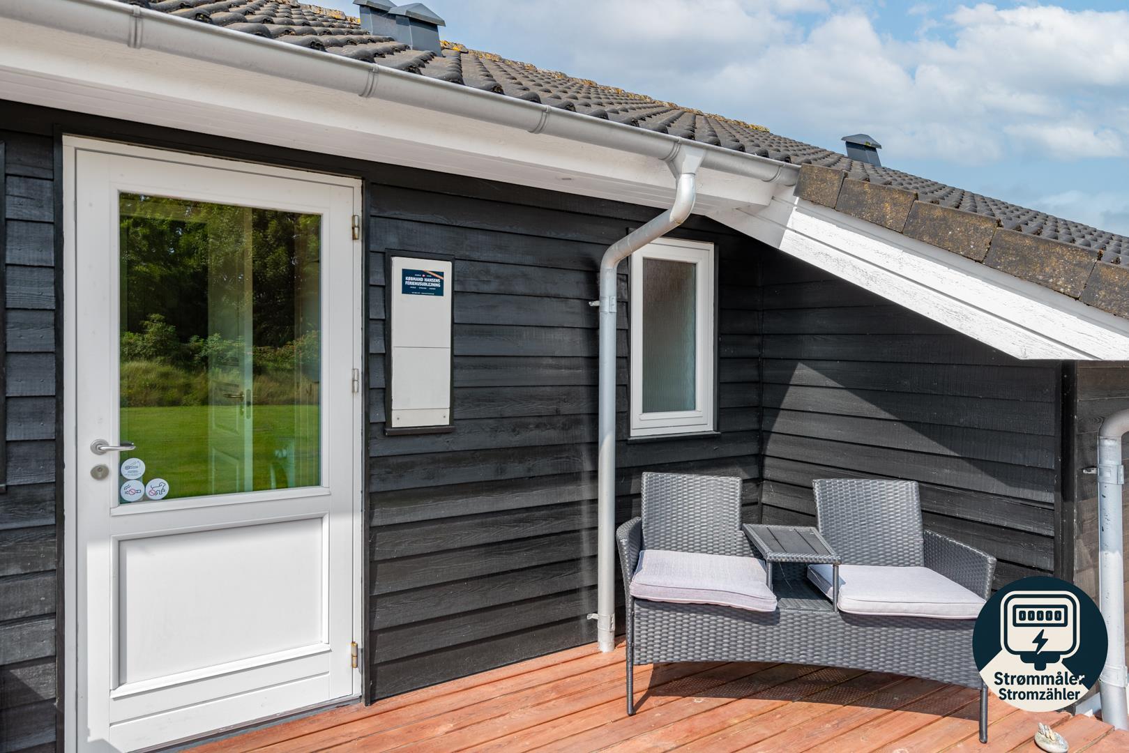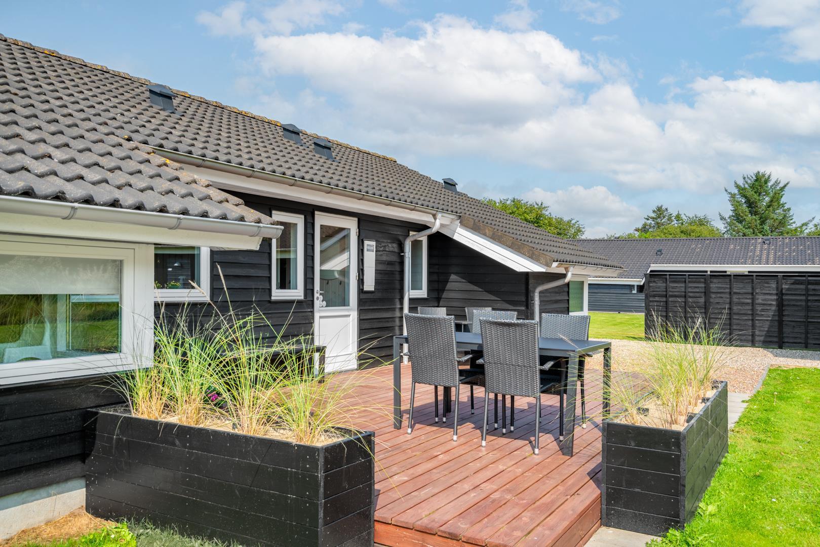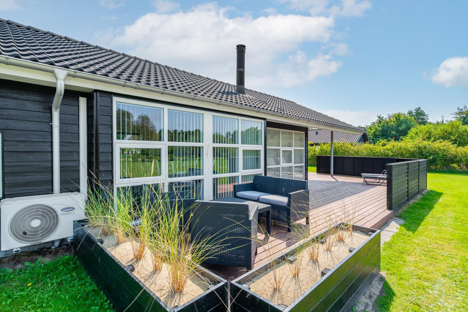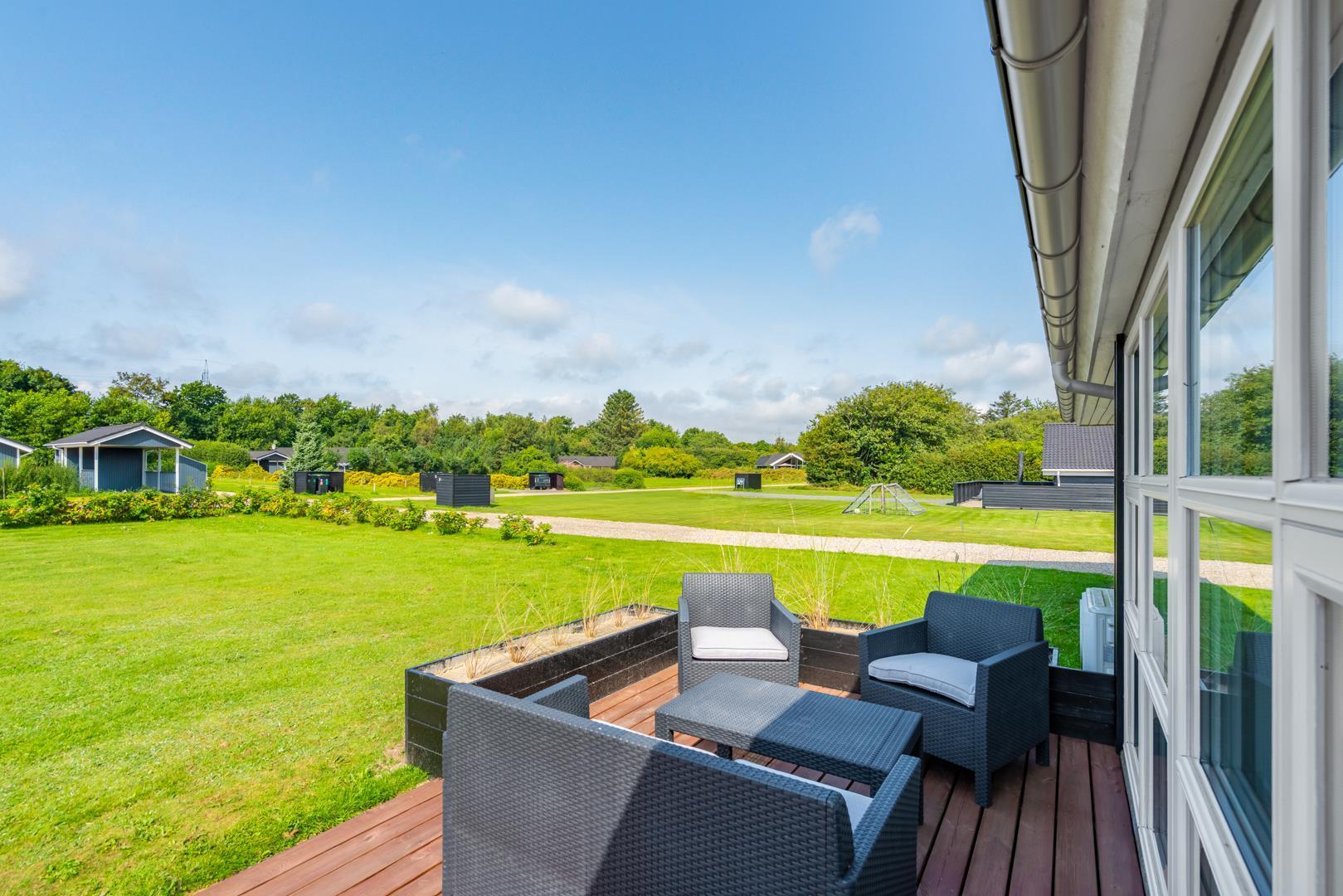 Udenfor kan I nyde den friske luft på den store, delvist overdækkede terrasse – perfekt til morgenkaffe i solen eller hyggelige aftener, selv hvis vejret skulle skifte.