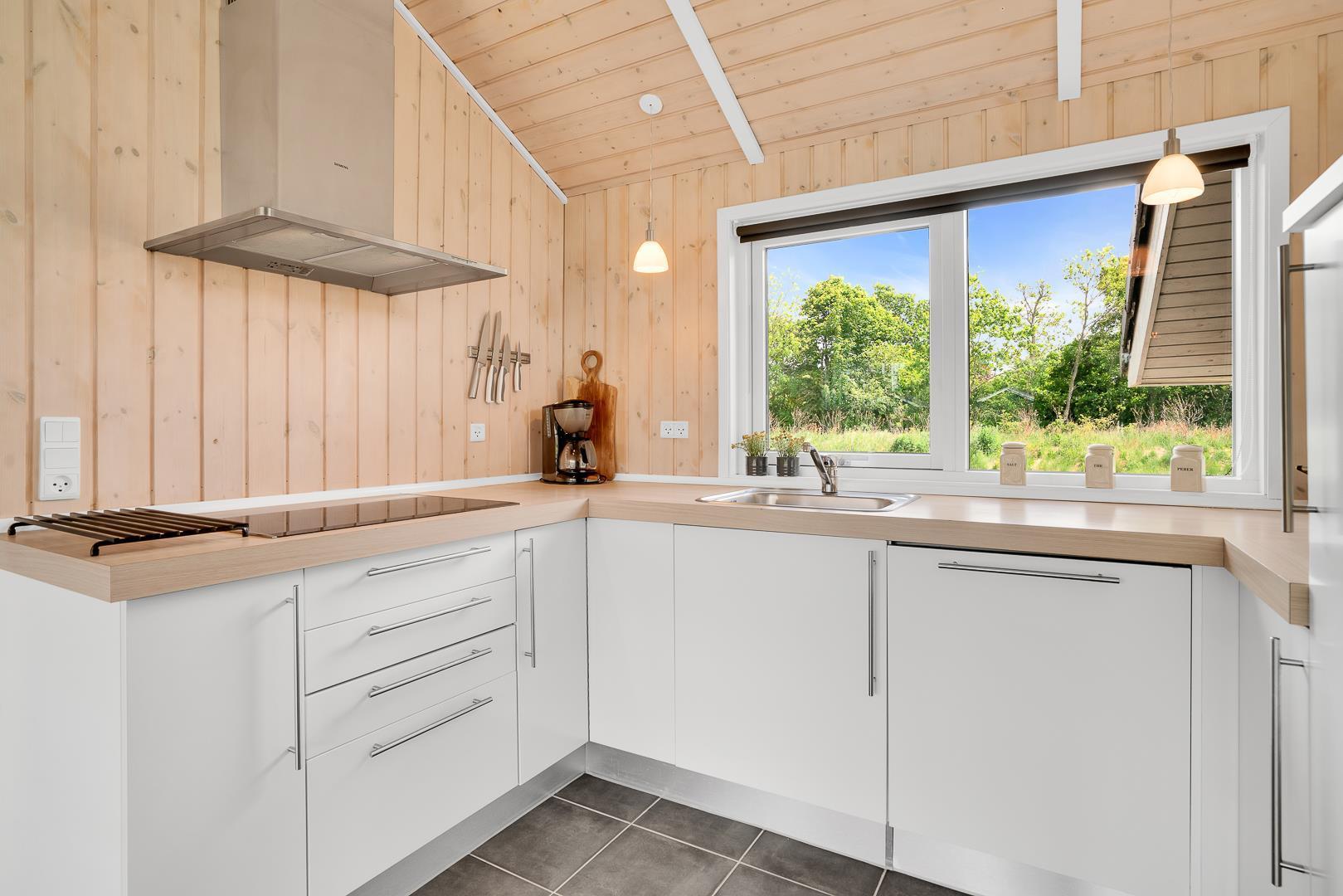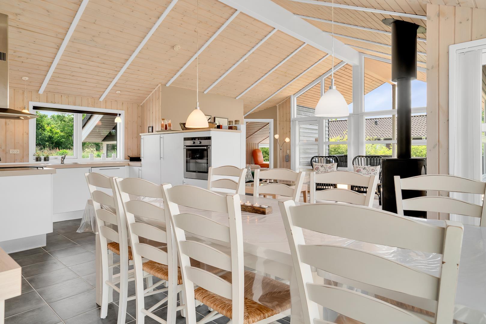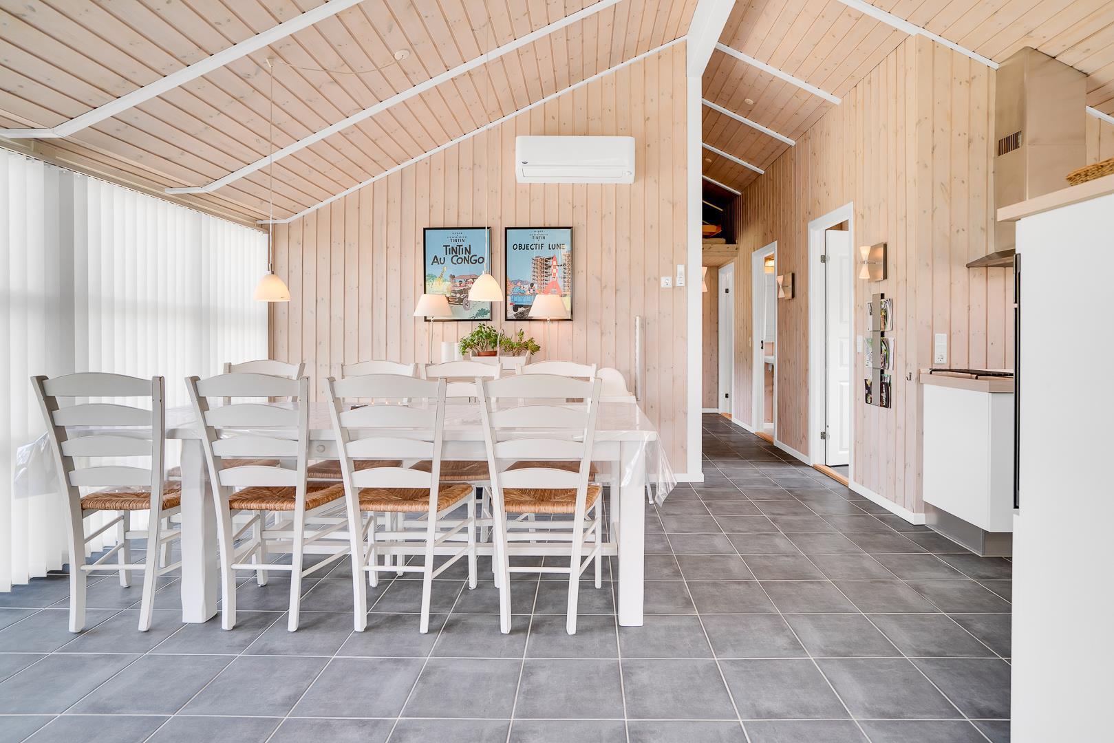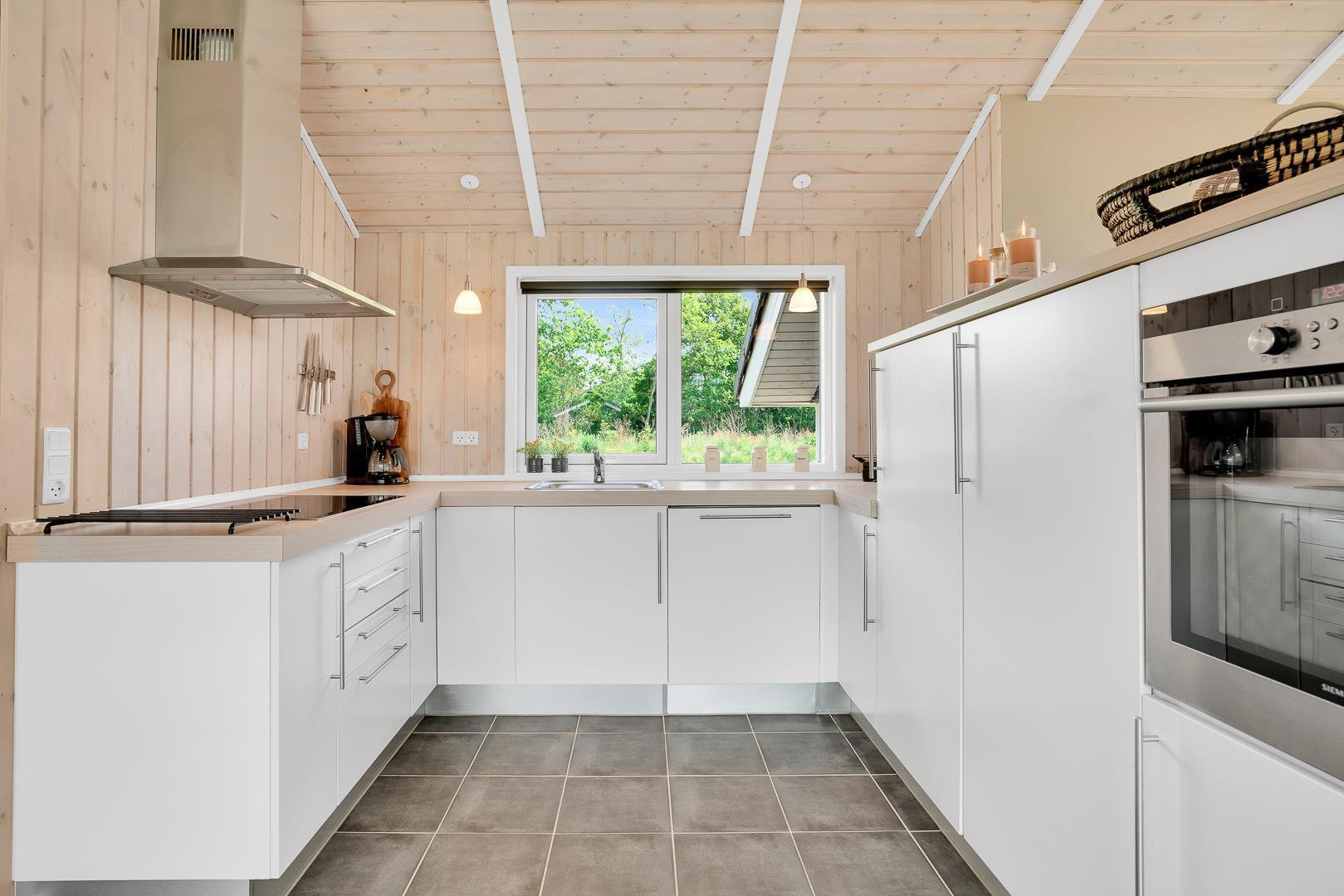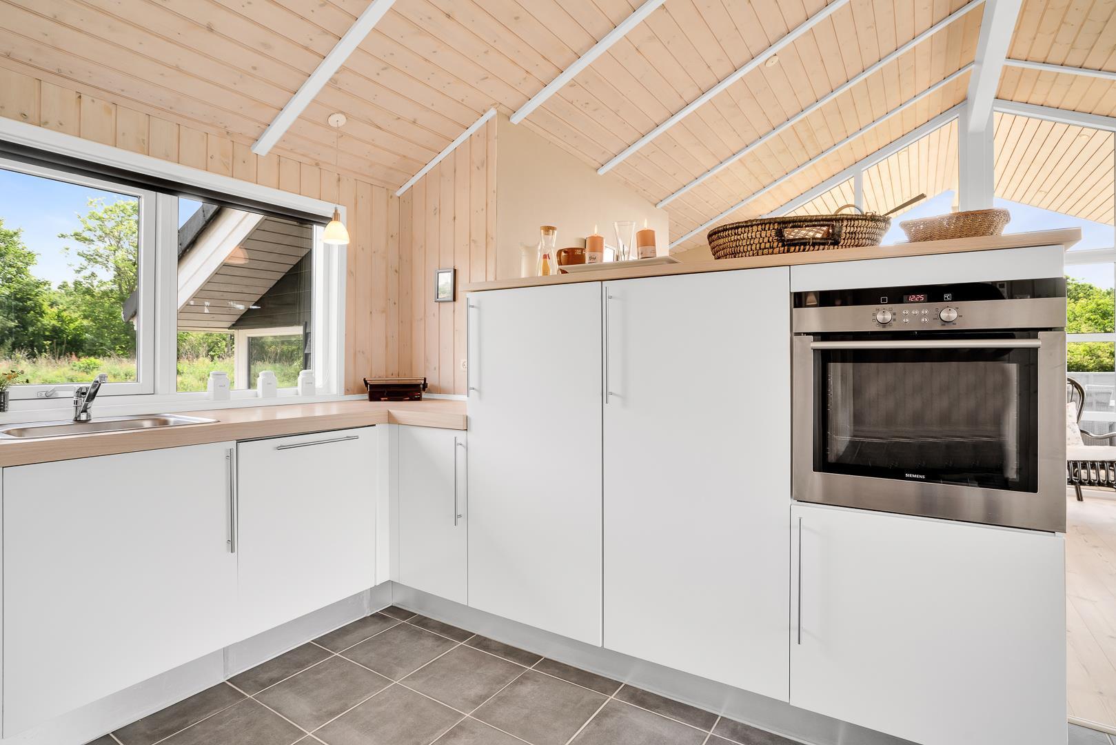 Det åbne køkken er moderne og veludstyret med opvaskemaskine og alt, hvad I skal bruge til feriens måltider. Både i køkkenet og på badeværelserne sørger gulvvarme for en behagelig temperatur hele året.