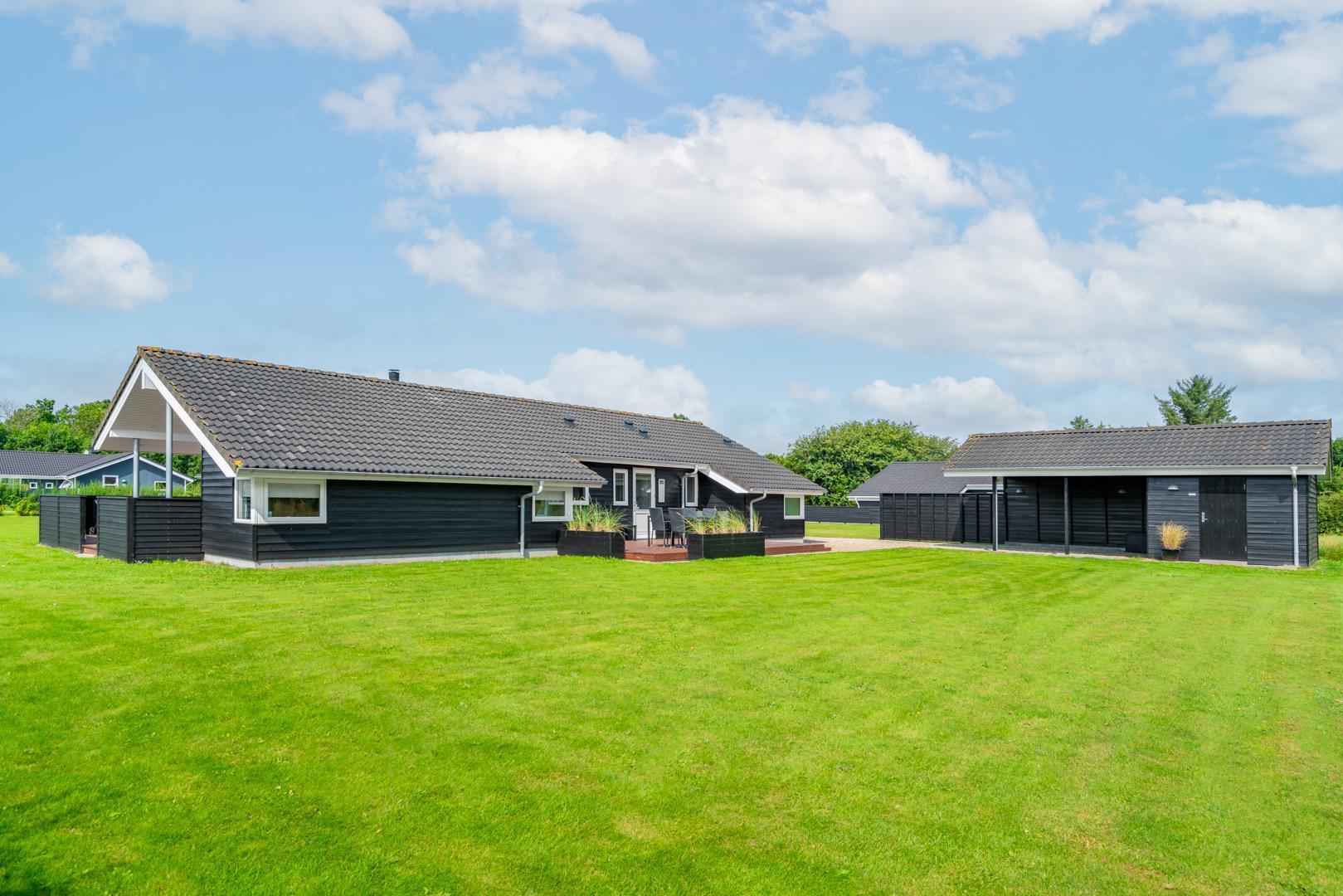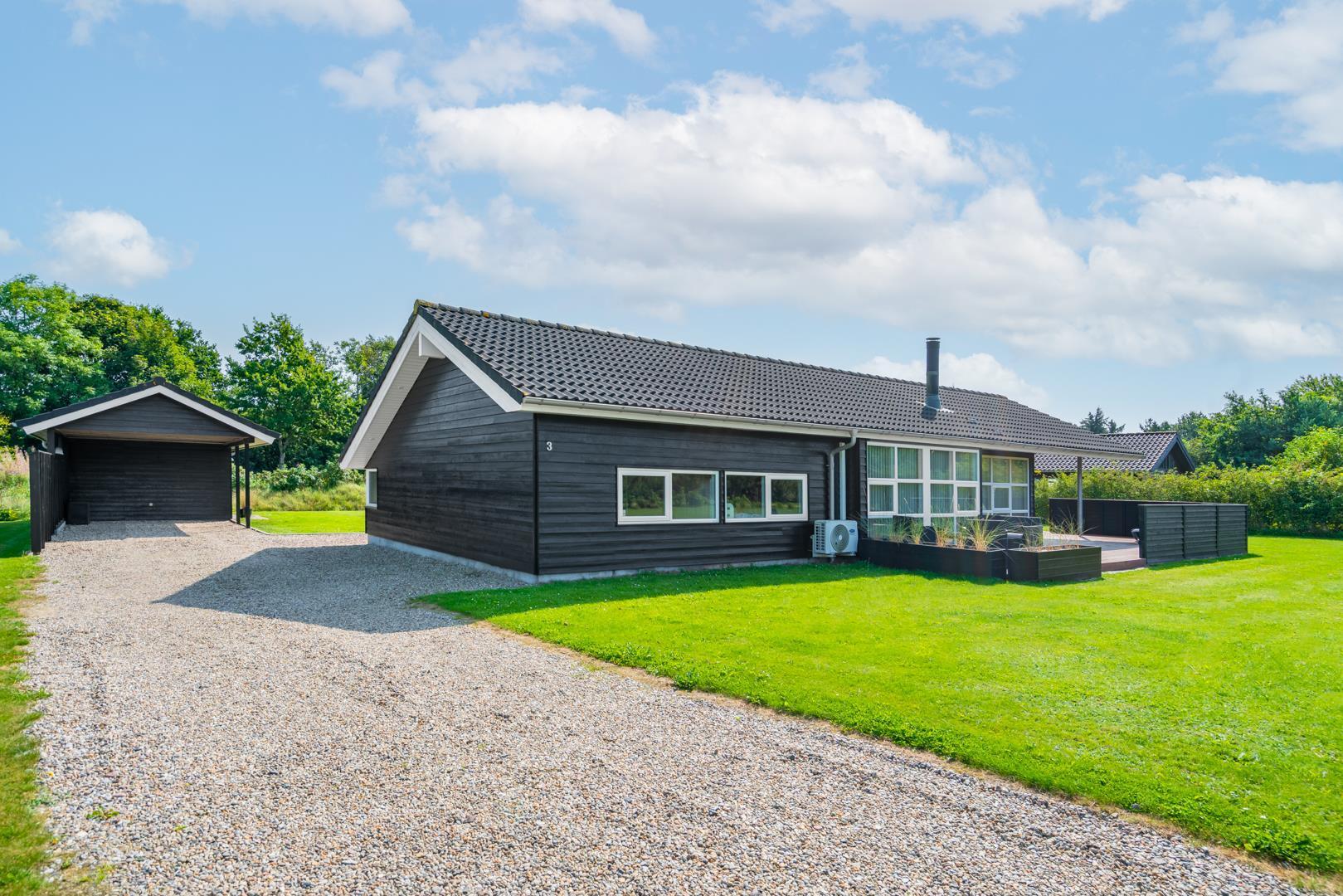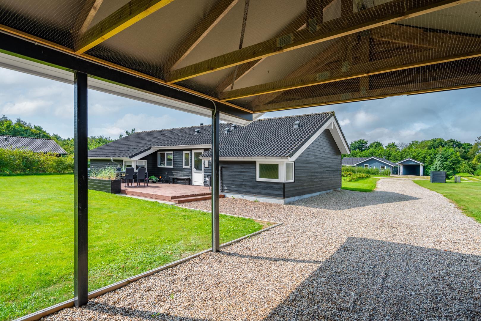 På grunden er der god plads til både leg og afslapning, og bilen kan stå tørt og beskyttet i carporten – en praktisk detalje hele året.