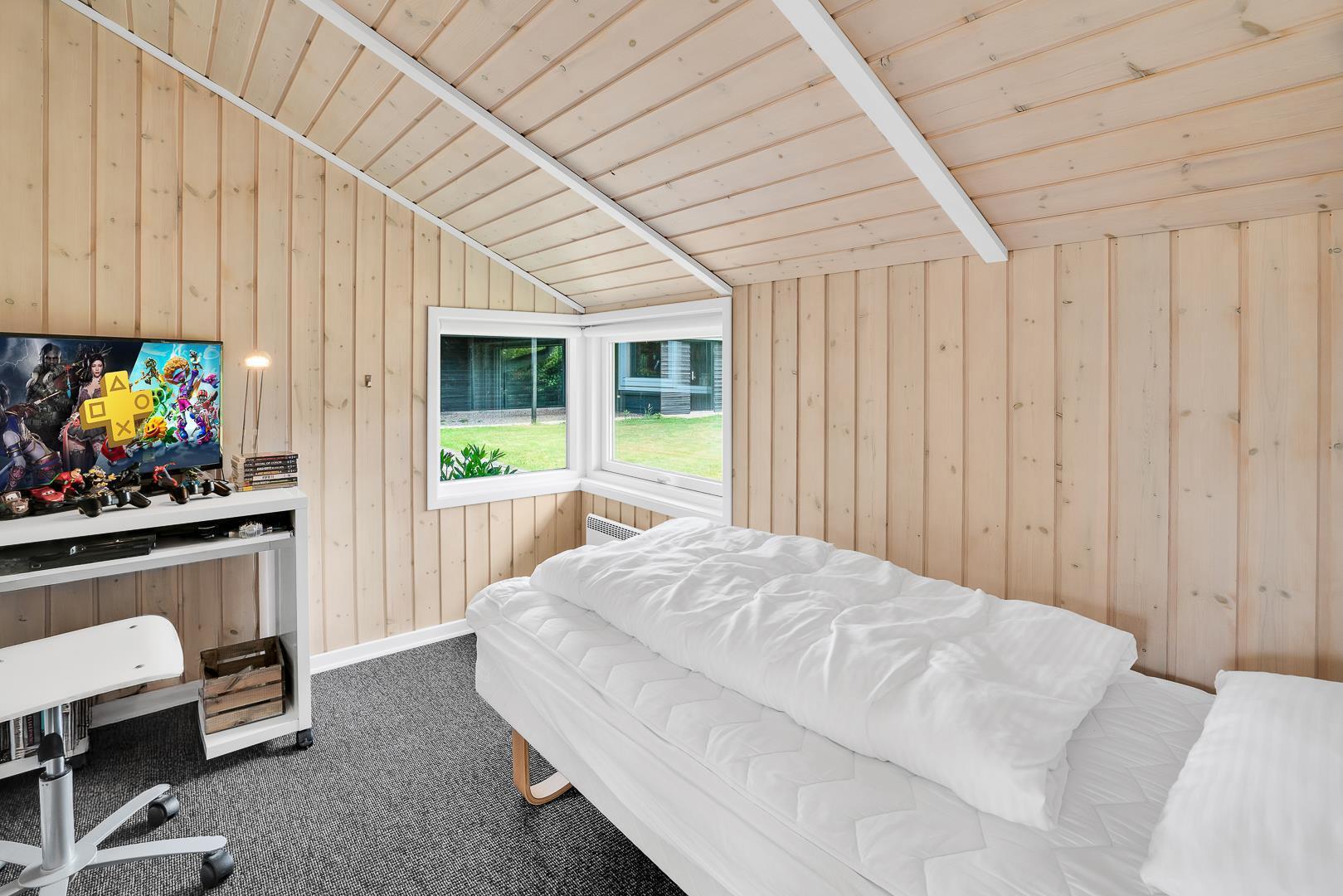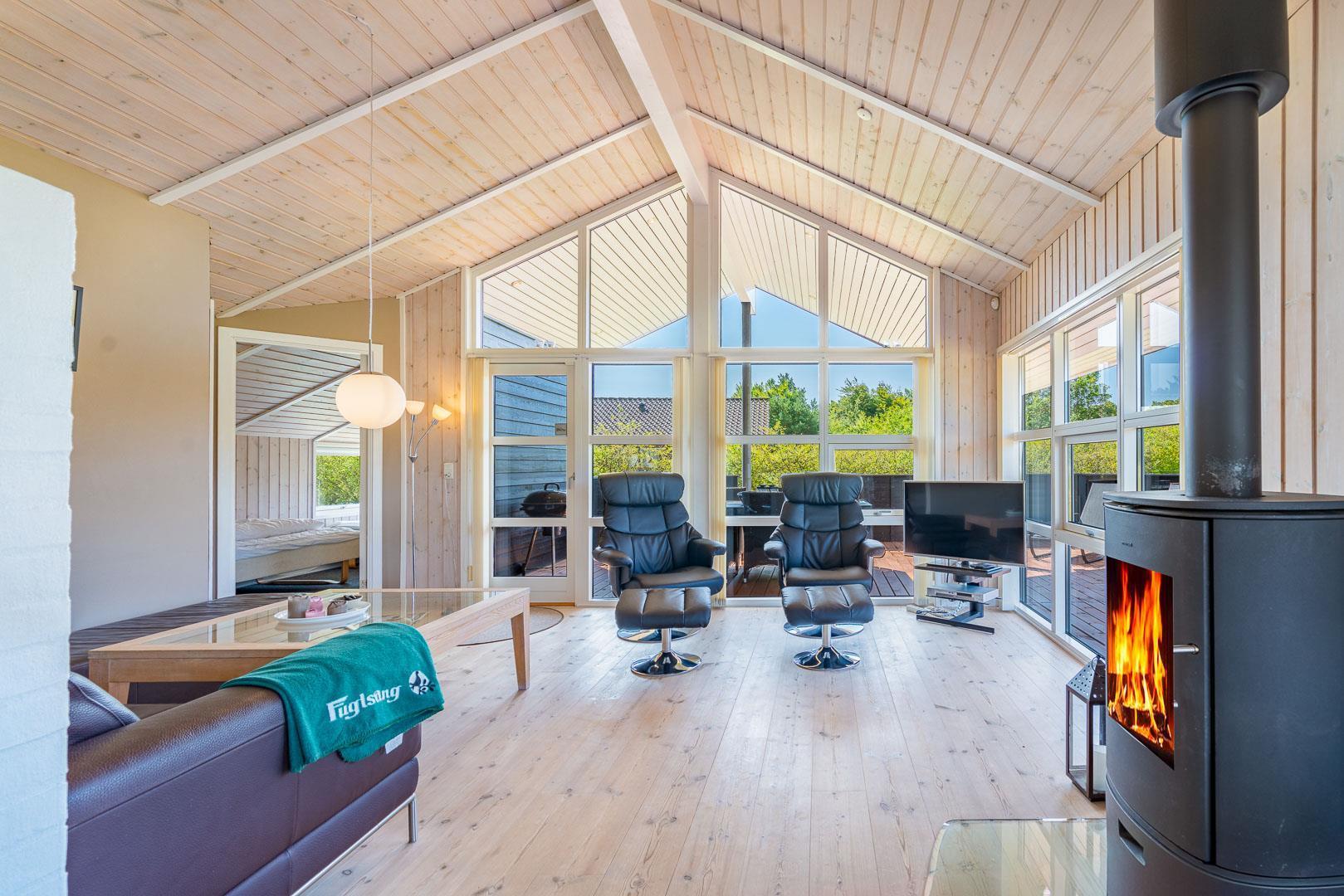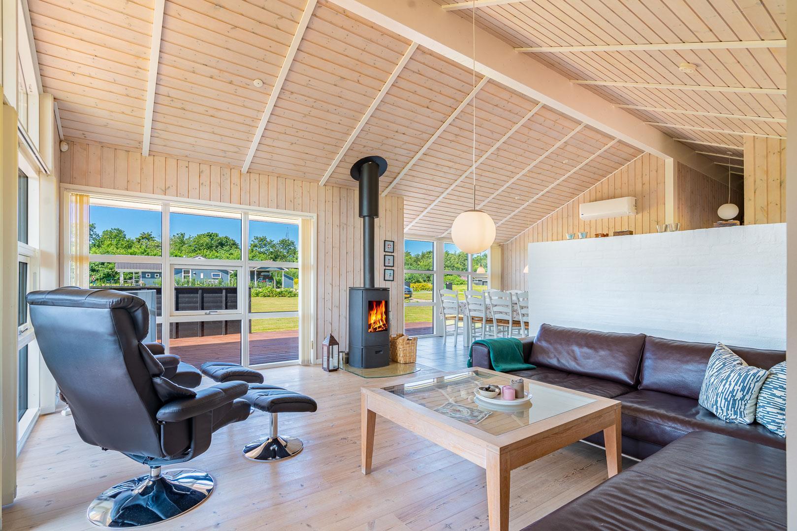 Sommerhuset kombinerer hygge, komfort og funktionalitet på bedste vis. Den lyse stue indbyder til afslappende timer foran brændeovnen, og med både Chromecast, varmepumpe og spillekonsol er der underholdning for både børn og voksne – uanset årstid.
