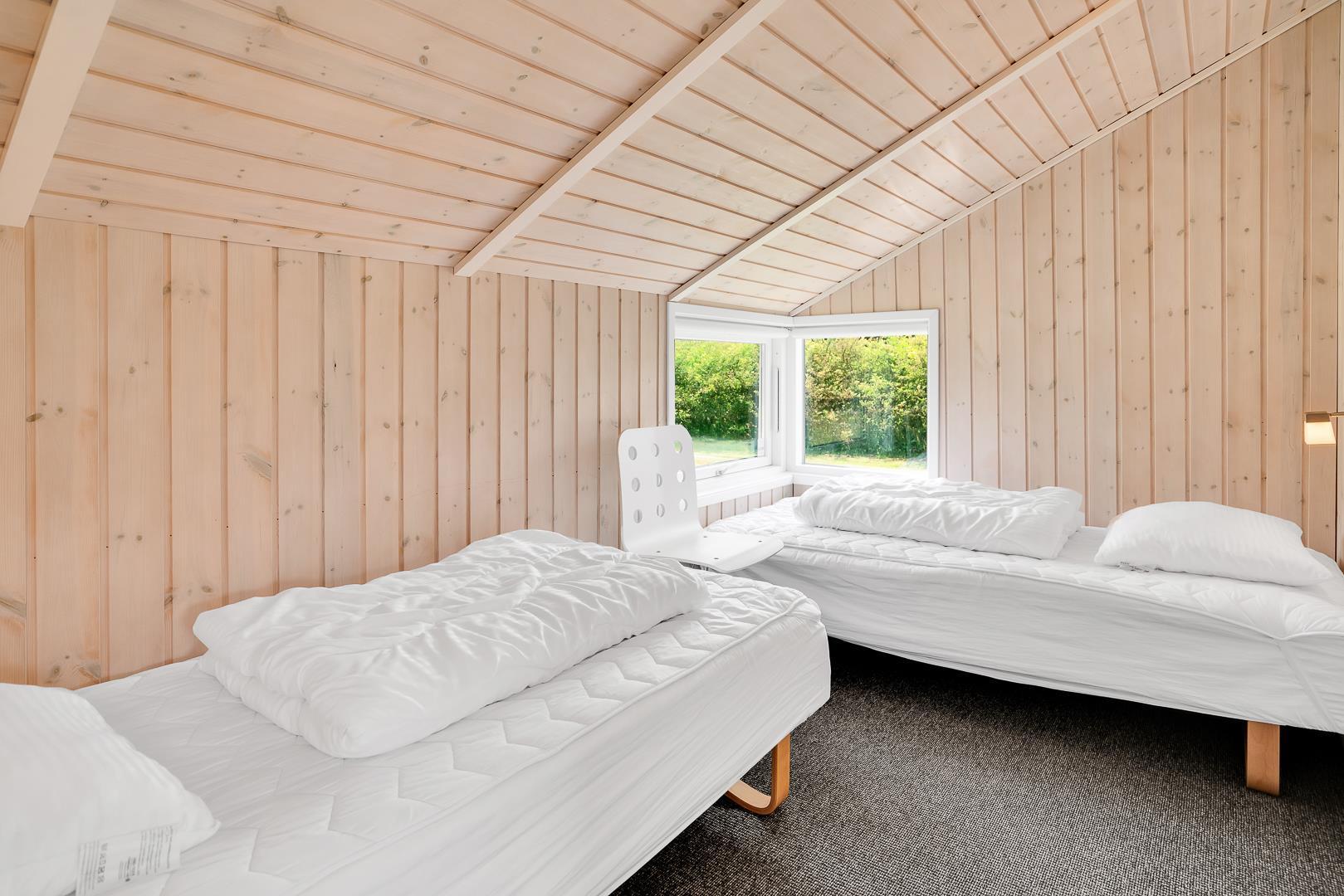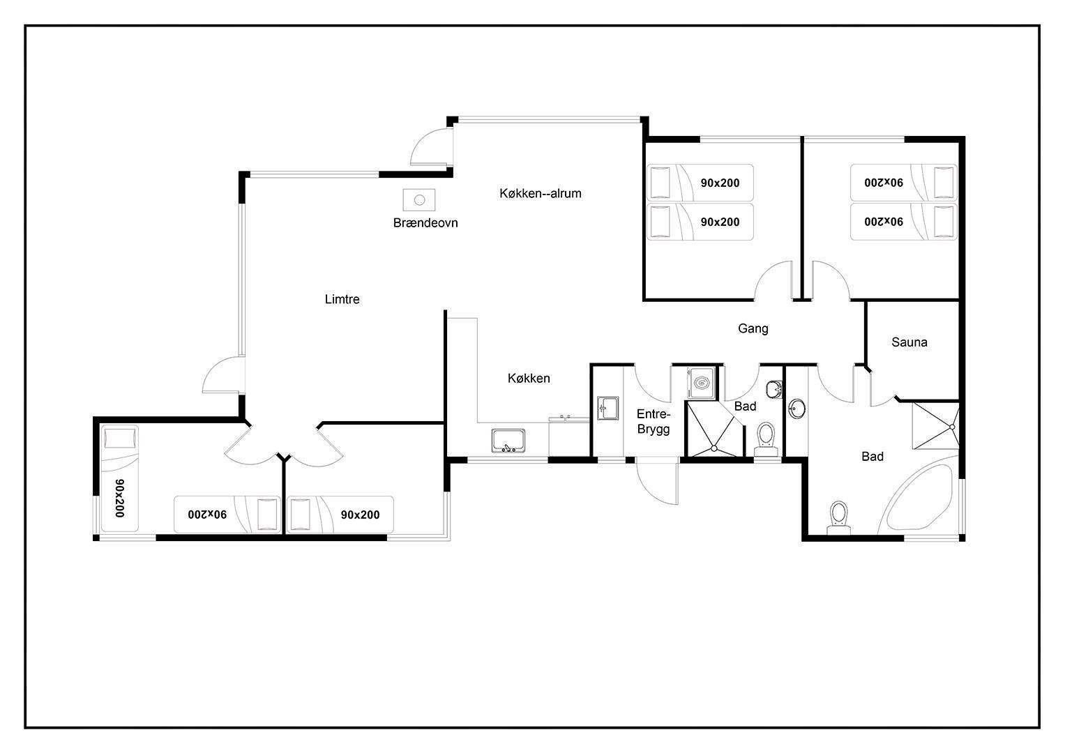 Sengestørrelse: 2 dobbeltsenge (hver med 2 madrasser á 90x200 cm) + 2 enkeltsenge (90x200 cm).
