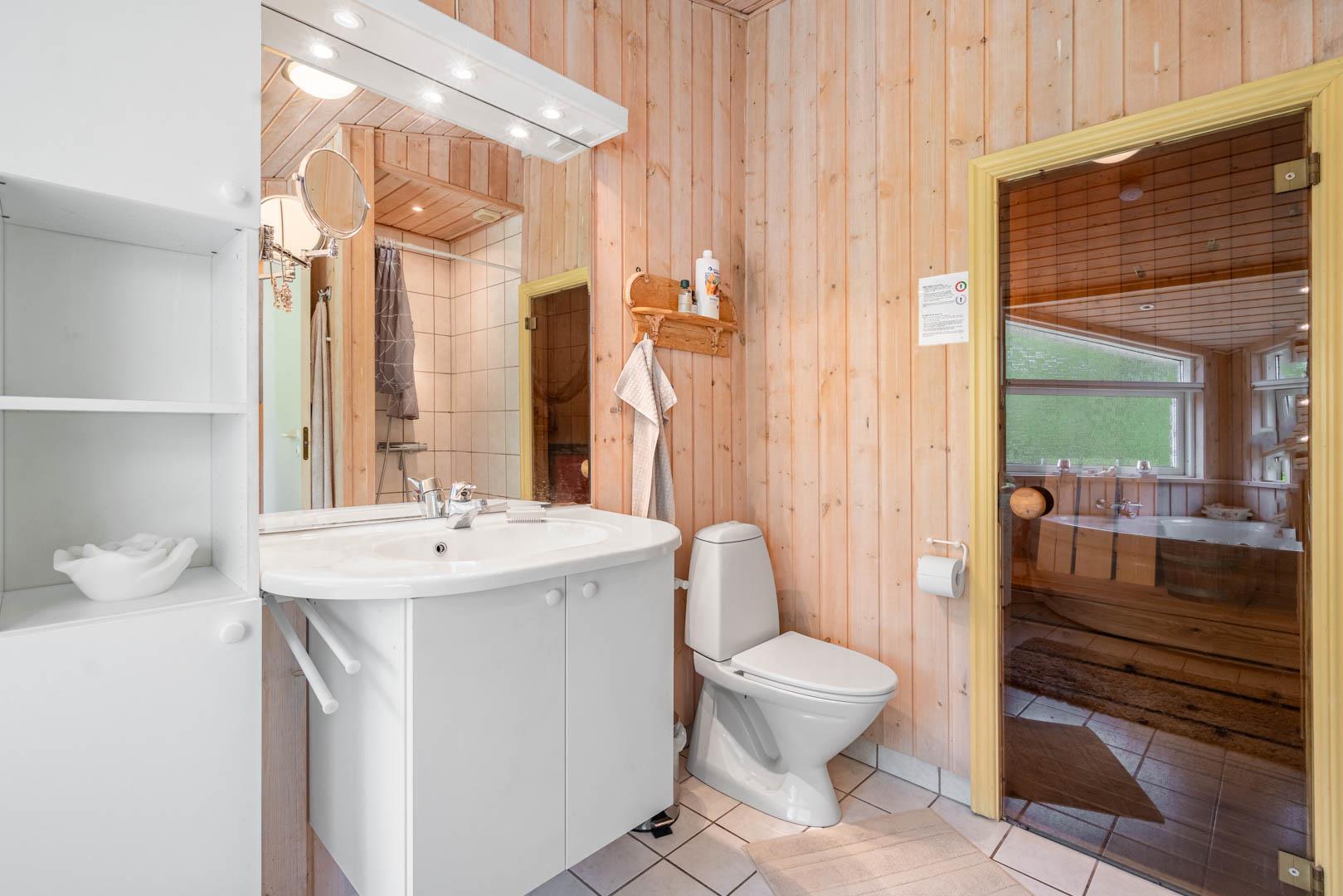 Sommerhuset har tre gode soveværelser: ét med dobbeltseng og to med hver to enkeltsenge – perfekt til børnefamilien. Badeværelset er moderne og byder på både spa og sauna – et lille wellness-paradis efter en dag i den friske luft.