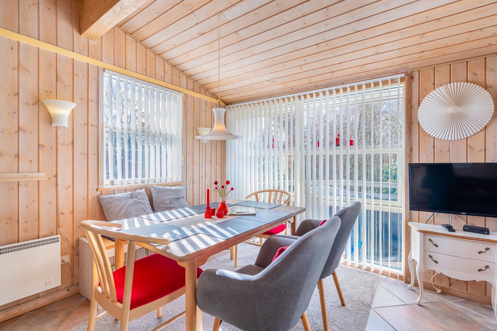 Det lyse og venlige opholdsrum indbyder til hygge. Nyd varmen fra brændeovnen på kølige dage, eller lad varmepumpen sørge for et behageligt indeklima året rundt.