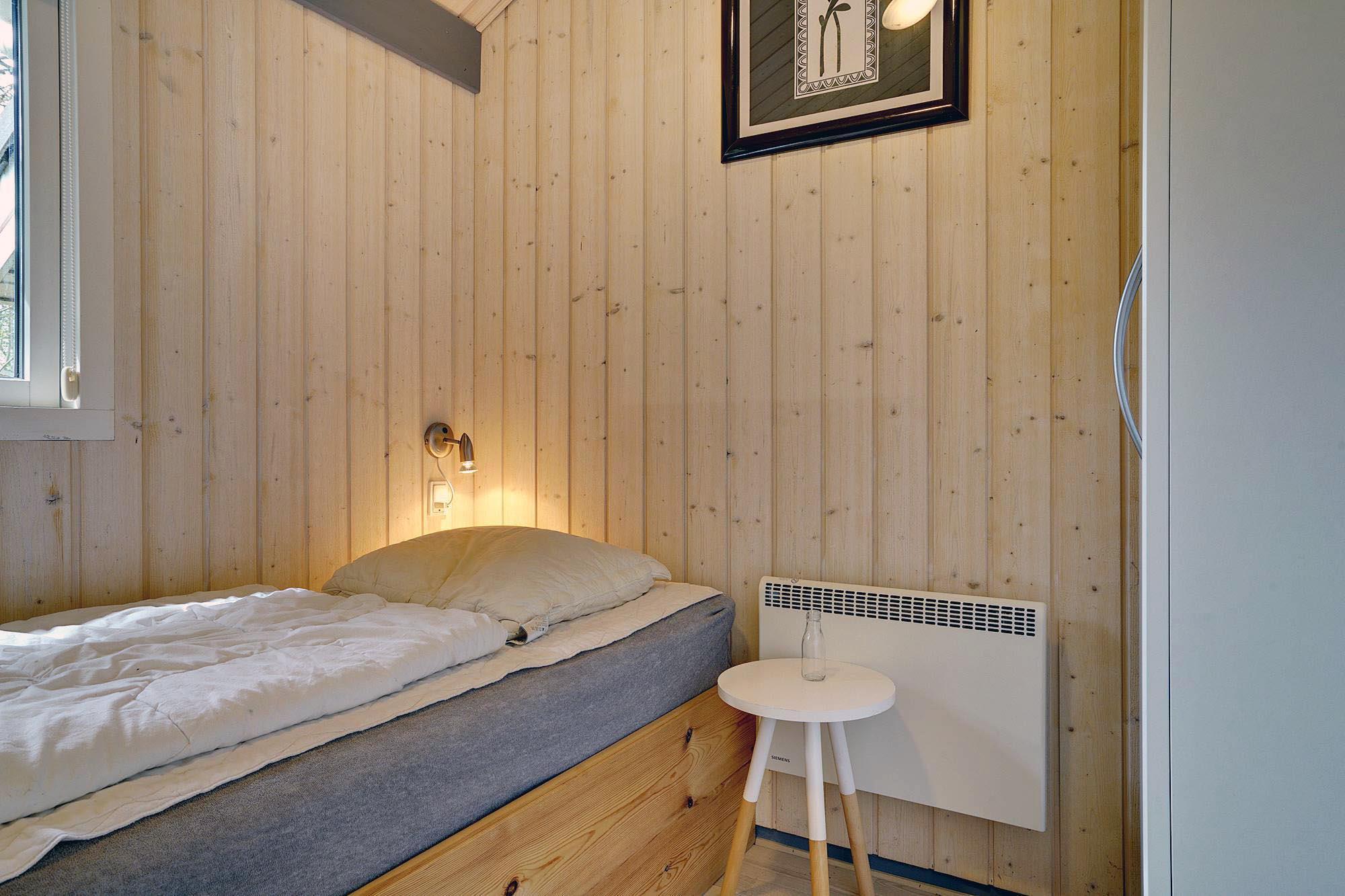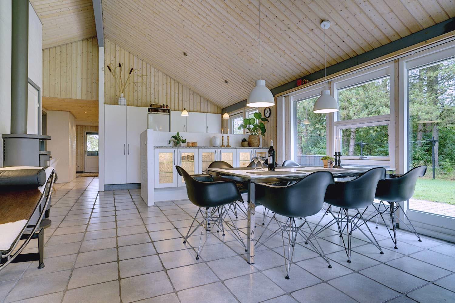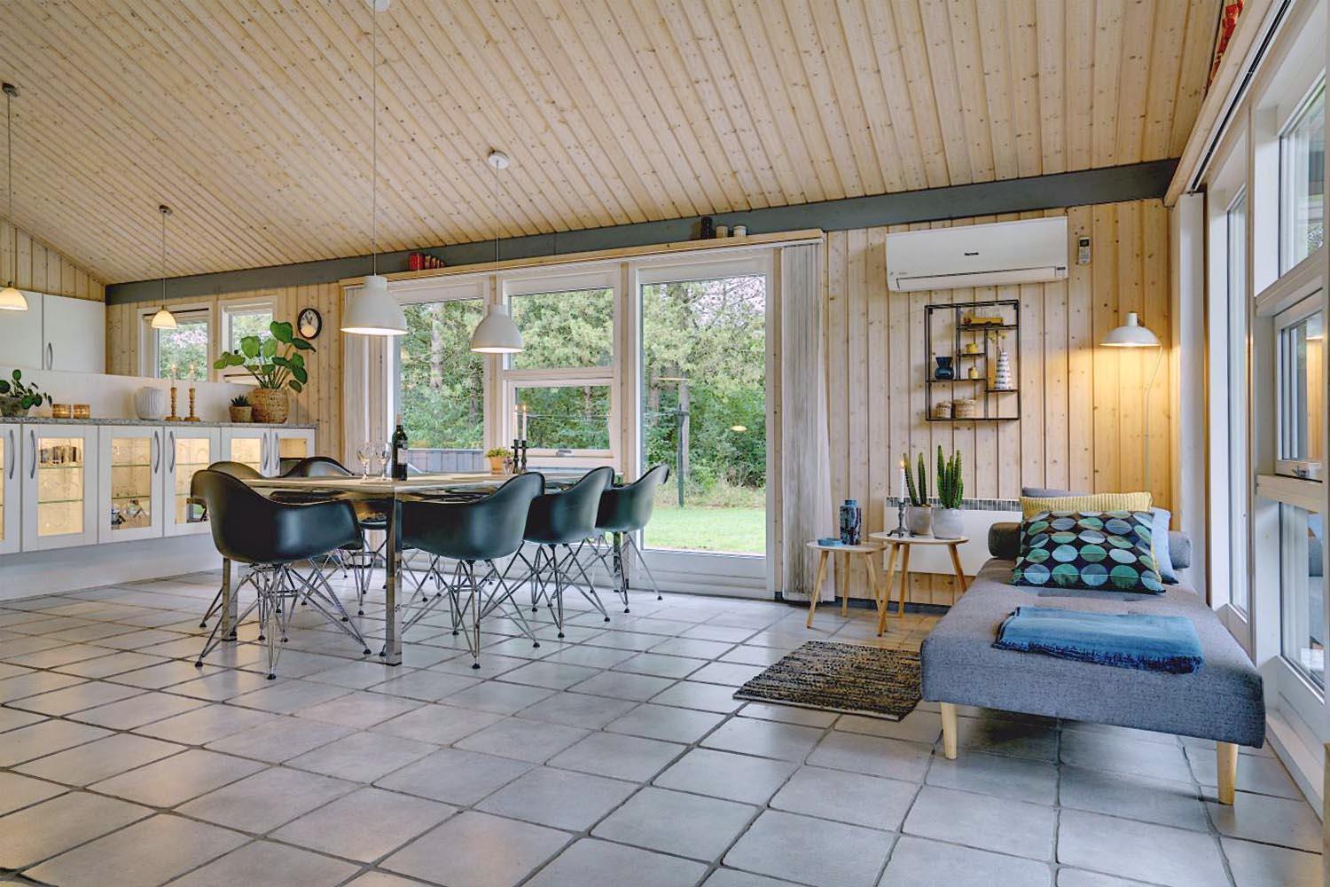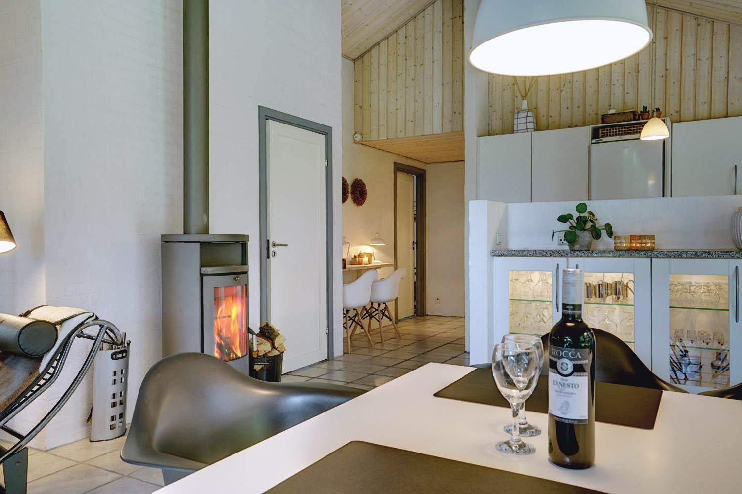Indenfor mødes I af en lyst og indbydende stue med store vinduer, der lukker dagslyset ind, og en brændeovn, som skaber ægte feriehygge. Der er både varmepumpe og gulvvarme i opholdsrummet – det giver en behagelig temperatur året rundt.