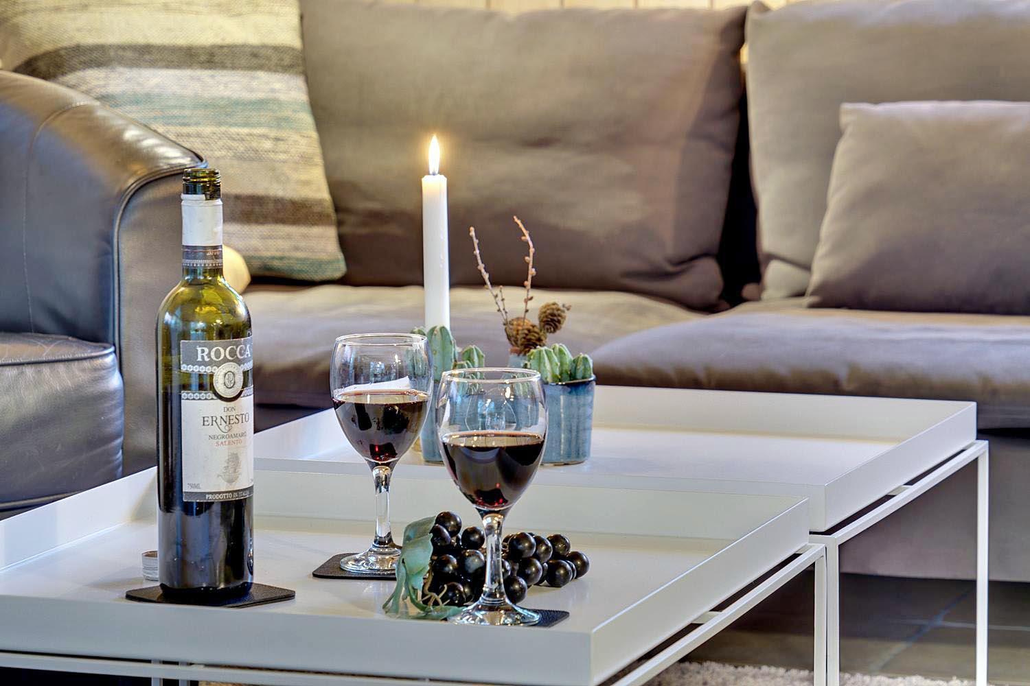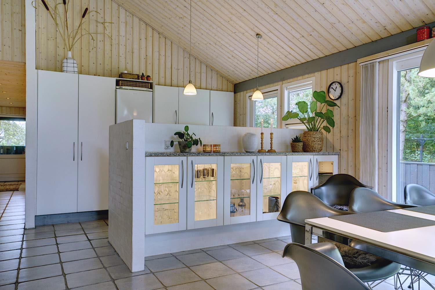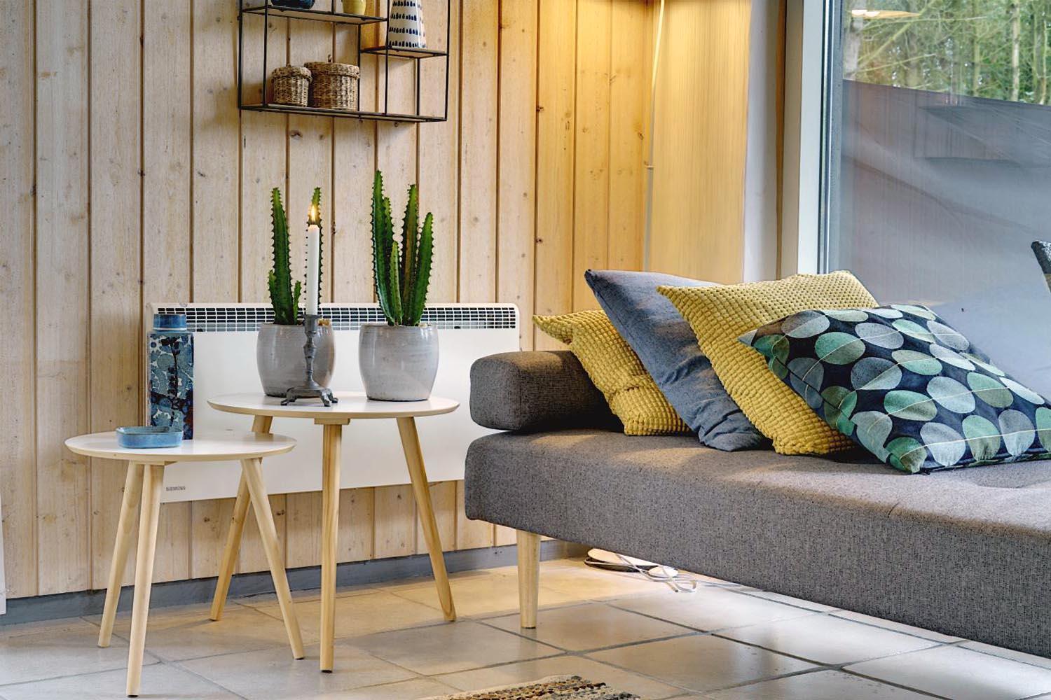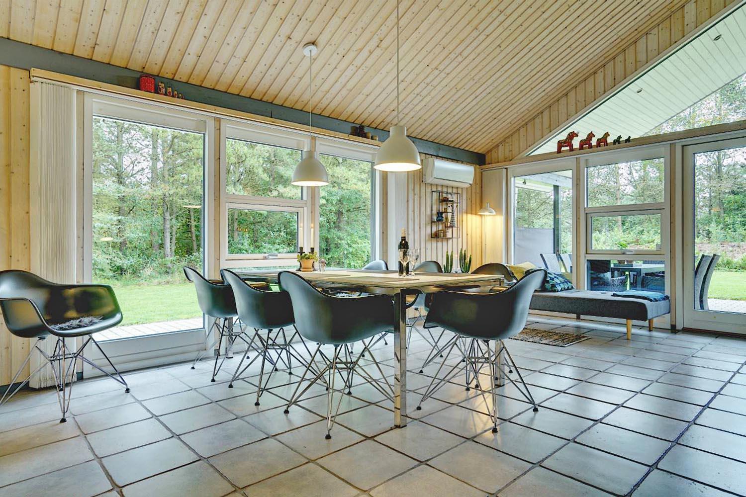 Indenfor mødes I af en lyst og indbydende stue med store vinduer, der lukker dagslyset ind, og en brændeovn, som skaber ægte feriehygge. Der er både varmepumpe og gulvvarme i opholdsrummet – det giver en behagelig temperatur året rundt.