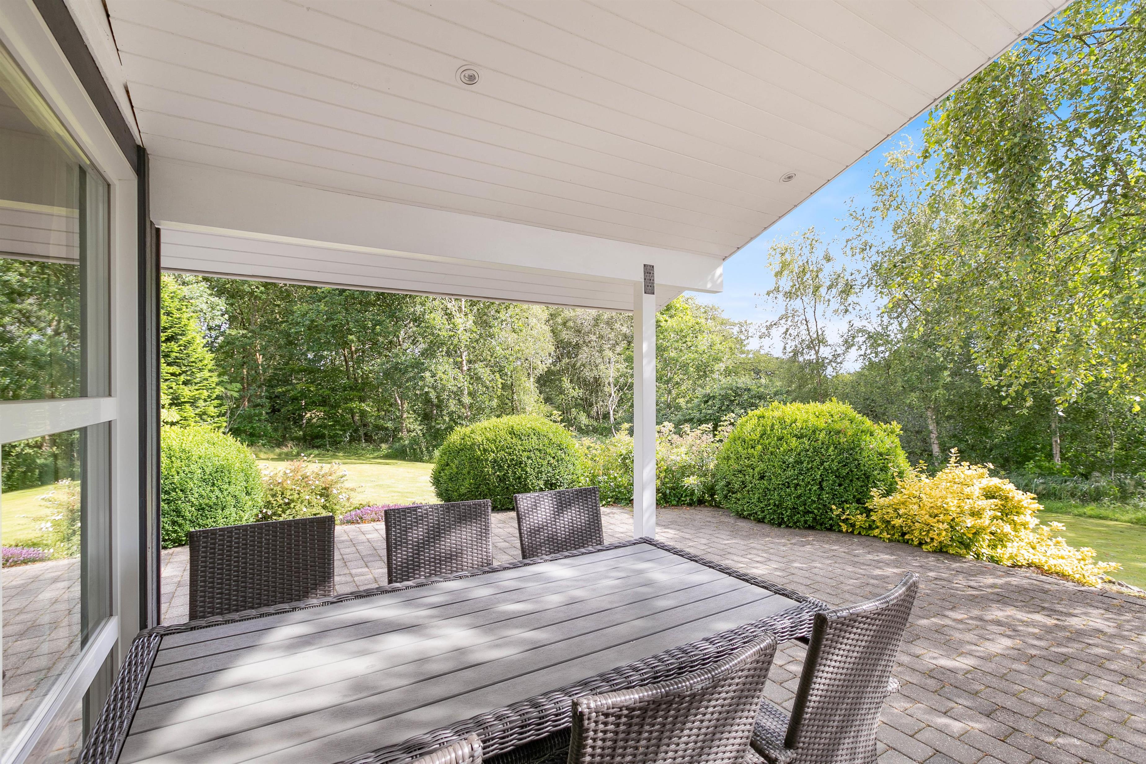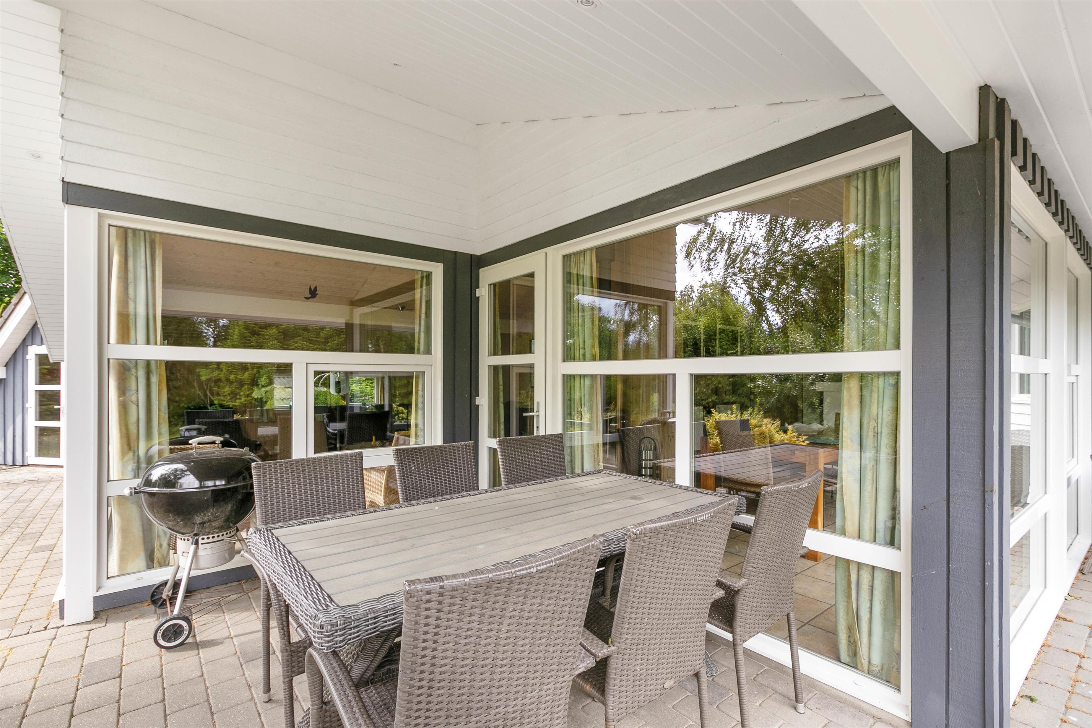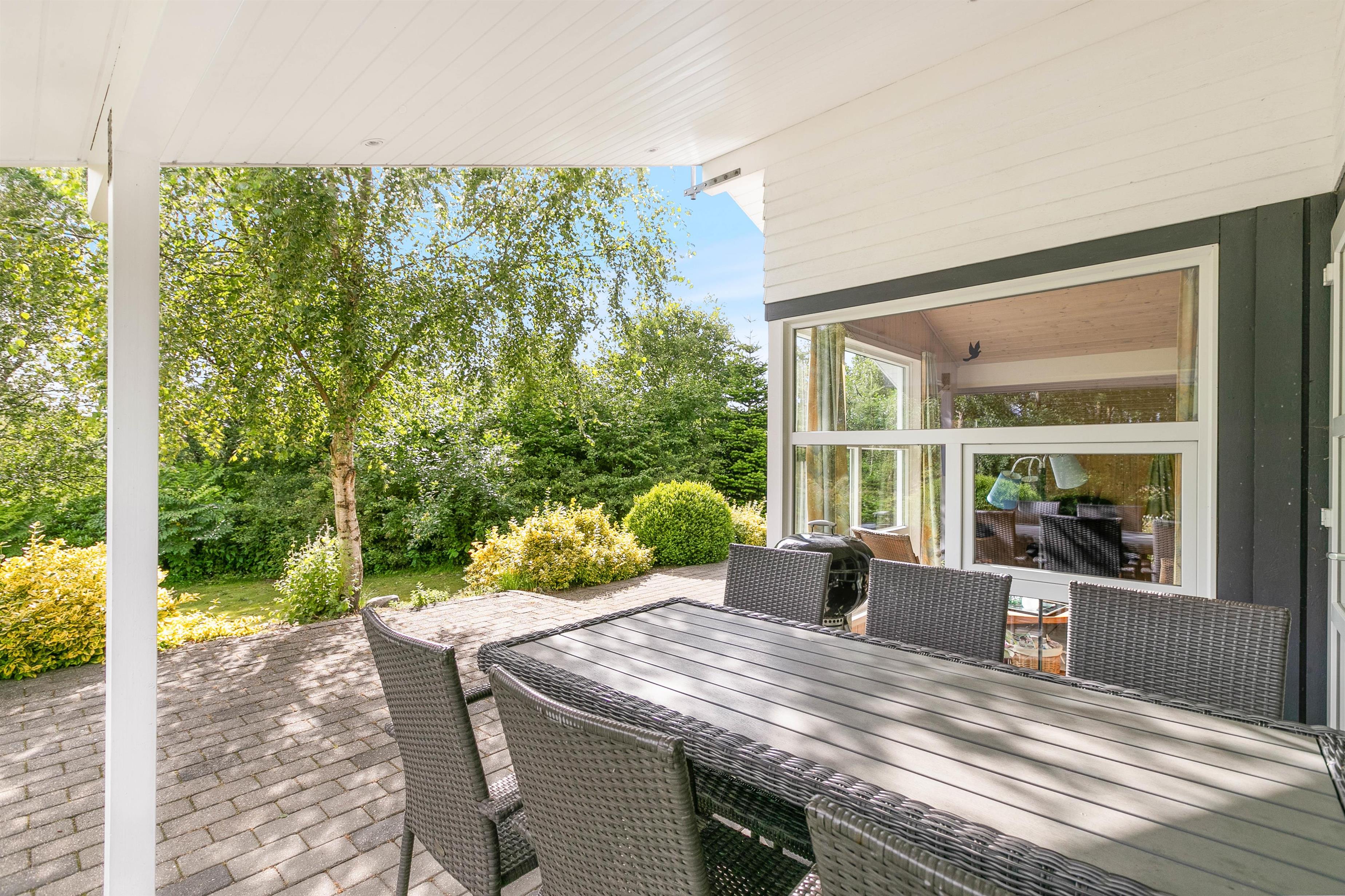 Den delvist overdækkede terrasse løber langs 2 sider af feriehuset. Læn jer tilbage i de komfortable havemøbler og nyd en friskbrygget kaffe, mens børnene leger med hunden i græsset. Her er der god plads til alt fra kongespil til boldspil. Imens børnene leger, kan familiens grillmester tænde op i grillen og fremtrylle et dejligt måltid – den helt rigtige måde at afslutte dagen på!