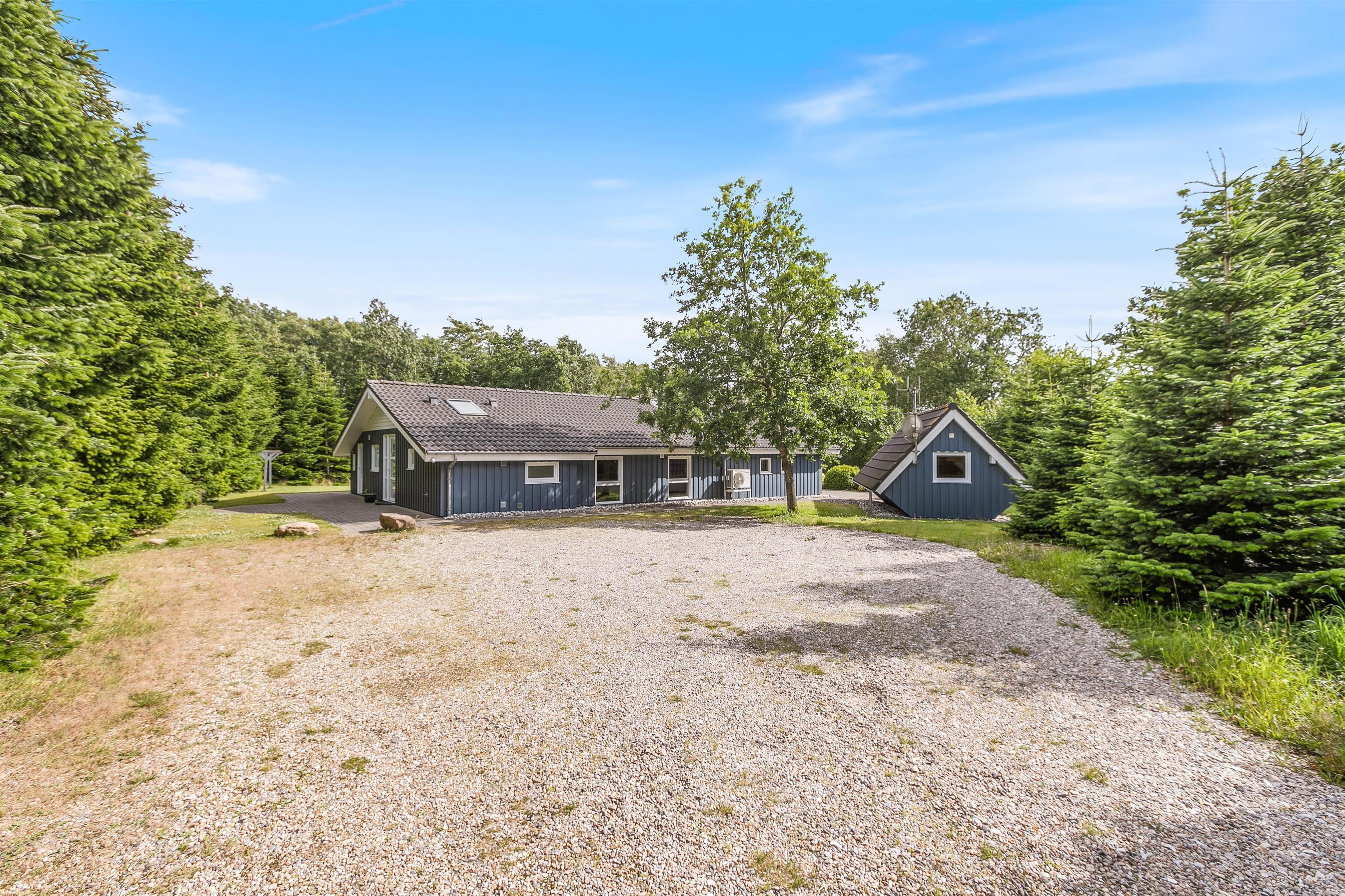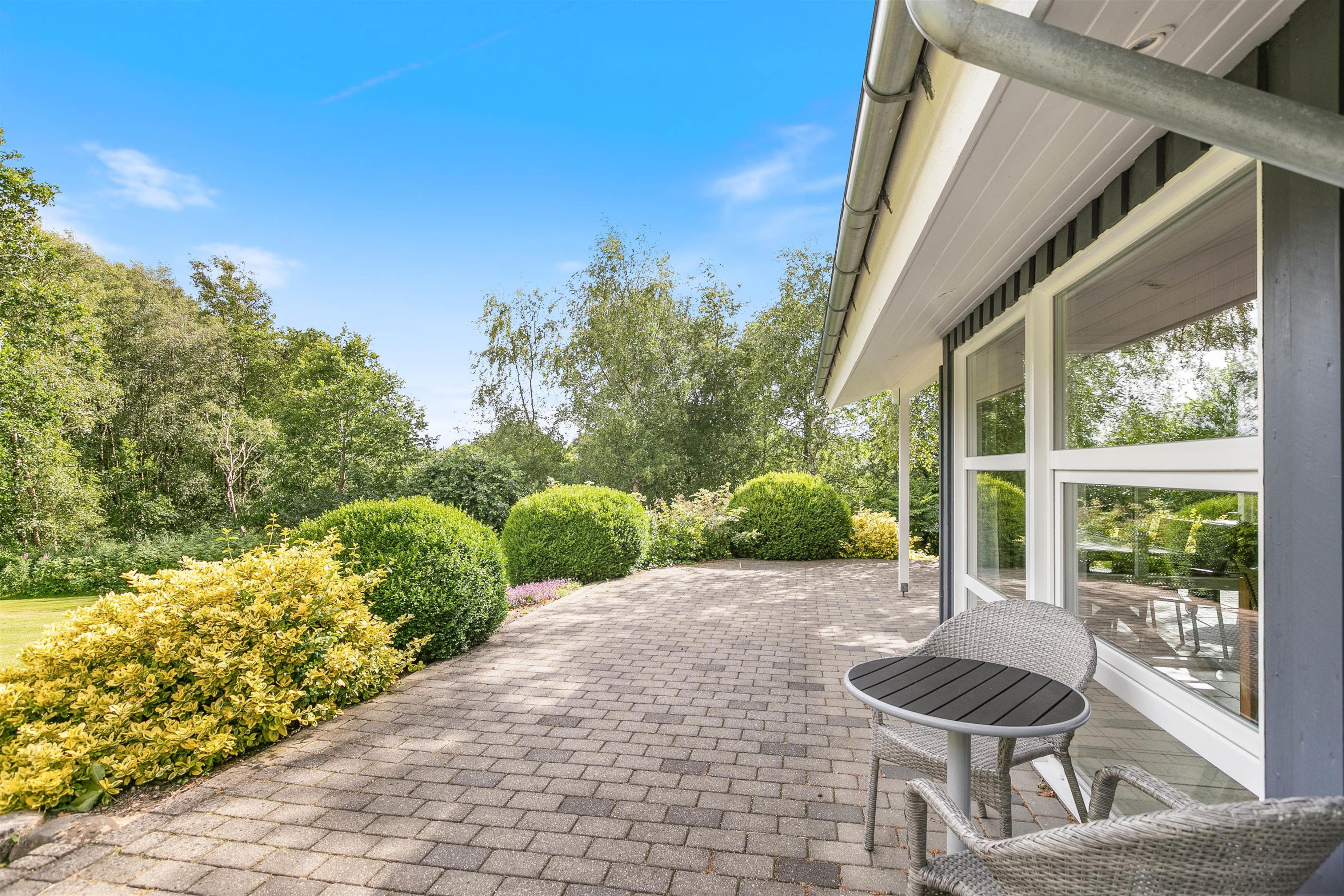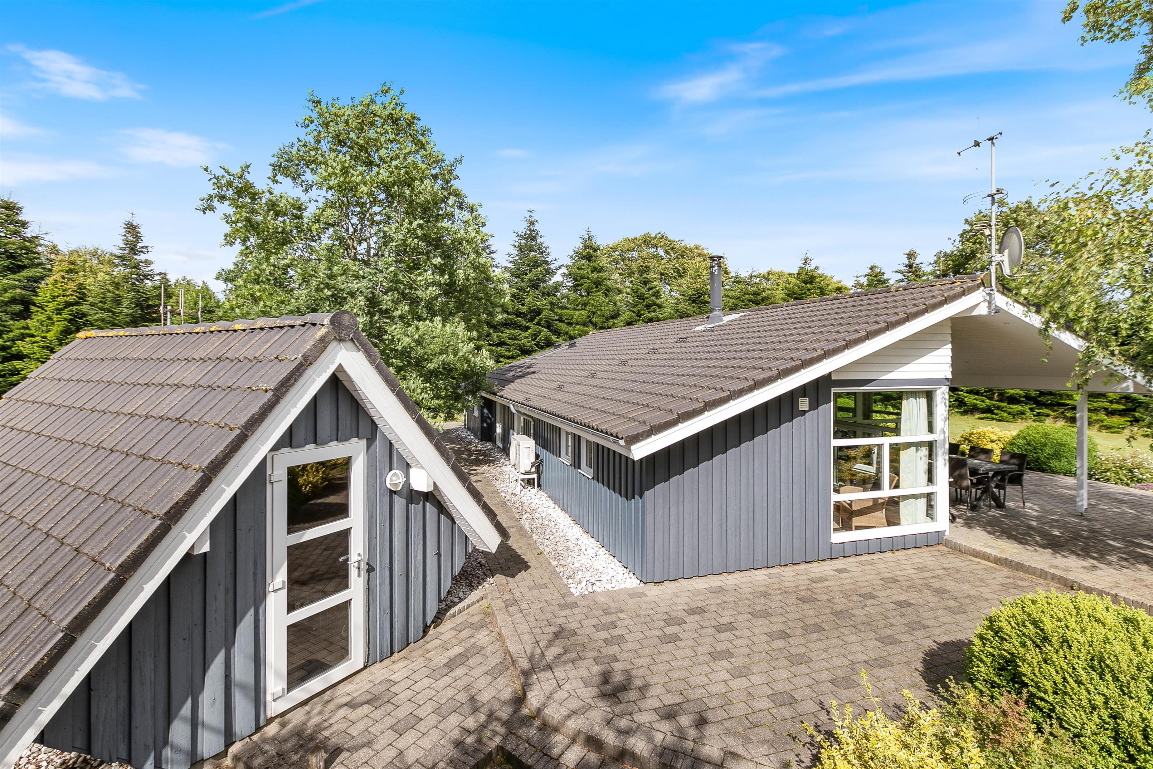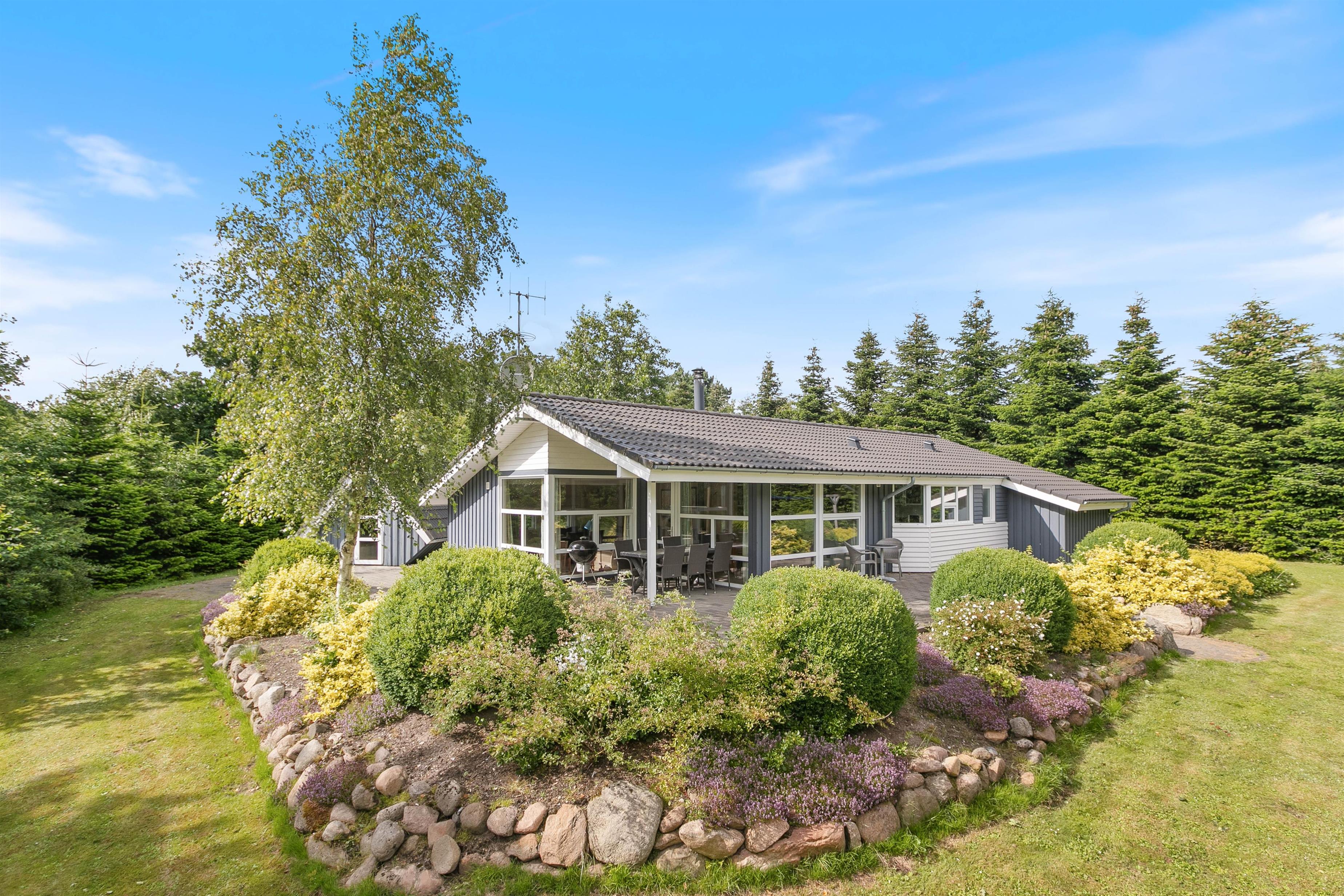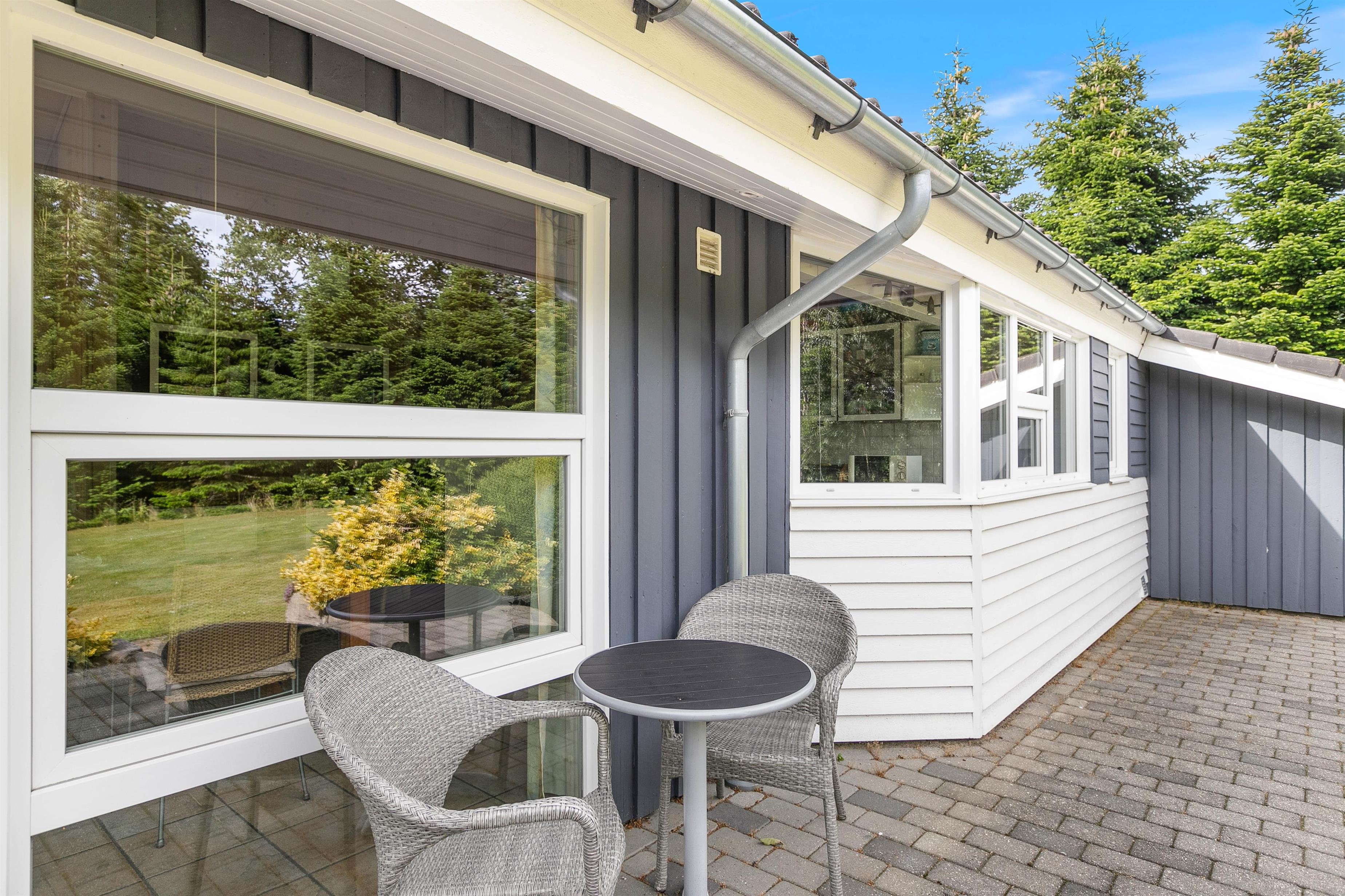 Feriehuset har en rolig beliggenhed på en stor naturgrund med en dejlig terrasse og have. Ejendommen grænser op til et naturbeskyttet område, hvor det ikke er ualmindeligt at se vilde dyr. De omkringliggende træer skærmer også godt af for nærmeste naboer og vinden, så her kan I virkelig nyde de dejlige sommerdage.