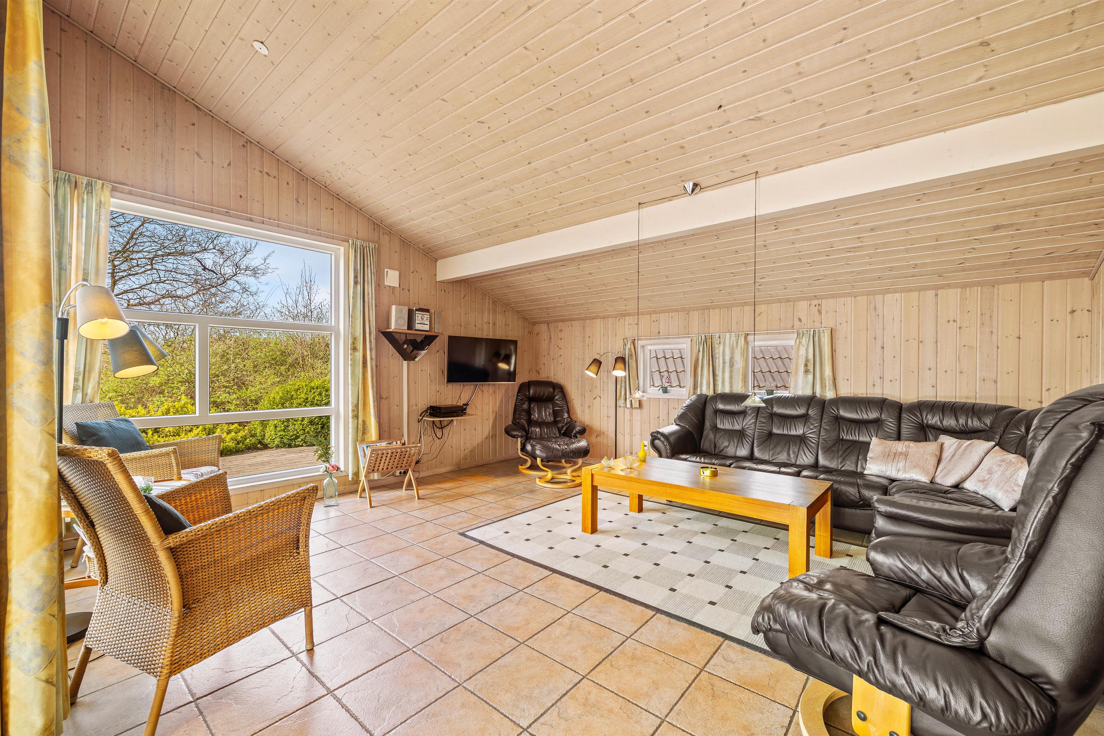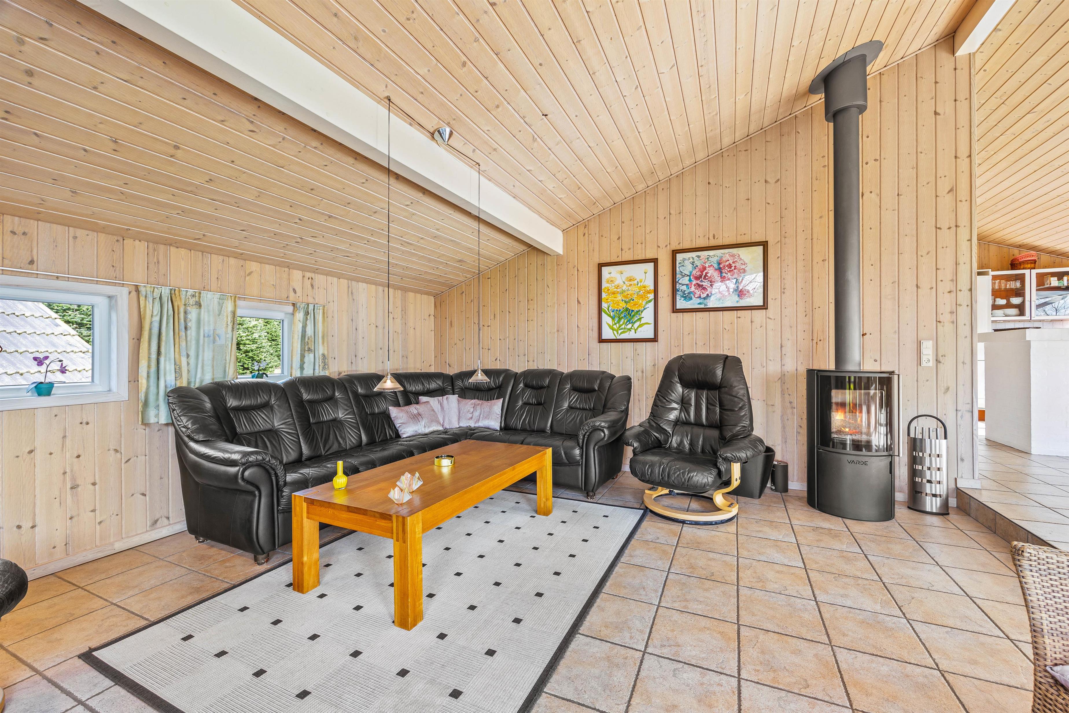Feriehuset har et åbent køkken/opholdsrum med gulvvarme, så I altid kan holde fødderne varme. Her er rummeligt og lyst med de store vinduespartier. Her er masser af plads til familielivet, og den hyggelige stue er trukket et par trin tilbage. Her kan I slænge jer i sofaen, spille brætspil og varme jer foran den knitrende brændeovn. Også her finder I en energieffektiv varmepumpe, der reducerer forbruget og sikrer et behageligt indeklima hele året rundt.