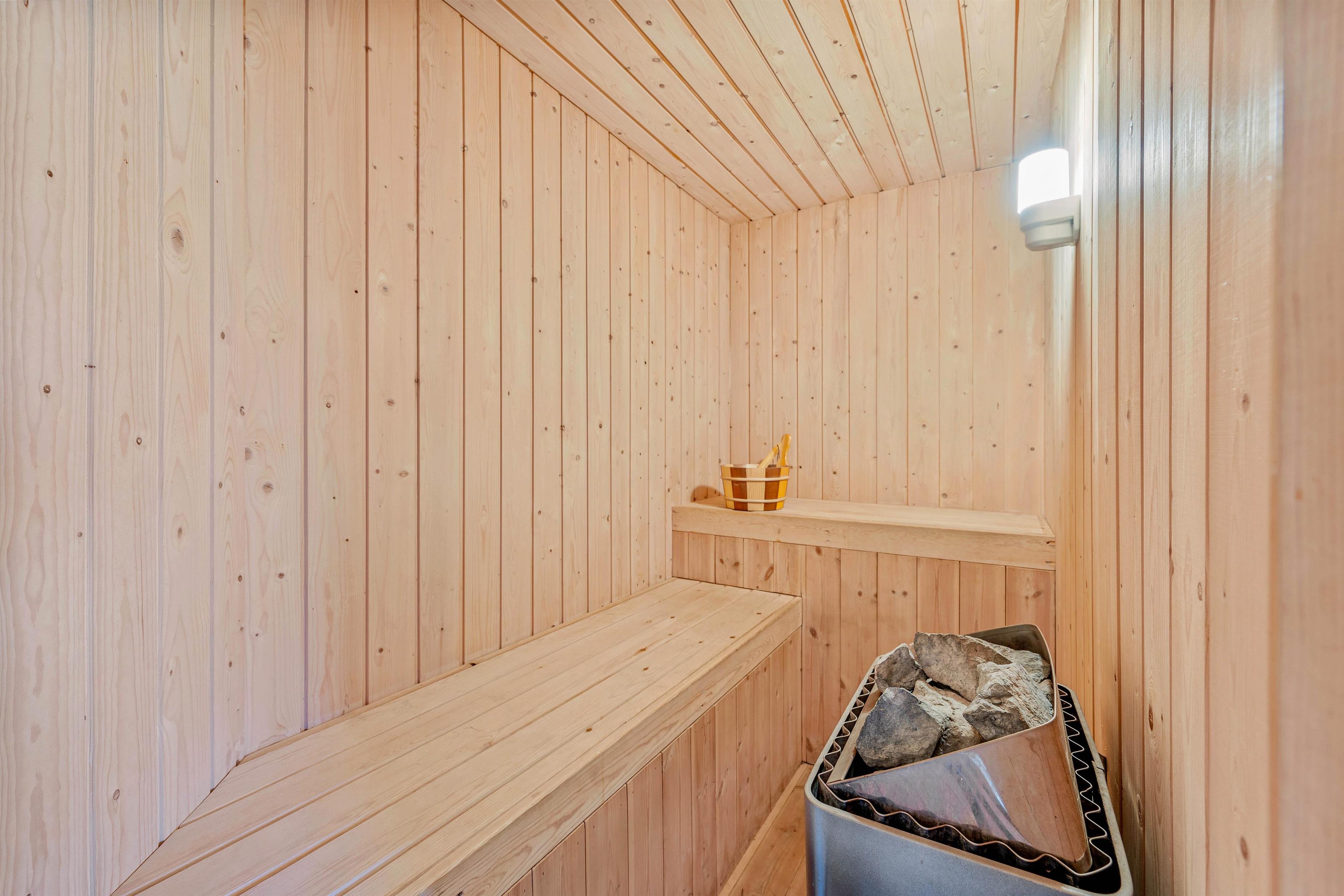 I sommerhuset er der et badeværelse samt et gæstetoilet, så der ikke opstår alt for lang kø om morgenen. Der er gulvvarme på både badeværelset og på gæstetoilettet. Desuden er der vaskemaskine og tørretumbler i feriehuset. På badeværelset er der spabad og sauna, hvor I rigtig kan slappe af og nyde roen.