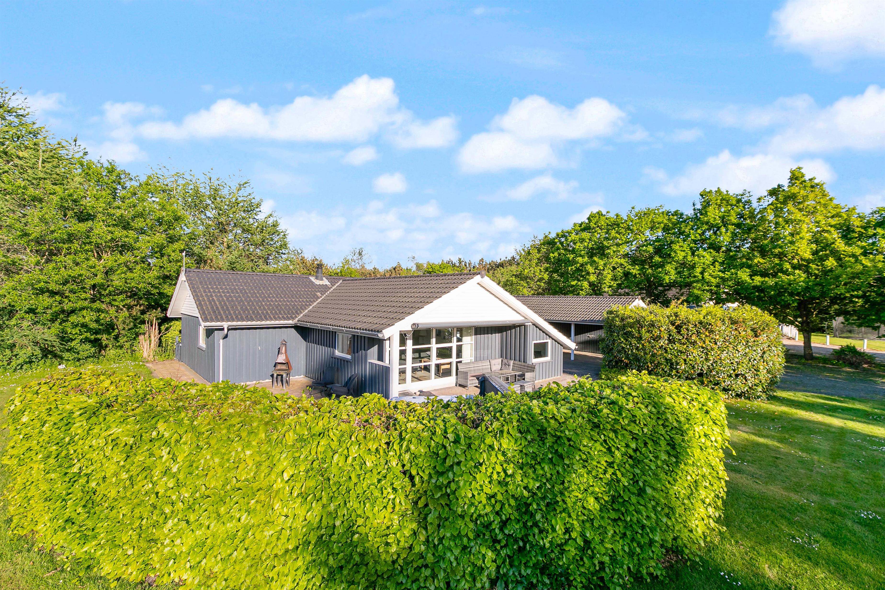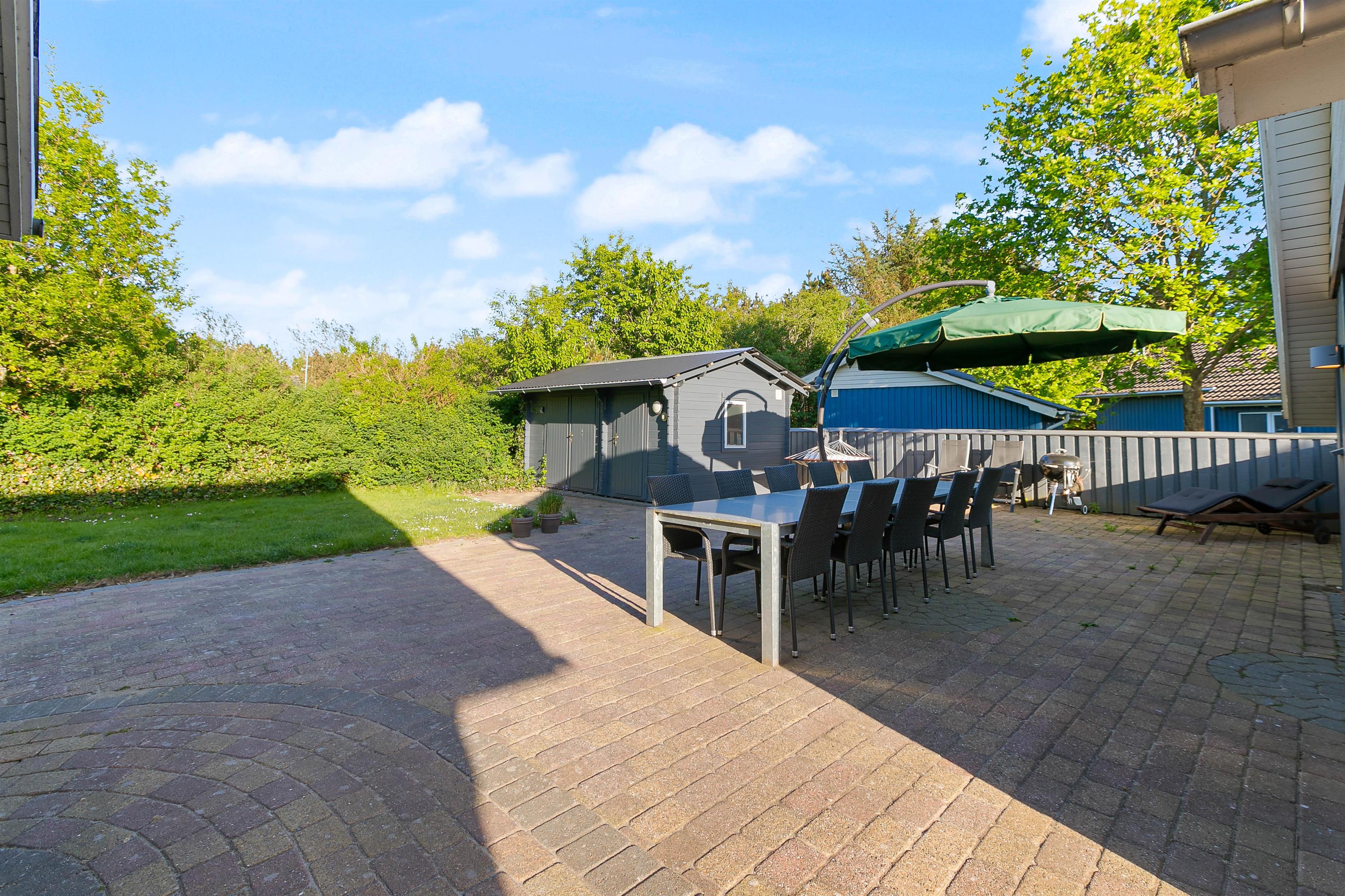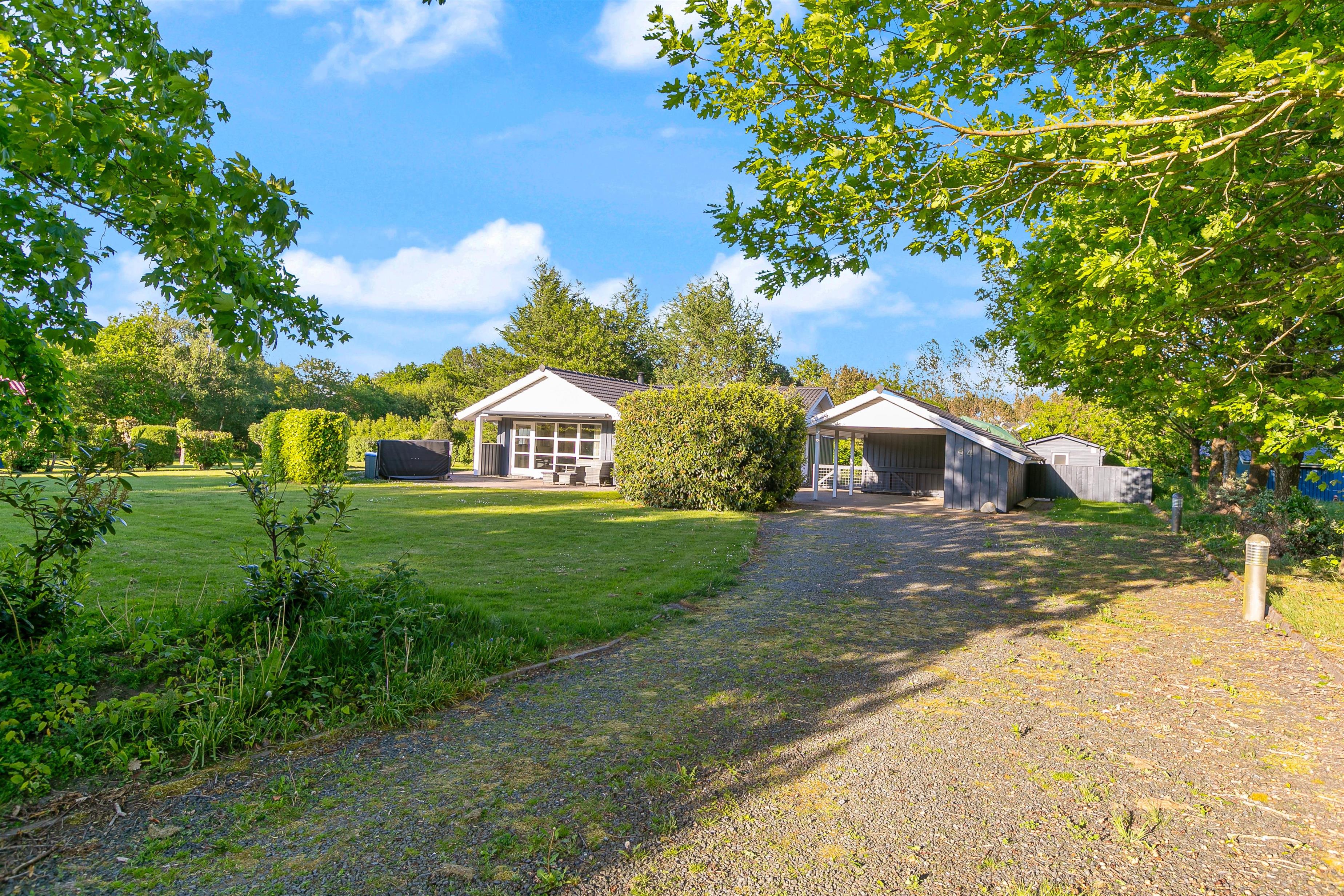 Feriehuset er placeret på en 1645 m2 stor plænegrund, hvoraf det dejlige terrasseområde og bålpladsen er indhegnet. Her kan både hunde og børn boltre sig. Til børnene er der også både trampolin, et legetårn med gynger og rutsjebane, sandkasse og en bålplads, hvor I kan nyde mørket falde på en stille sommeraften, mens I rister skumfiduser og lægger planer for de kommende feriedage.