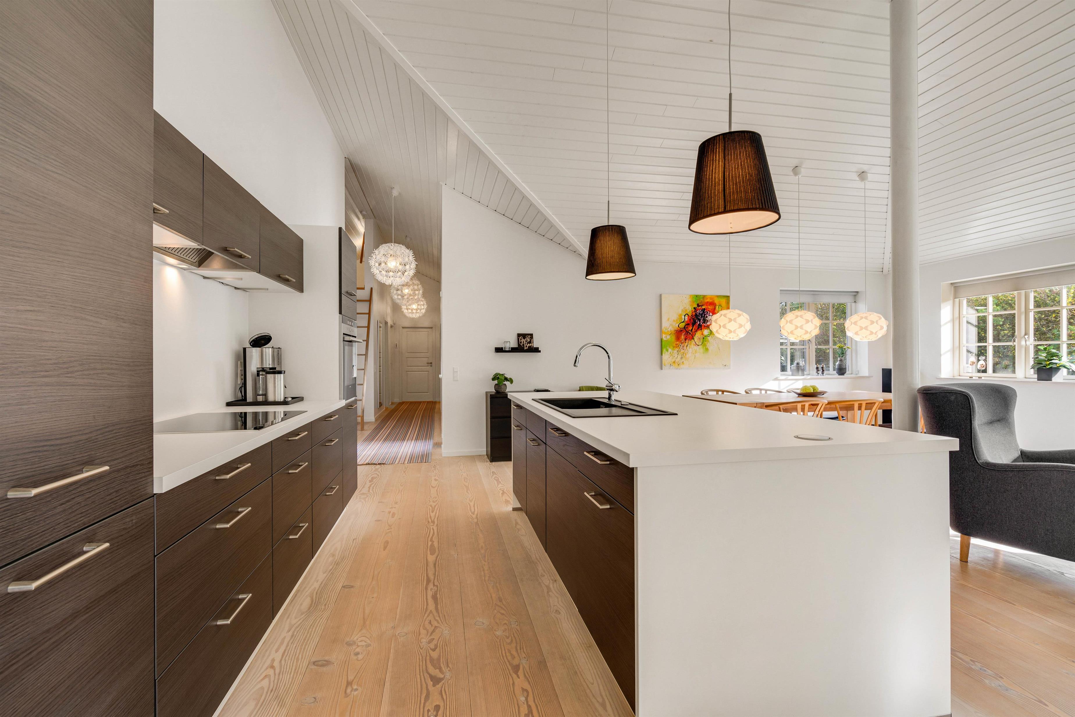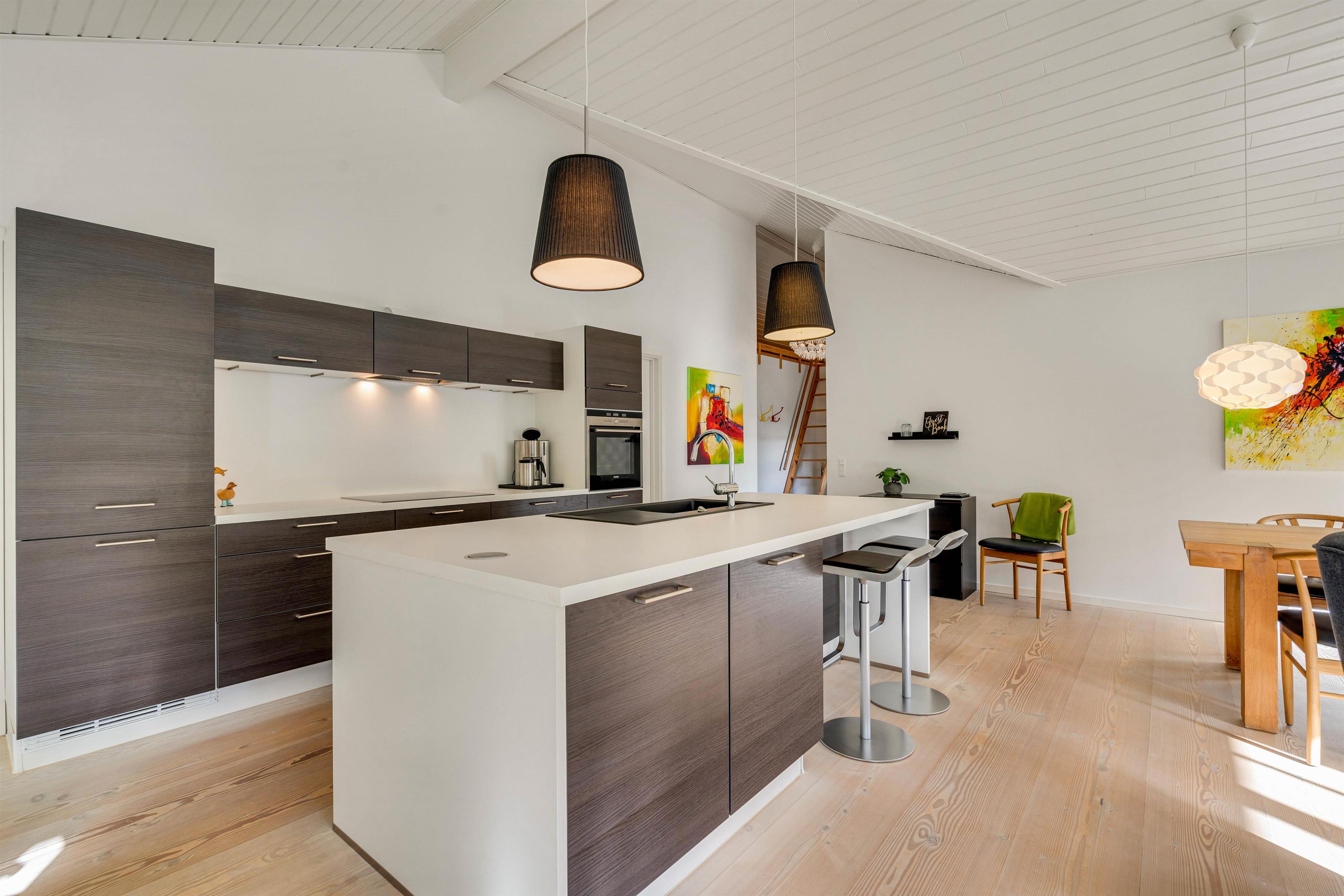 Det indbydende køkken og alrum hænger sammen, så her kan ferieflokken samles i et opholdsrum, hvor stemningen inviterer til feriehygge. Her kan I slænge jer i den store hjørnesofa med en god bog eller en film på tv’et. Desuden er køkkenet indrettet bekvemt med induktion, indbygget 80 liters fryser samt et praktisk bryggers med både vaskemaskine og tørretumbler til rådighed.
