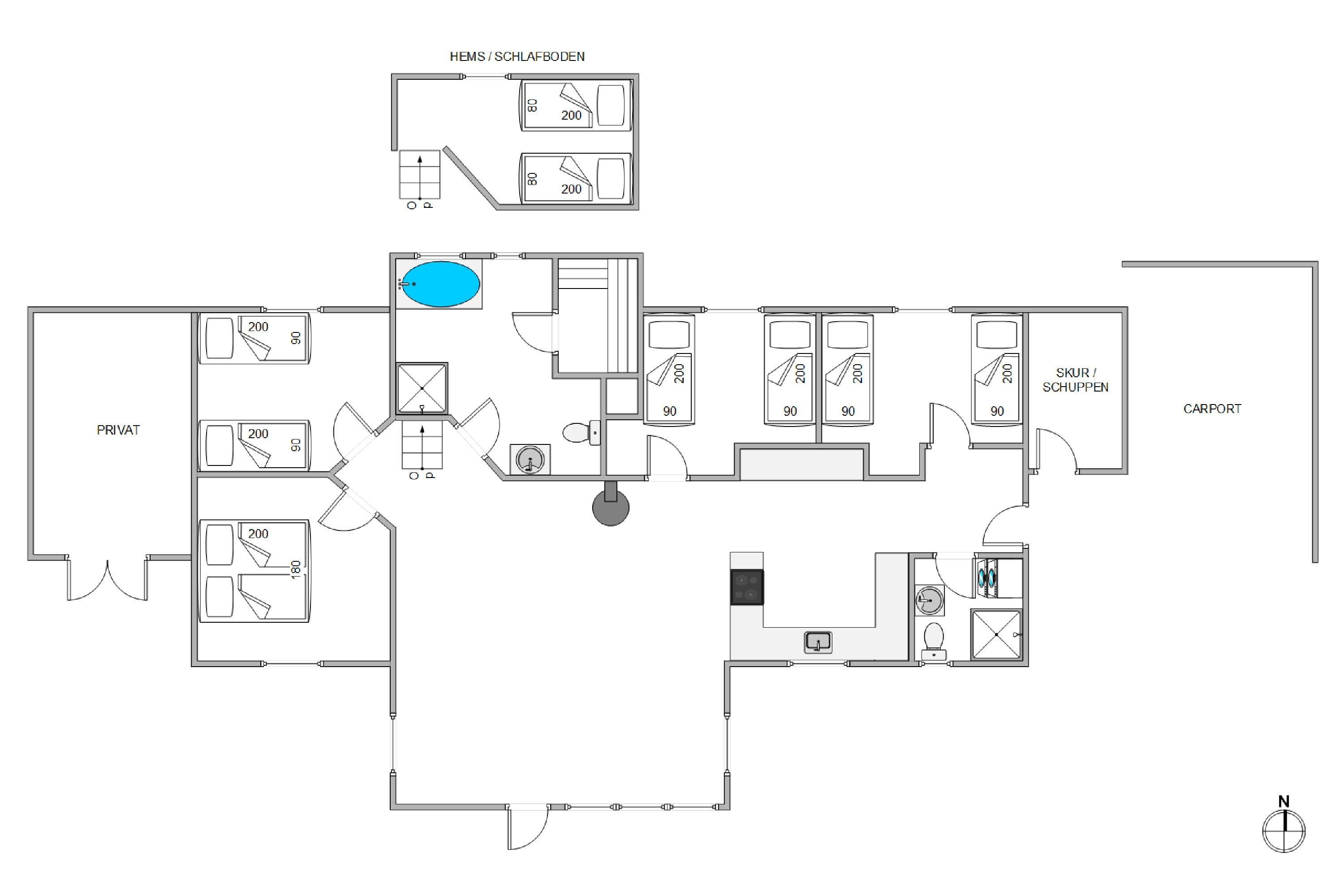 Indenfor i sommerhuset finder I alt, hvad der er nødvendigt for at sikre en afslappende og bekvem ferie. Her er der 8 sovepladser fordelt på 4 komfortable soveværelser og 2 sovepladser på hemsen, som giver god plads til både familier og større grupper, hvor børnene helt sikkert vil være glade for hemsen.