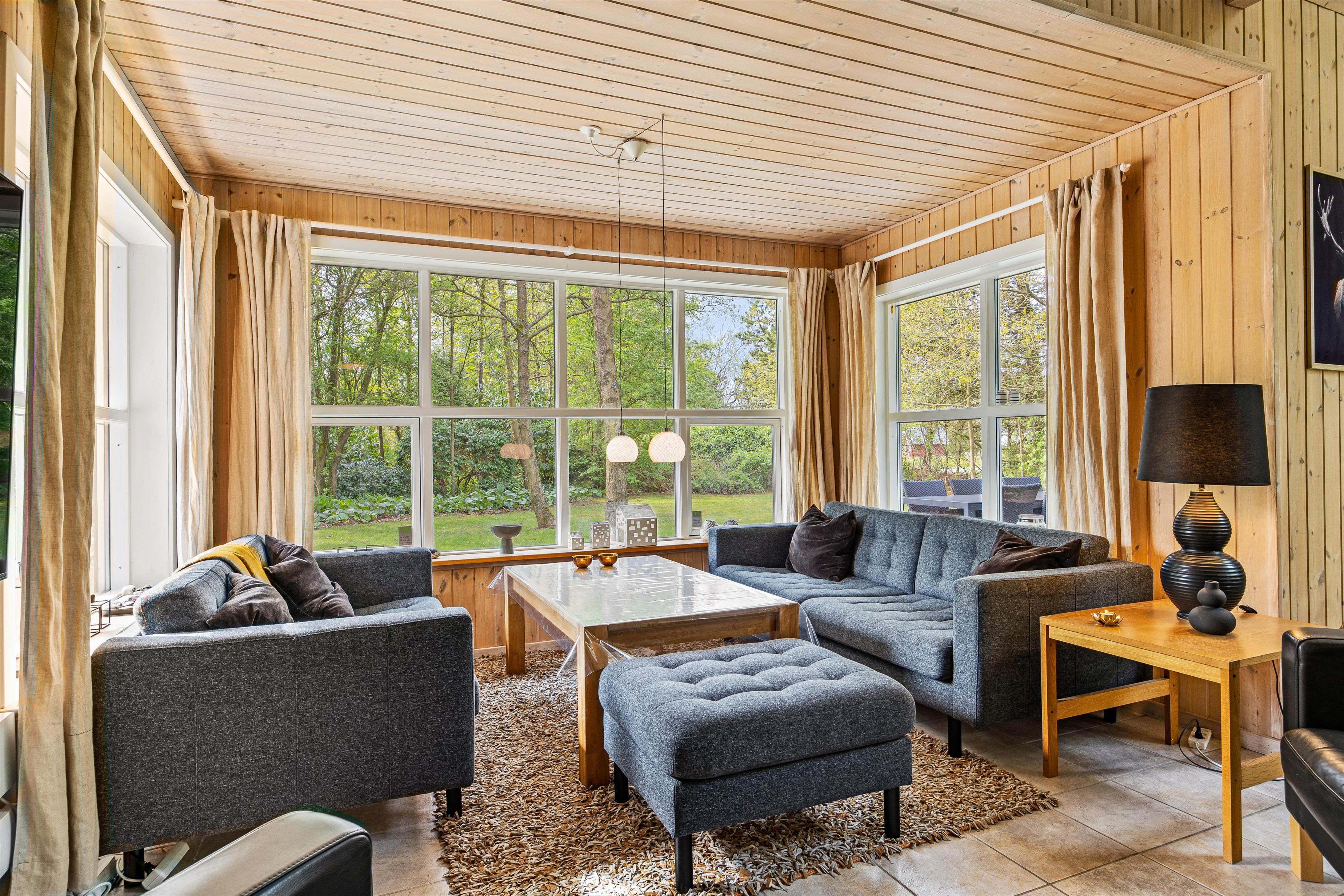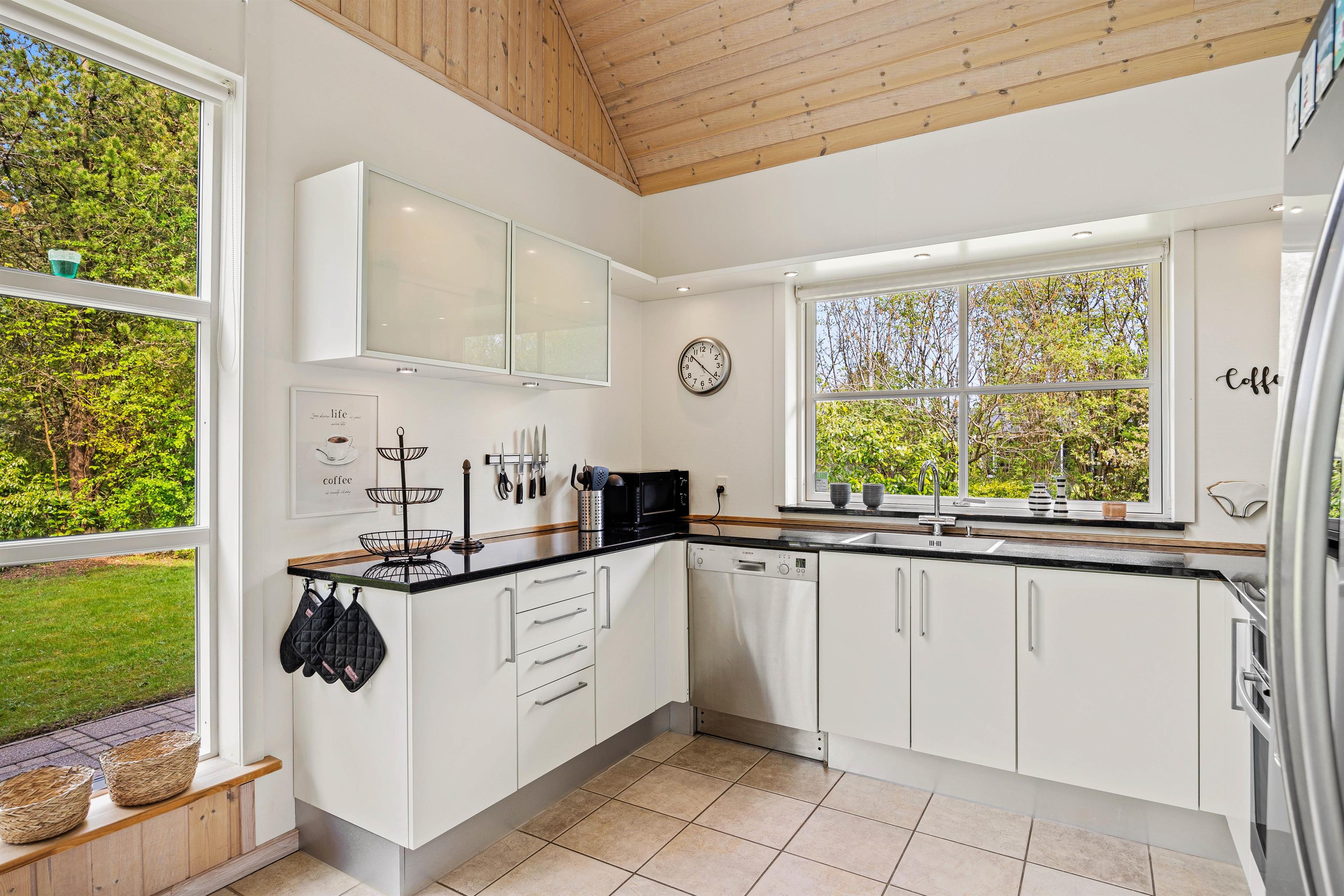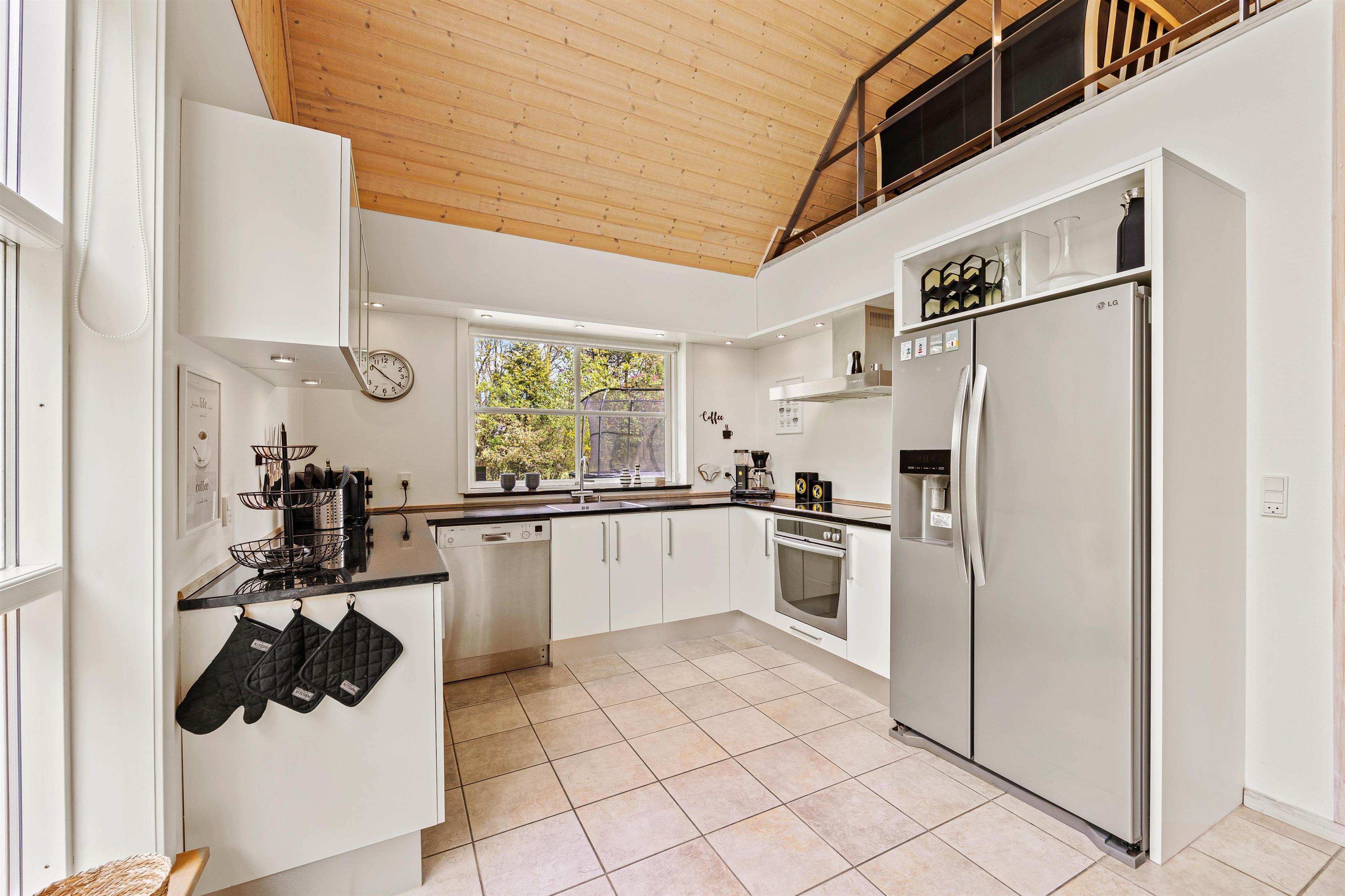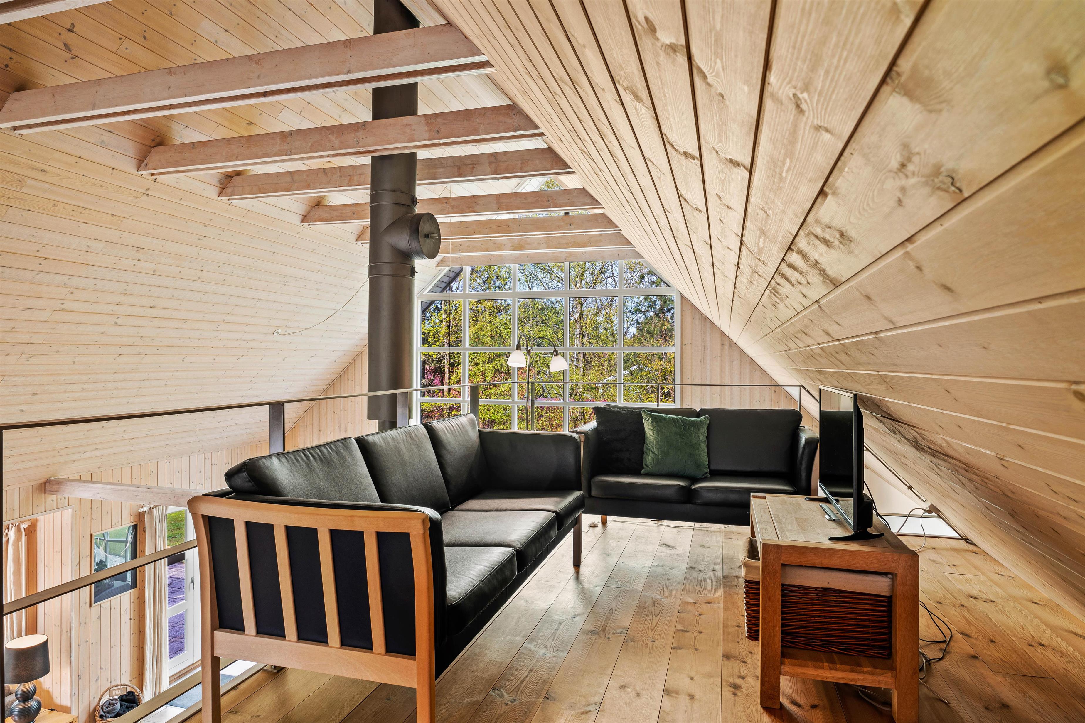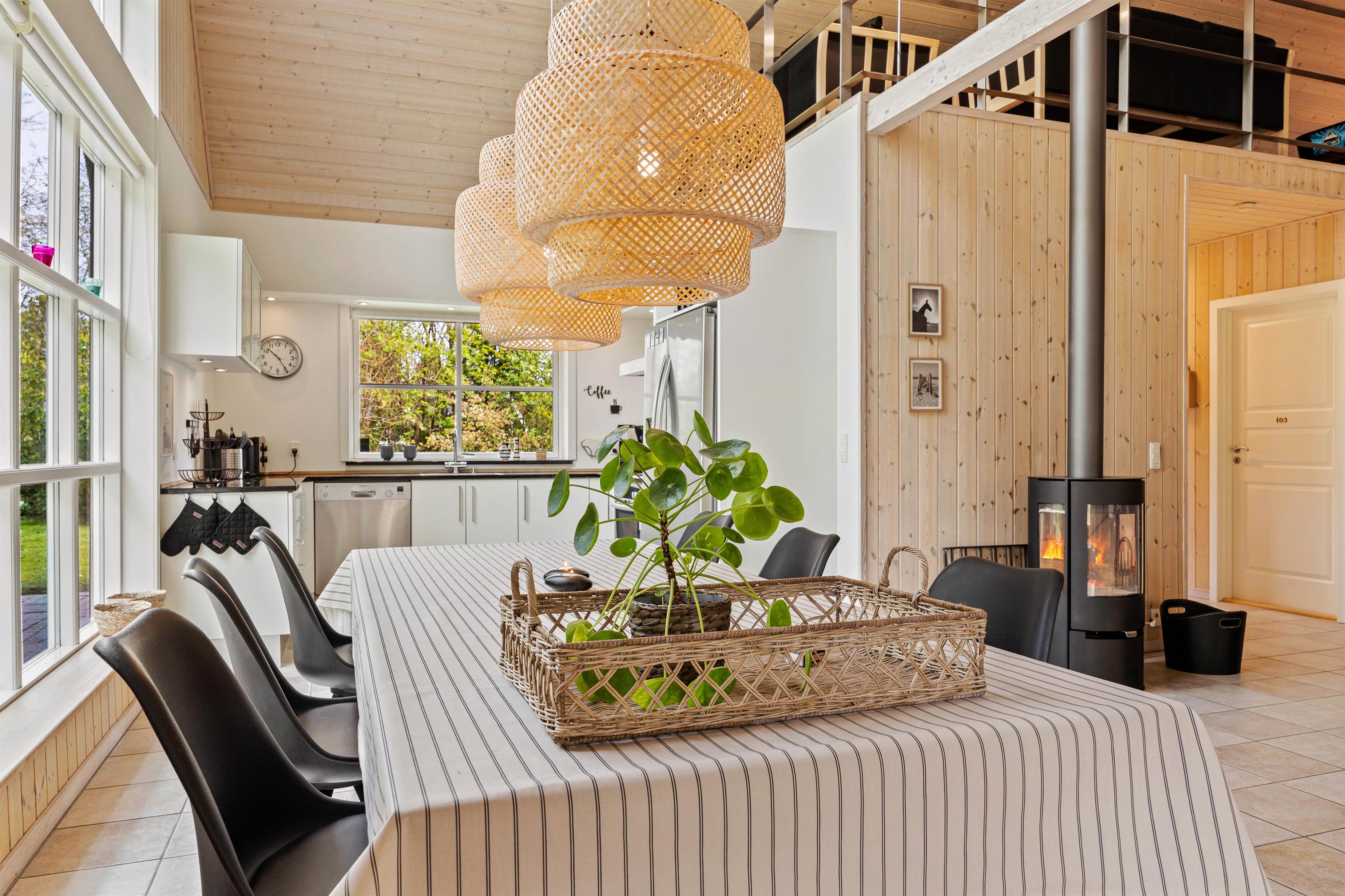 Det store fællesrum samler både køkken, spisestue og stue. Det veludstyrede køkken har mange lækre og praktiske fordele, så som opvaskemaskine og amerikanerkøleskab, så der er altid iskoldt vand. Stuen byder op til hygge, hvad enten I nu er til kort- og brætspil foran den knitrende brændeovn, eller måske foretrækker I at smide jer på en af sofaerne og se en god film via sommerhusets Chromecast.
