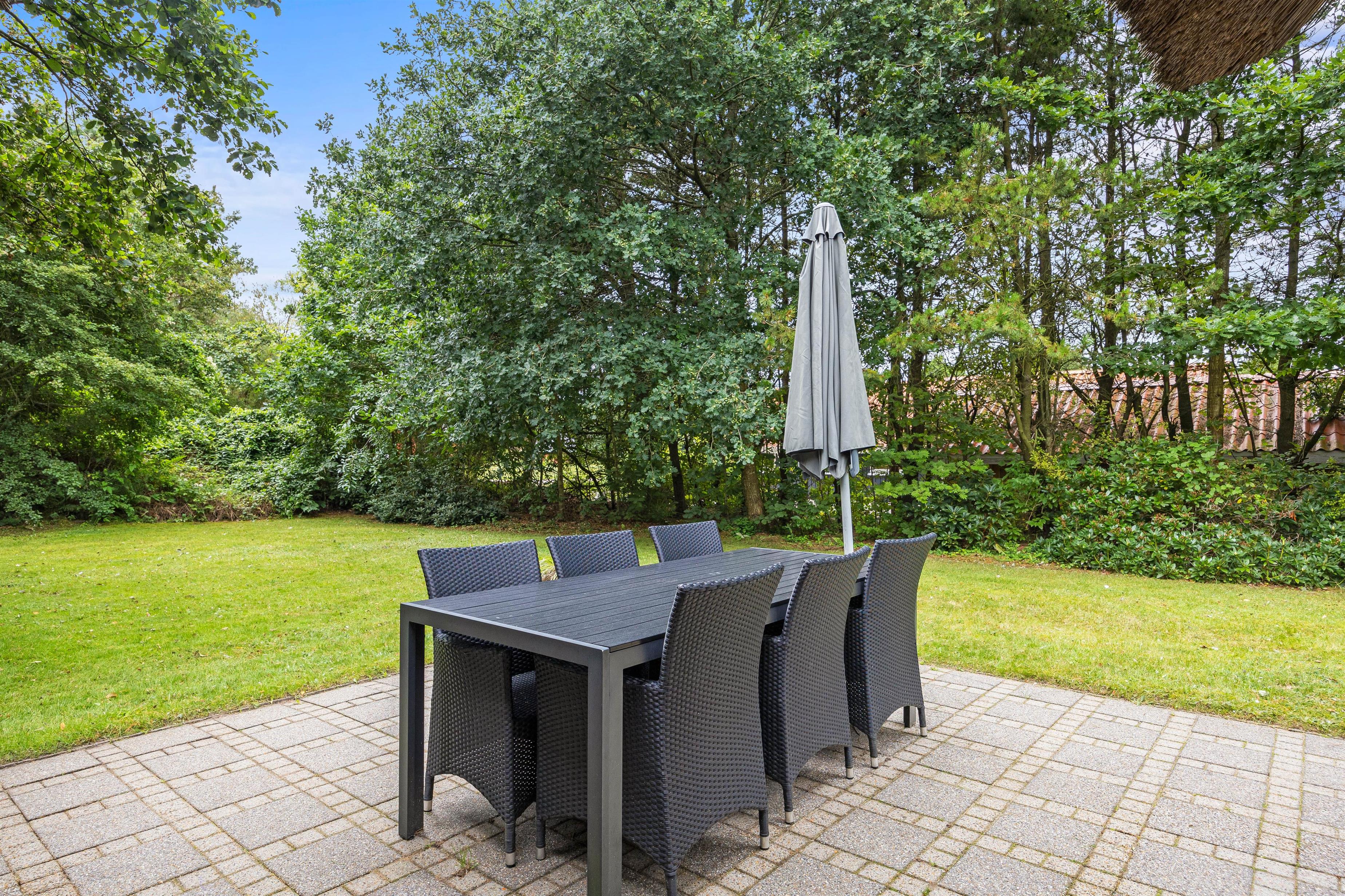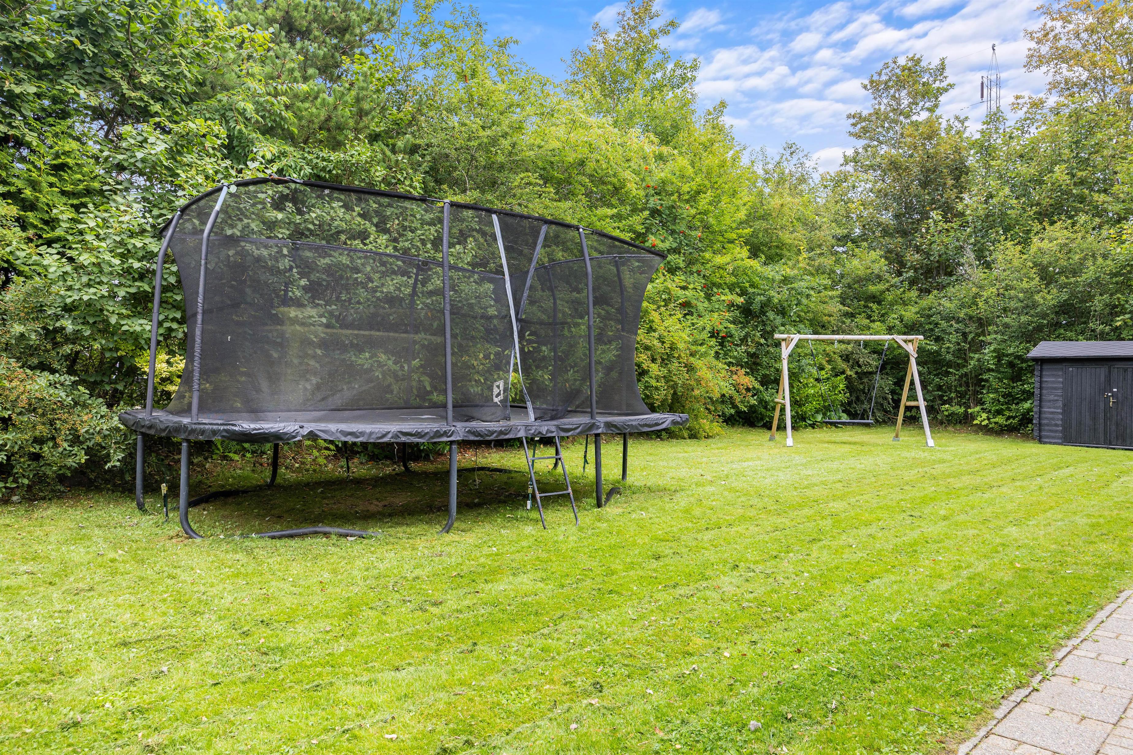 Den 1699m2 store plænegrund er fuld af muligheder for både store og små. Rundt om hele huset er der fliser og den sydvendte terrasse lader jer nyde solens stråler hele dagen, uanset om I foretrækker at hygge jer i havemøblerne, eller dase på solvognene. Børnene kan samtidig give den fuld gas på gyngerne, trampolinen, i sandkassen eller rundt på den store plæne. Efter en skøn feriedag, kan I tænde op i gasgrillen og nyde et lækkert feriemåltid tilberedt og indtaget under åben himmel.