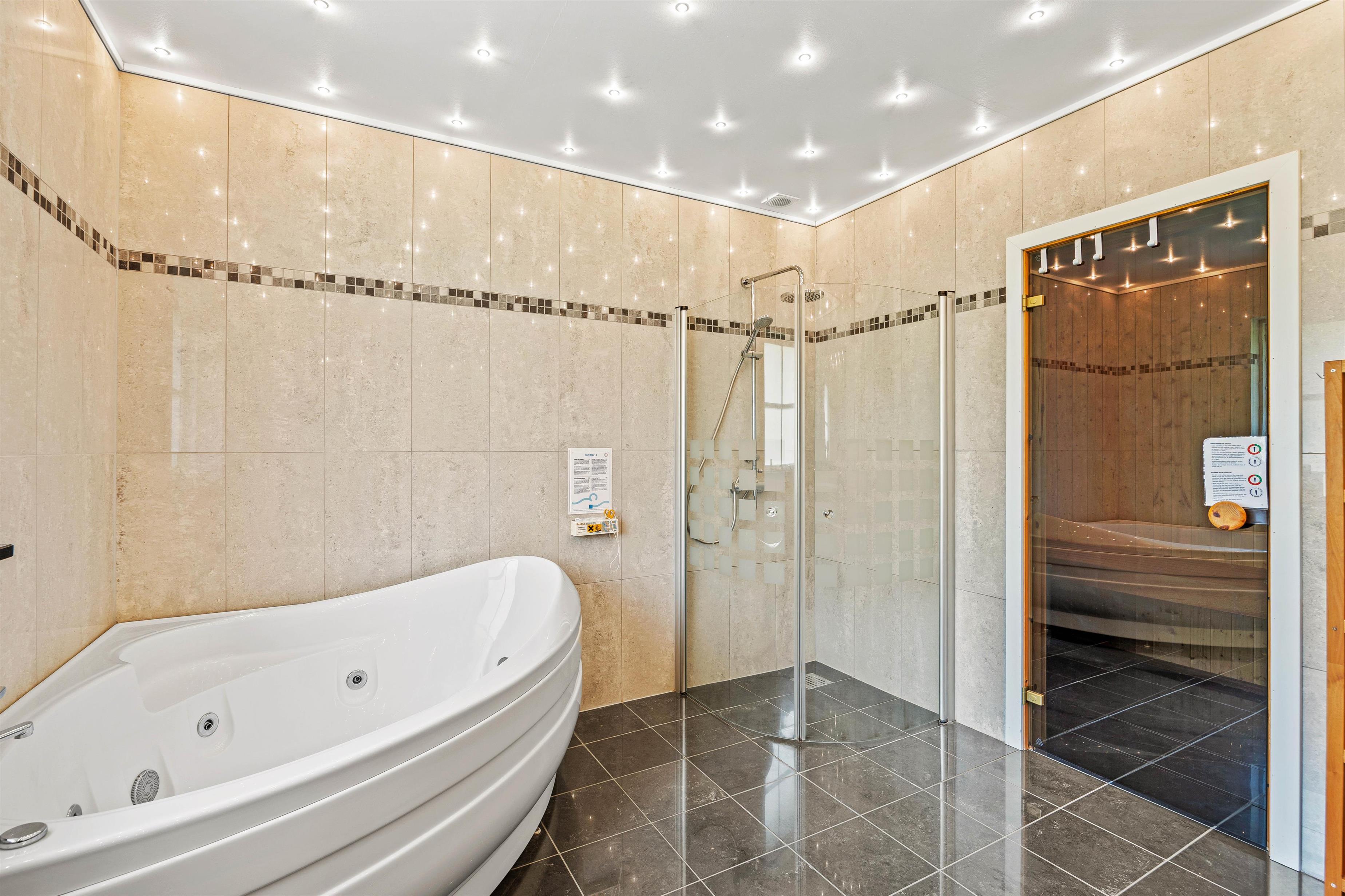 På stueetagen finder I de tre soveværelser, alle indrettet med dobbeltsenge. Ved siden af værelserne er der et badeværelse, og her er der både sauna og spa. Så her kan I rigtig blive varmet igennem på de køligere dage efter en lang gåtur i det skønne område, eller bare lade tankerne flyde og slappe helt af i hver en muskel.