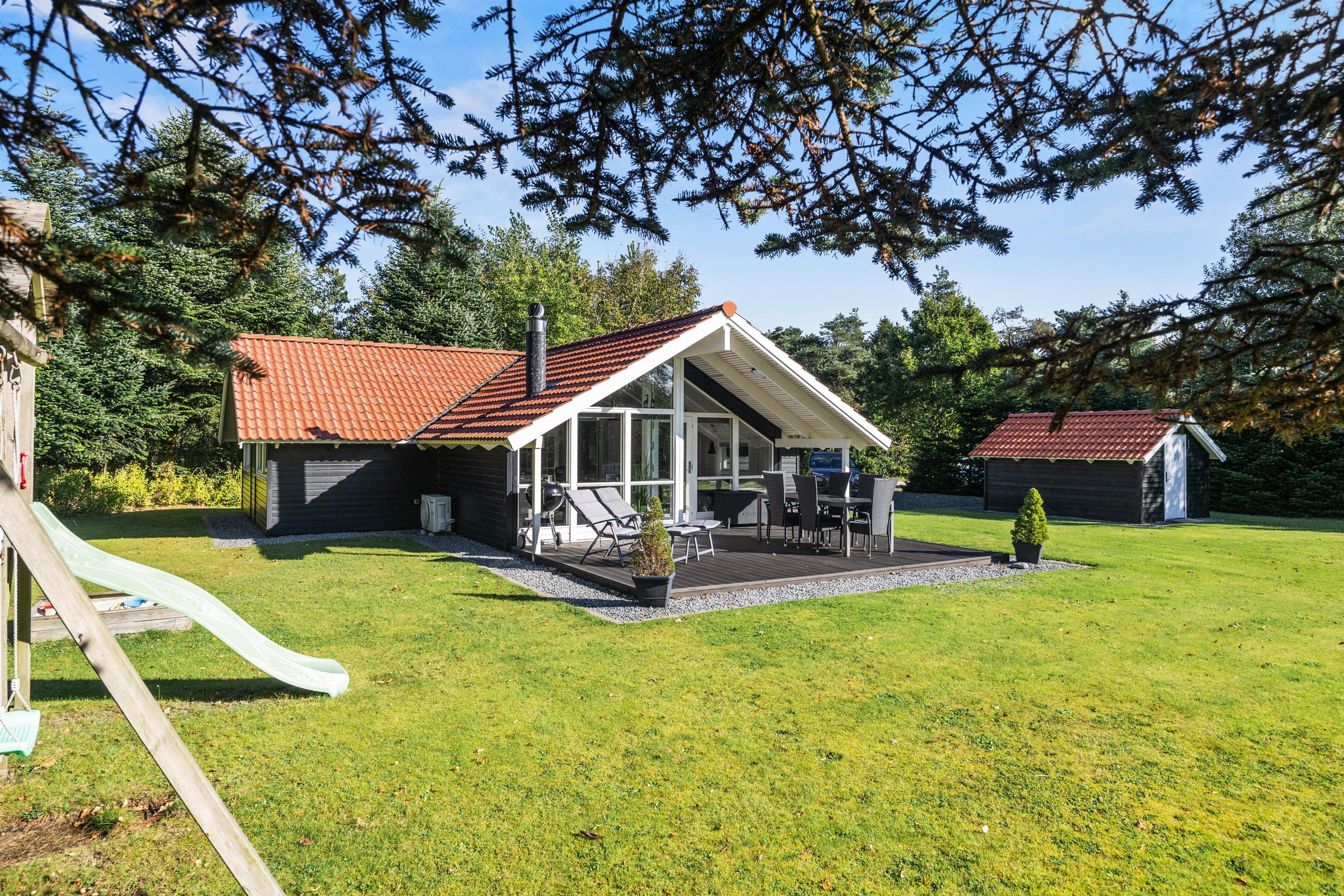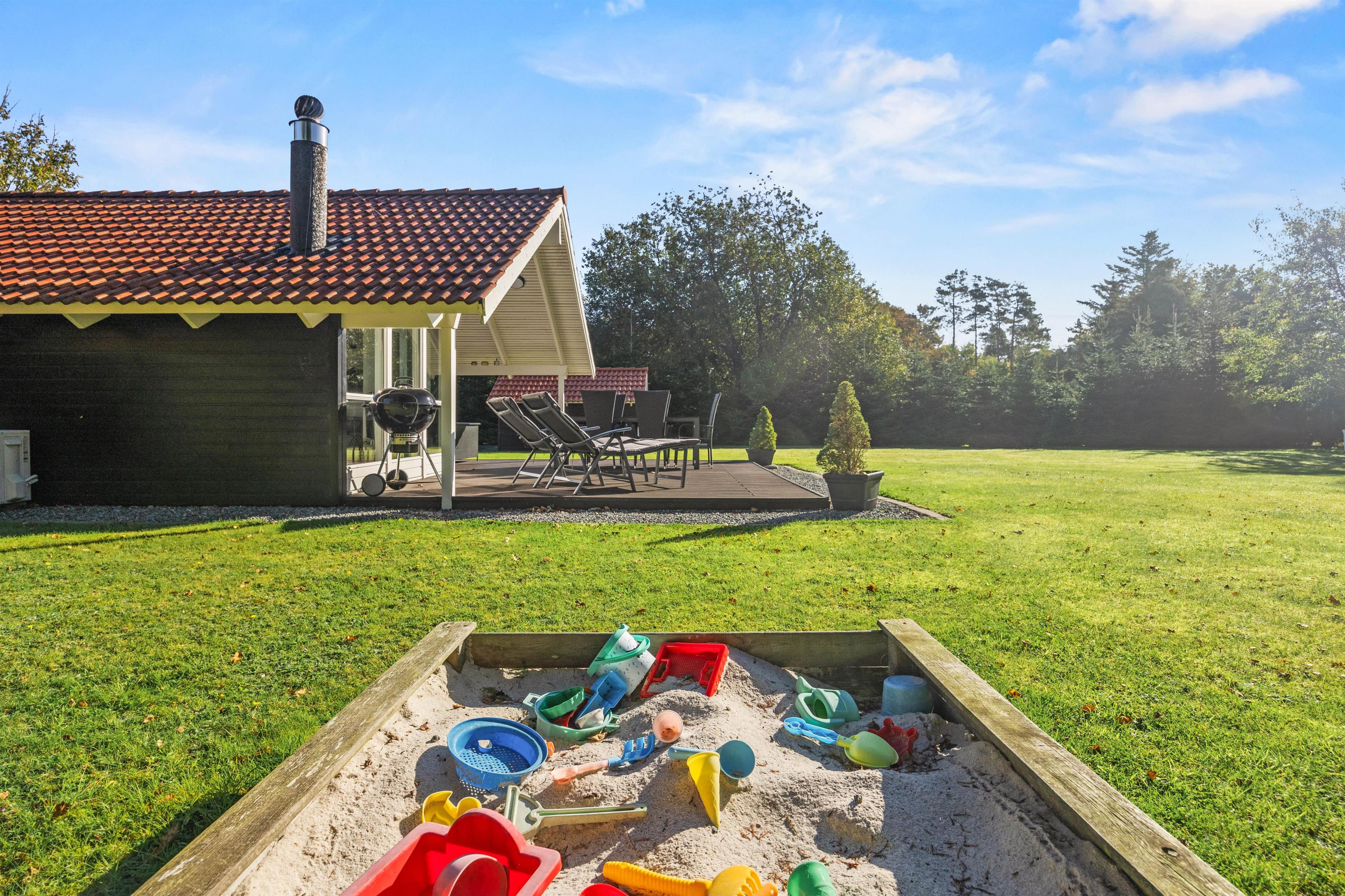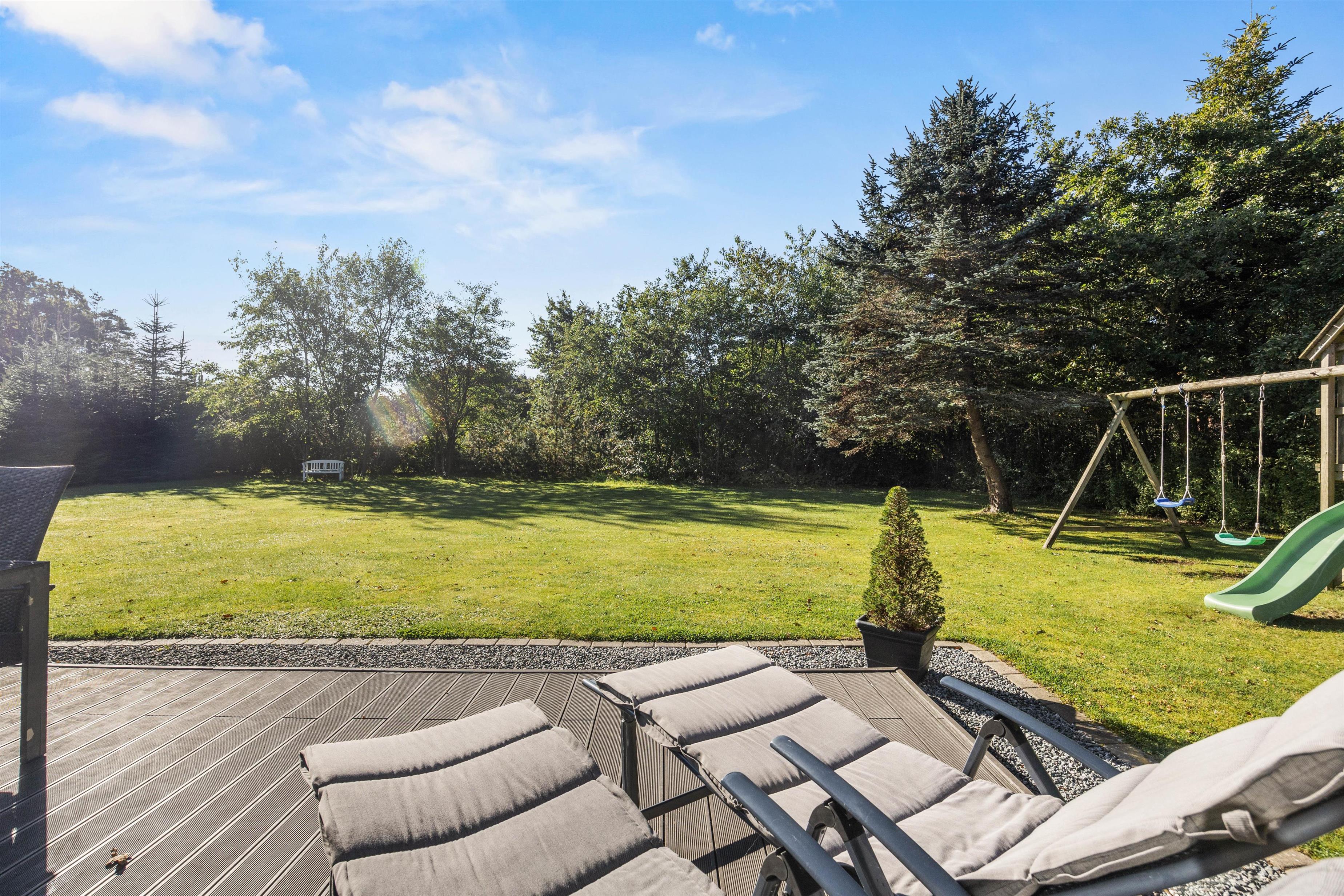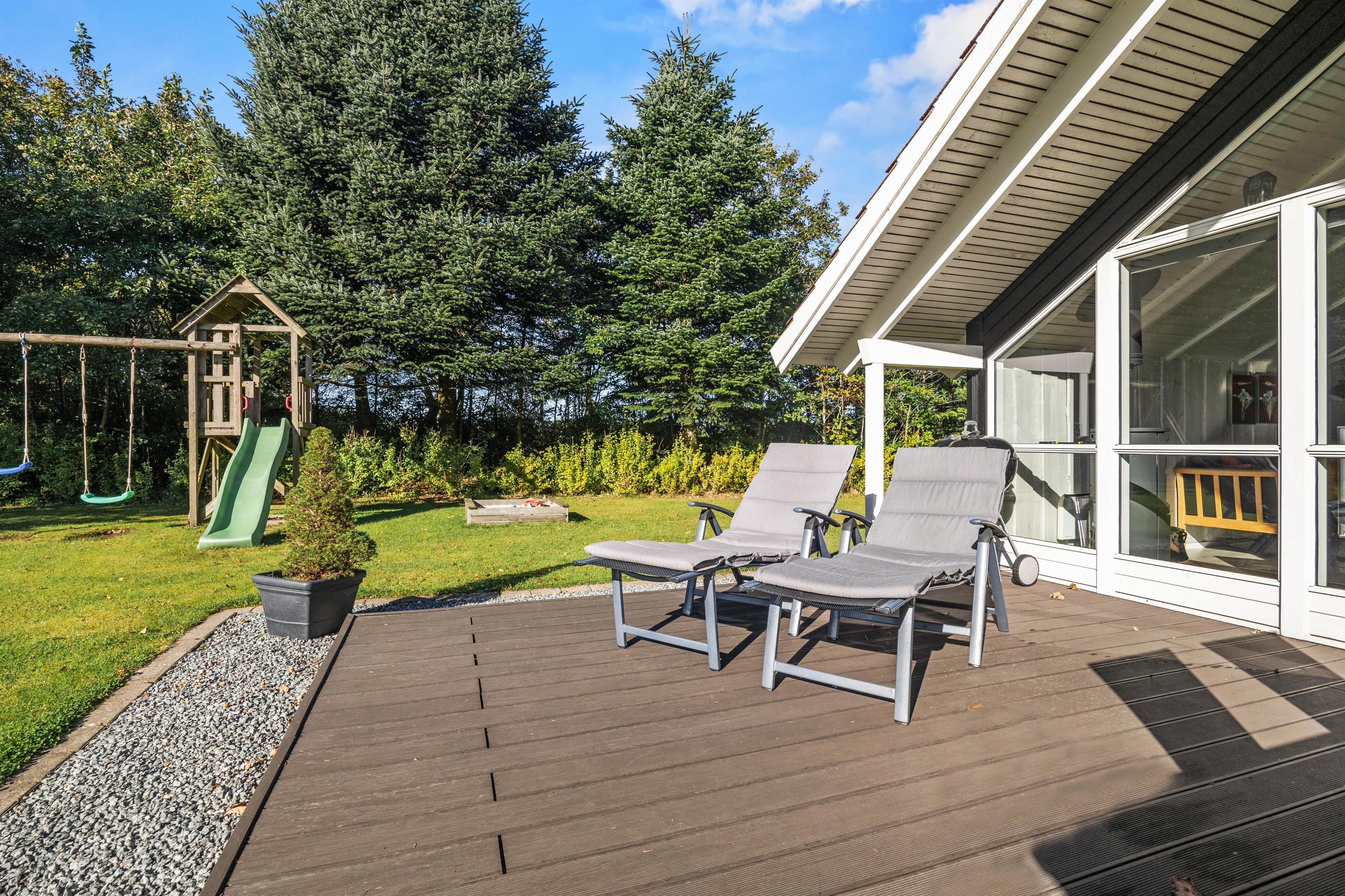 Sommerhuset ligger på en mere end 1.500 kvadratmeter stor og velholdt grund. På den delvist overdækkede terrasse kan de voksne dase i solen eller nyde et glas koldt rosé i skyggen, mens børnene tumler rundt på den store græsplæne, som tilmed har et legetårn til de yngste familiemedlemmer.