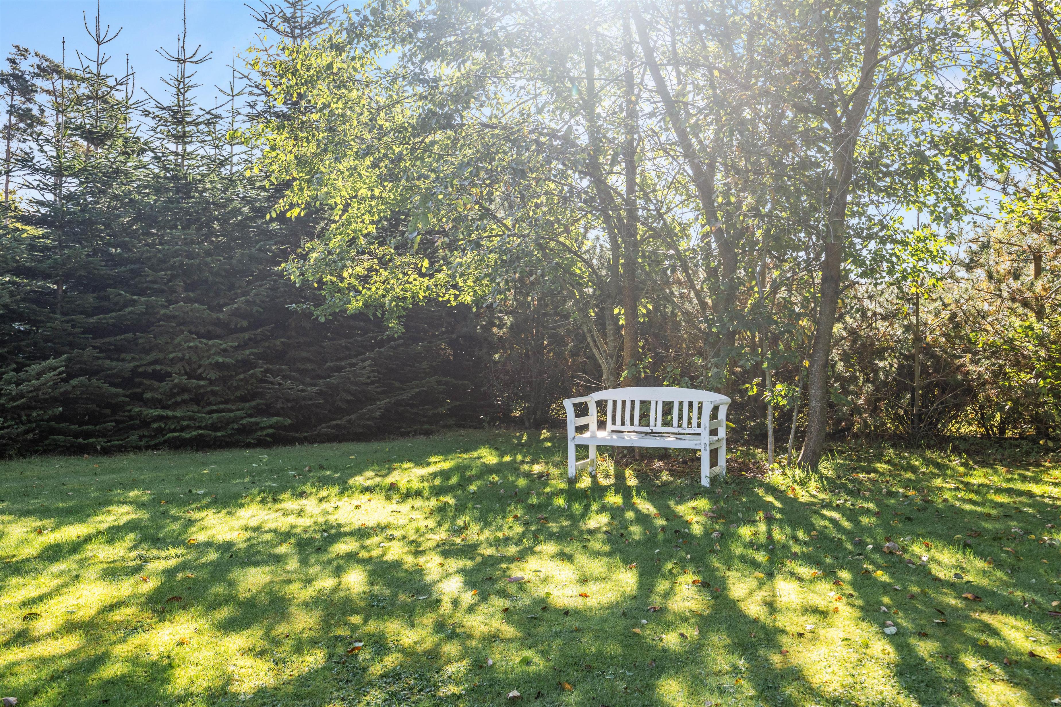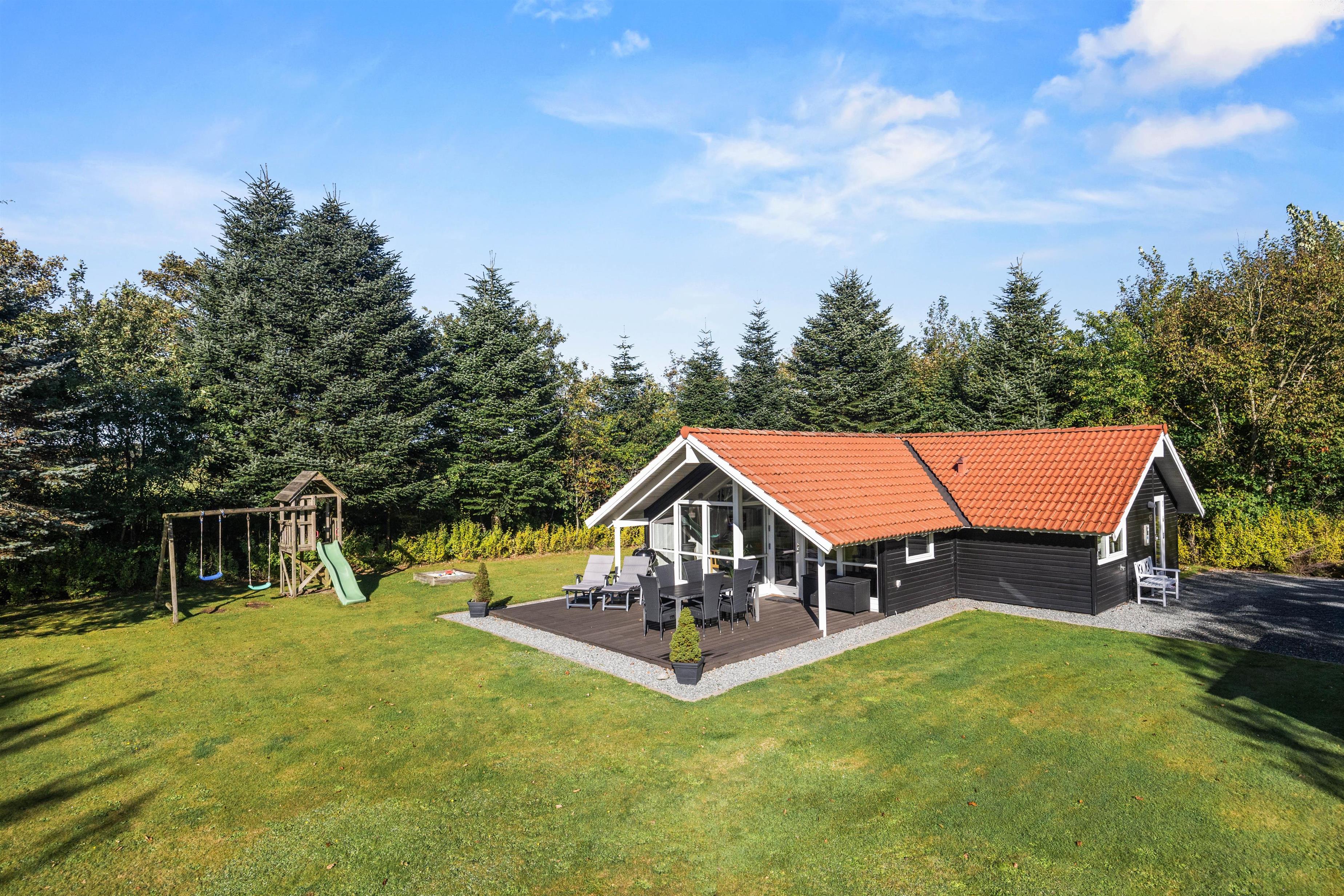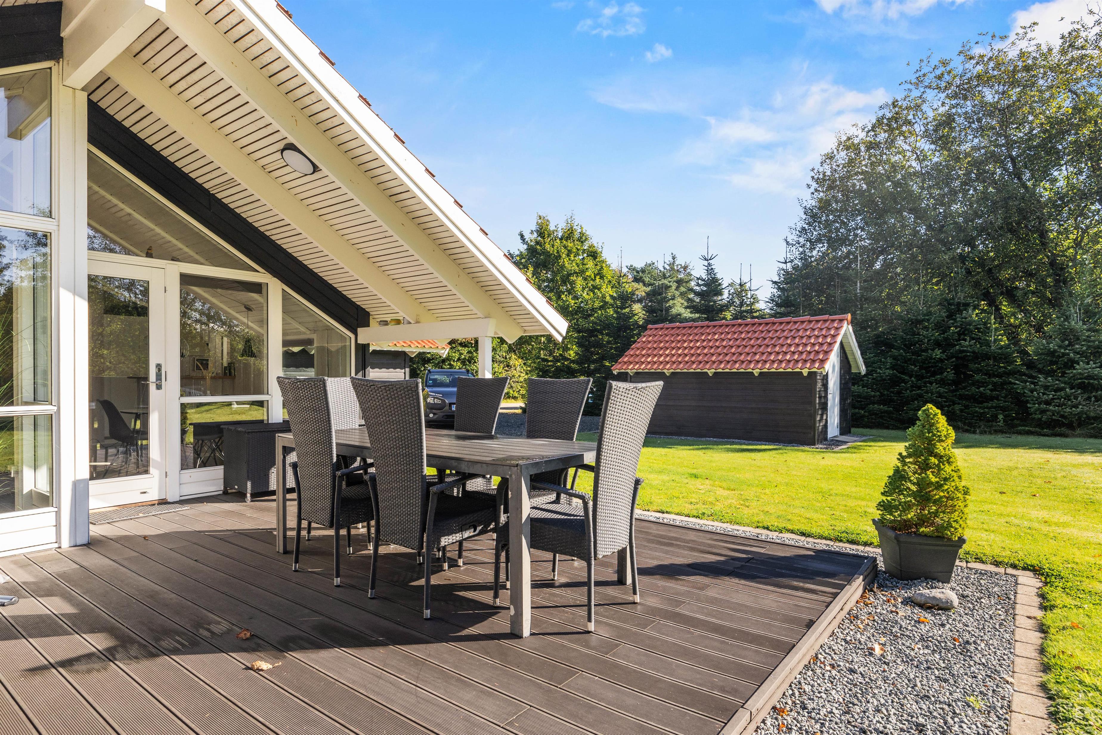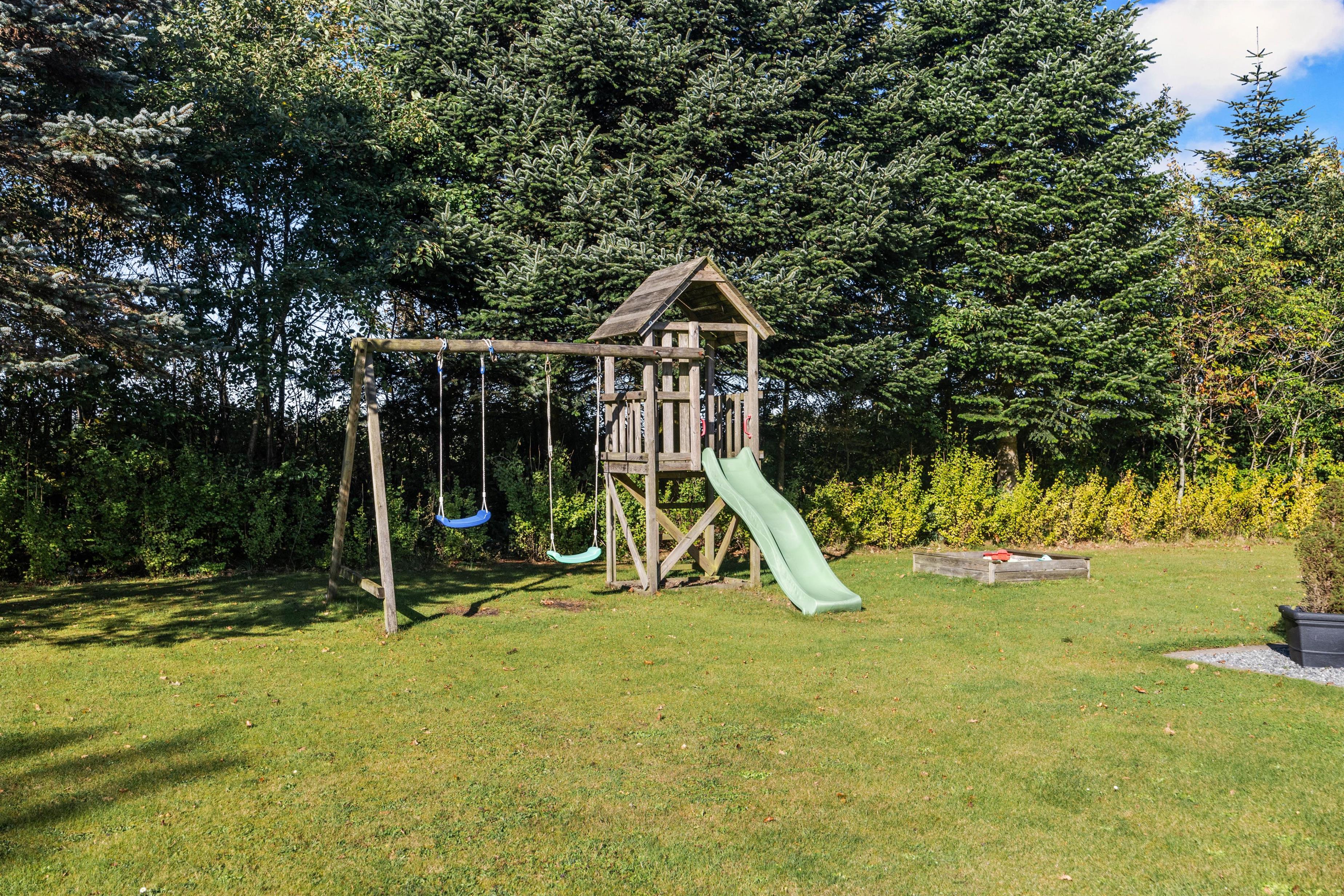 Sommerhuset ligger på en mere end 1.500 kvadratmeter stor og velholdt grund. På den delvist overdækkede terrasse kan de voksne dase i solen eller nyde et glas koldt rosé i skyggen, mens børnene tumler rundt på den store græsplæne, som tilmed har et legetårn til de yngste familiemedlemmer.