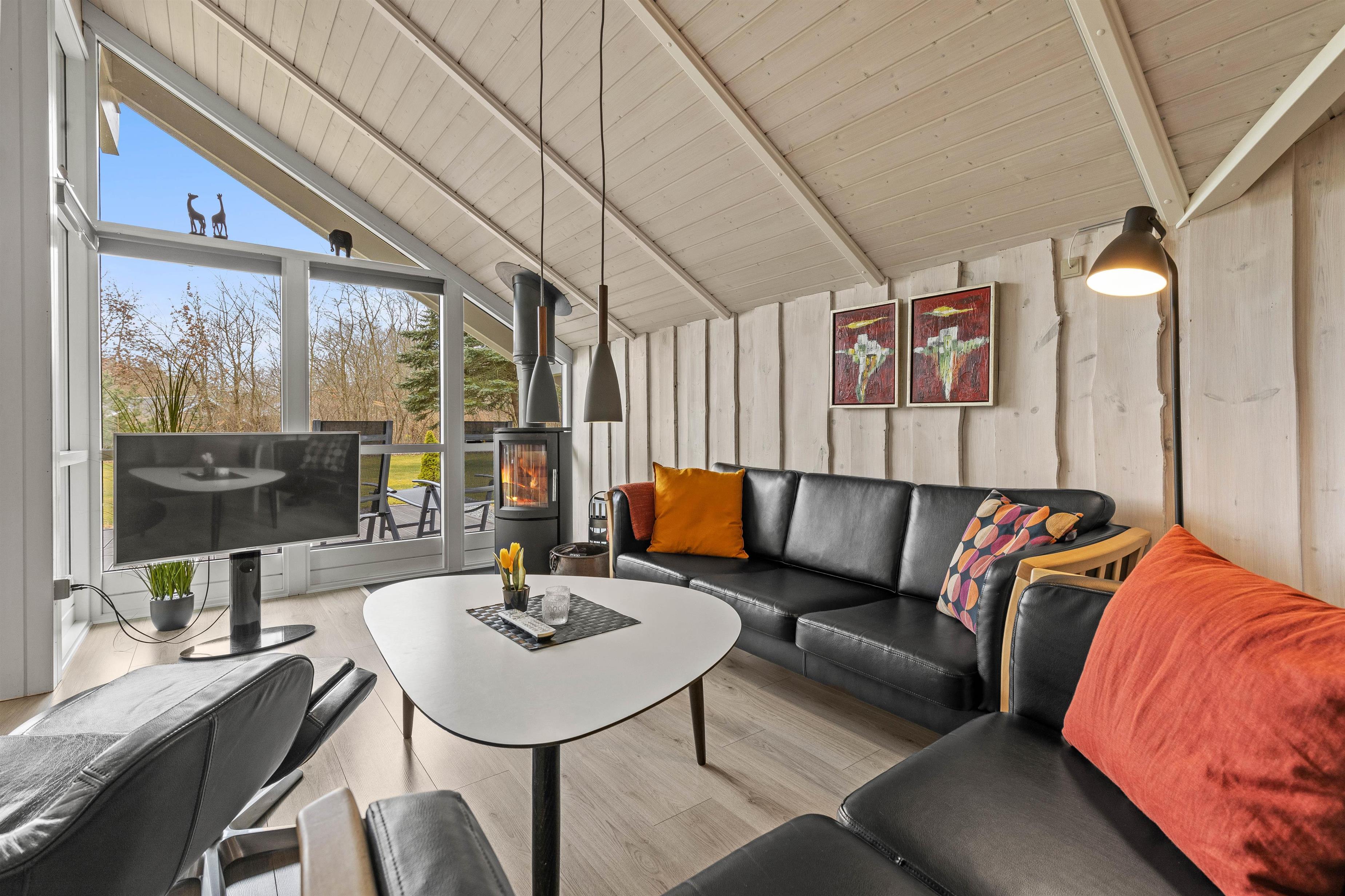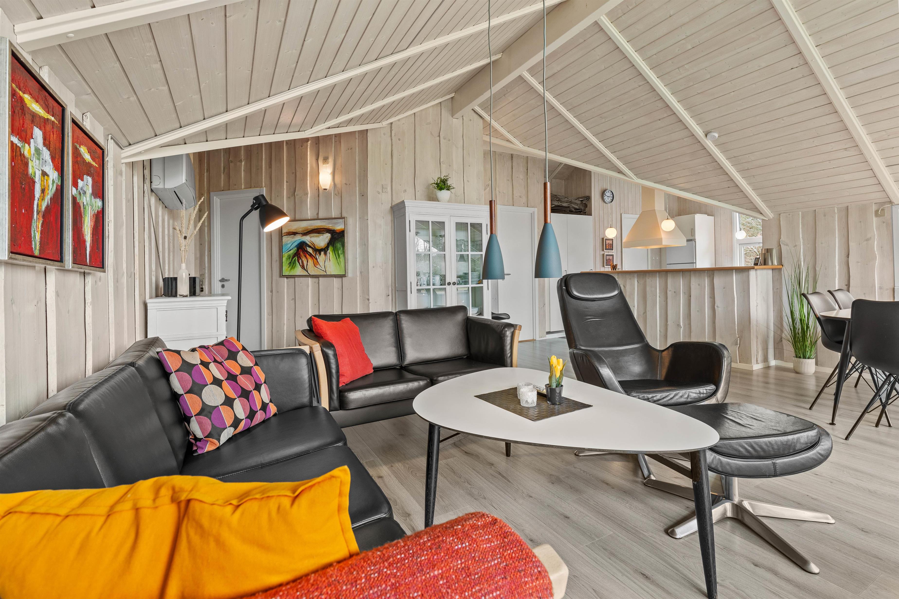 Husets hjerte er det åbne opholdsrum, der forener stue og køkkenalrum i et åbent fællesrum. Saml hele familien til lækre feriemåltider, hyggelige aftener med kortspil og snoller og sene aftener på sofaen foran den knitrende brændeovn.