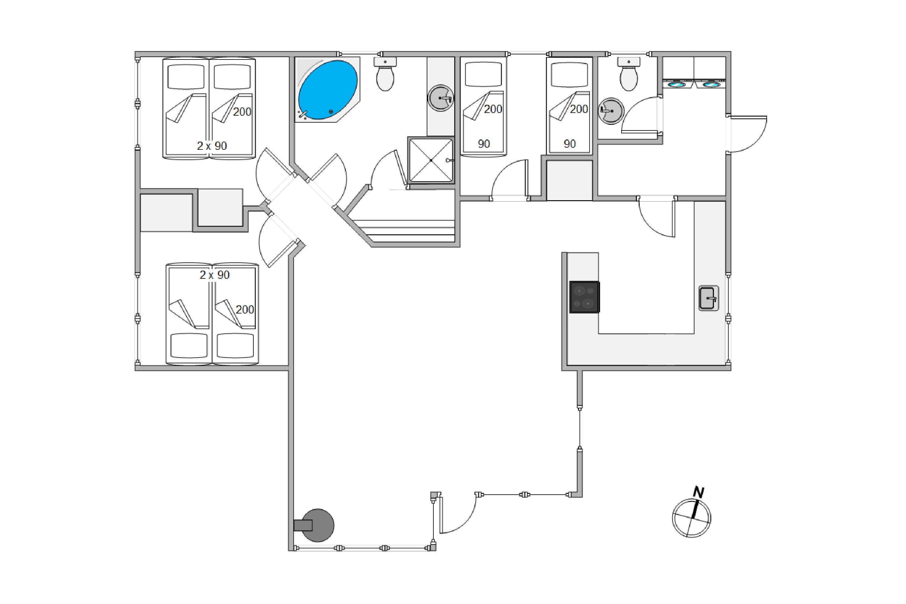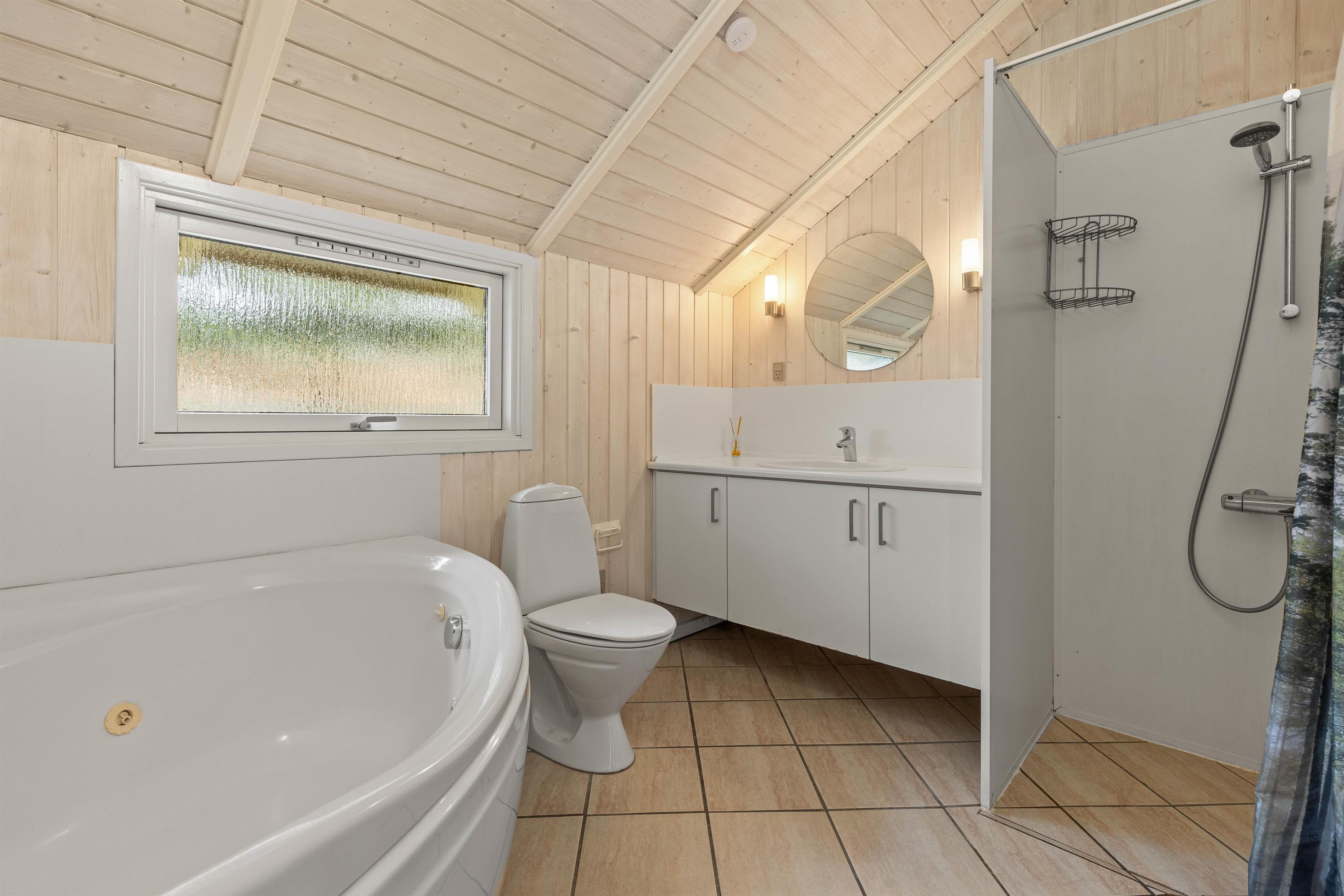 Feriehjemmet er udstyret med et stort badeværelse og et gæstetoilet - og på det store badeværelse får I jeres egen lille wellnessafdeling med sauna og spabad til 2 personer. Her bliver der tid til ekstra selvforkælelse og afslapning på de skønne feriedage.
