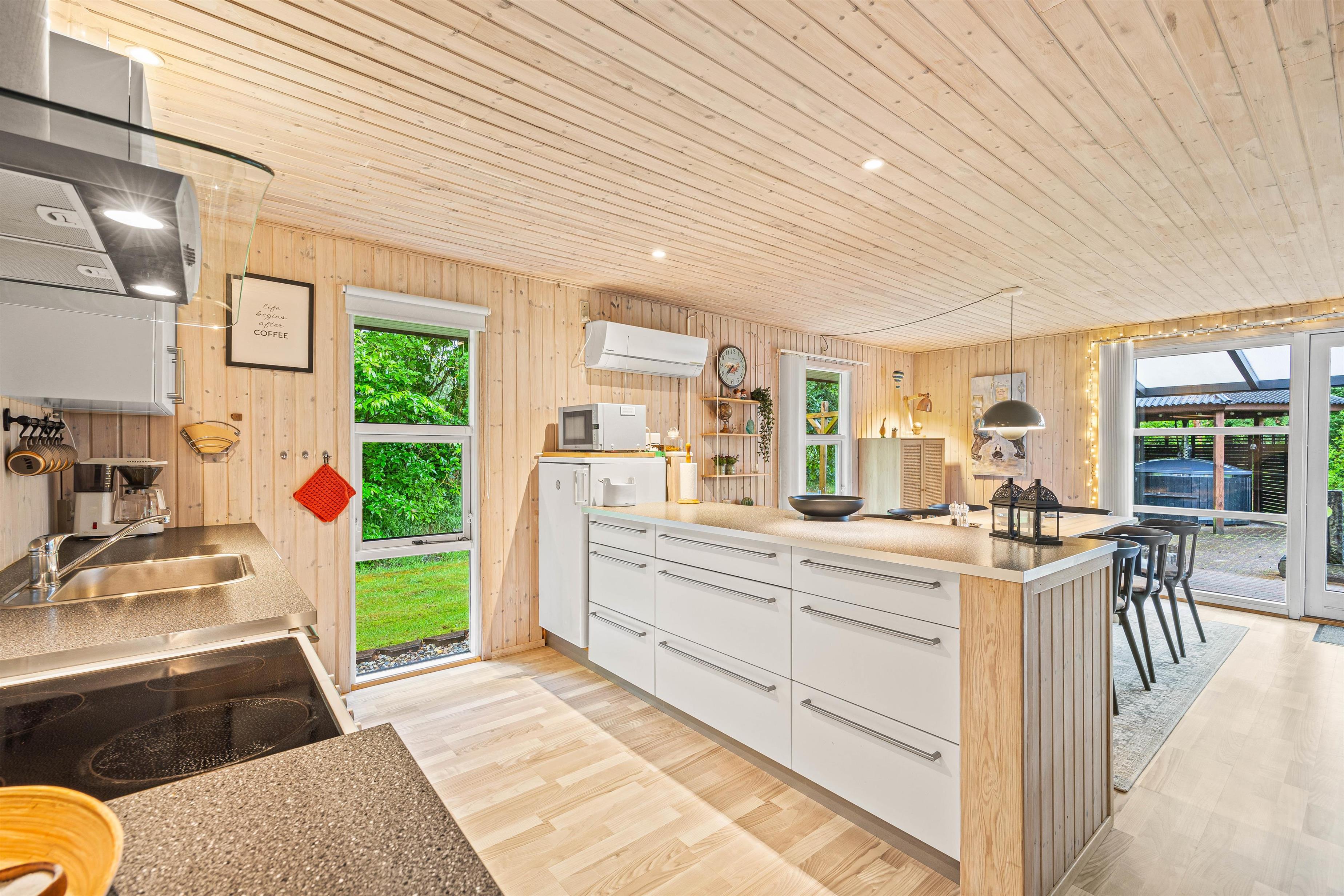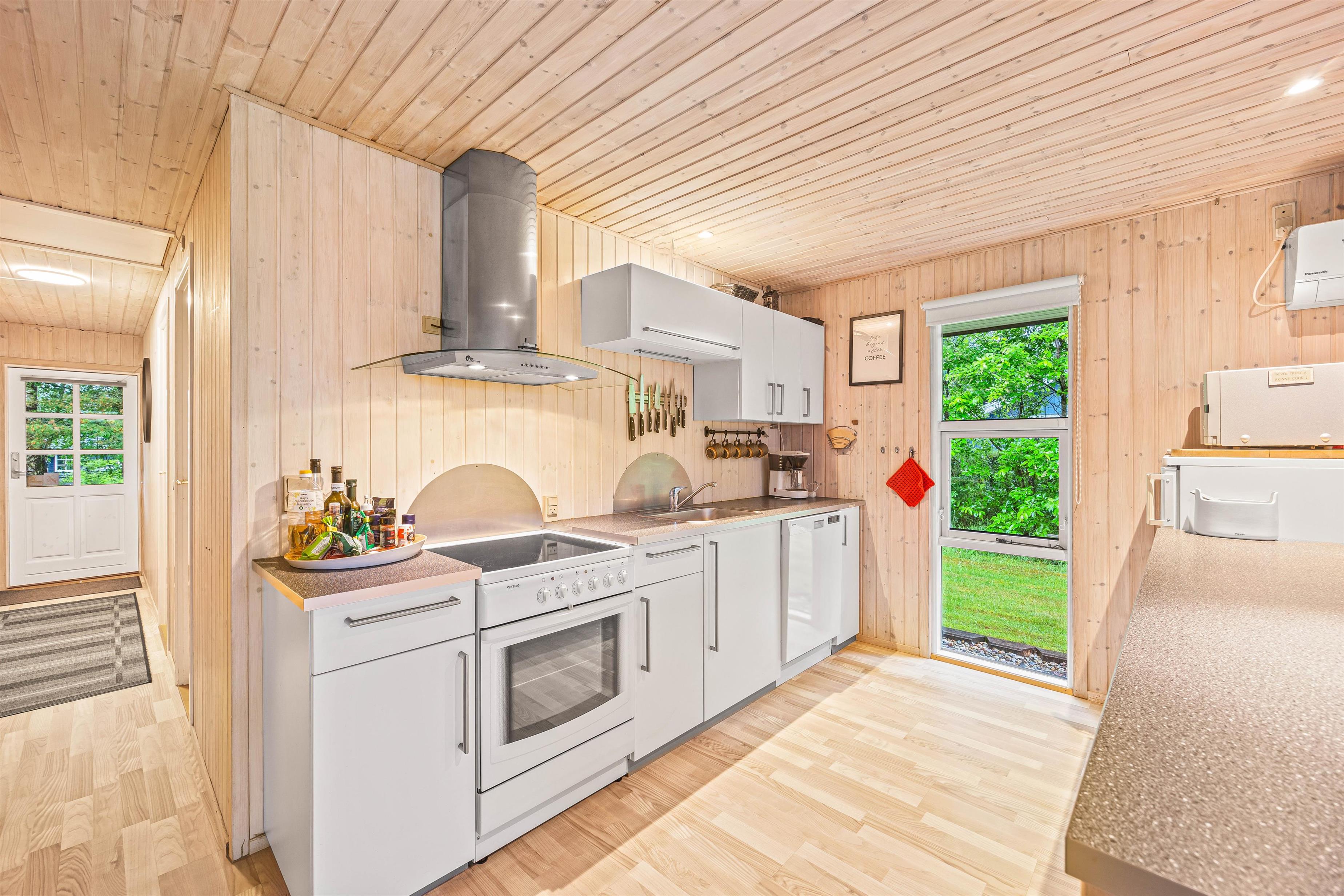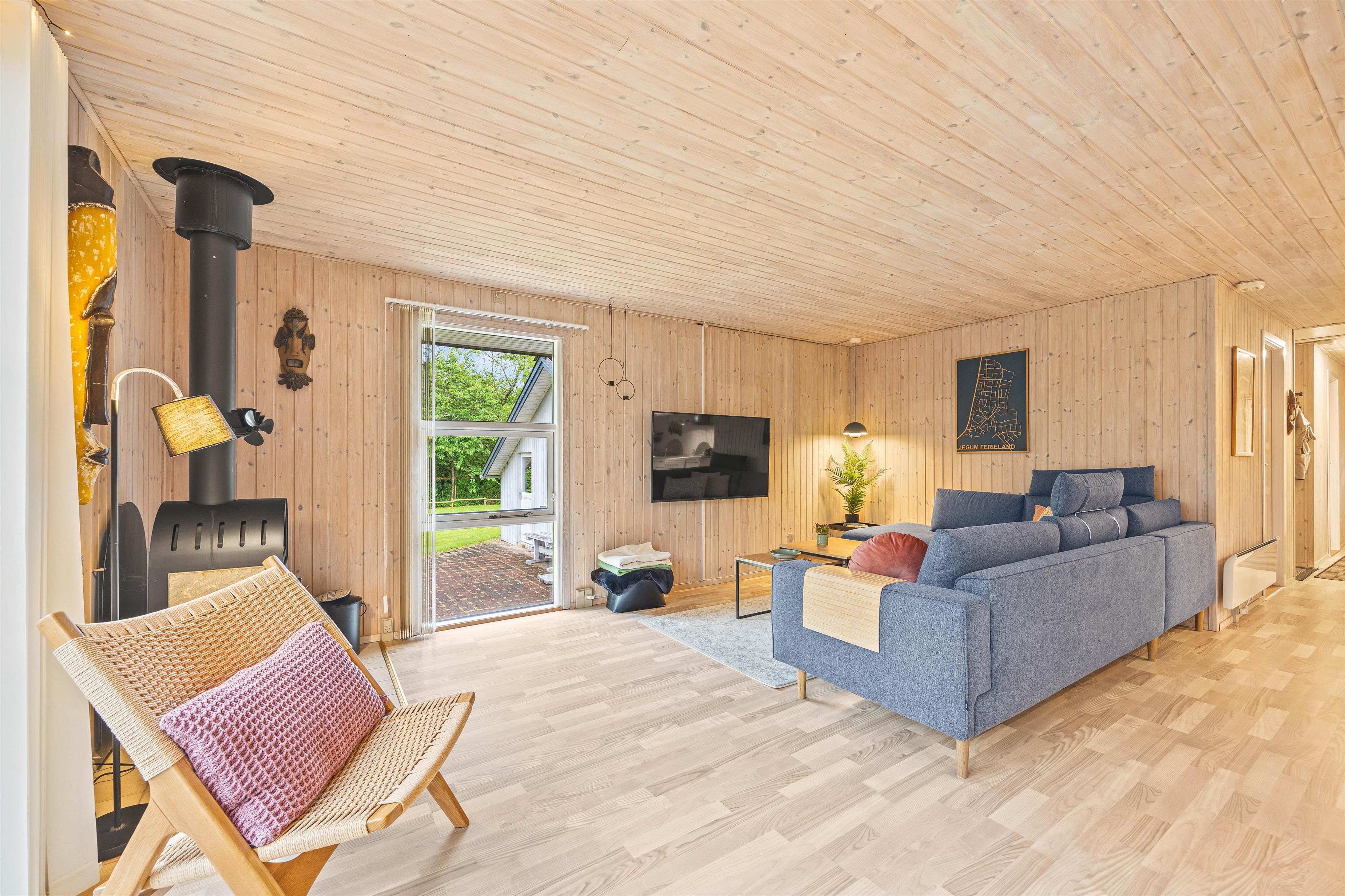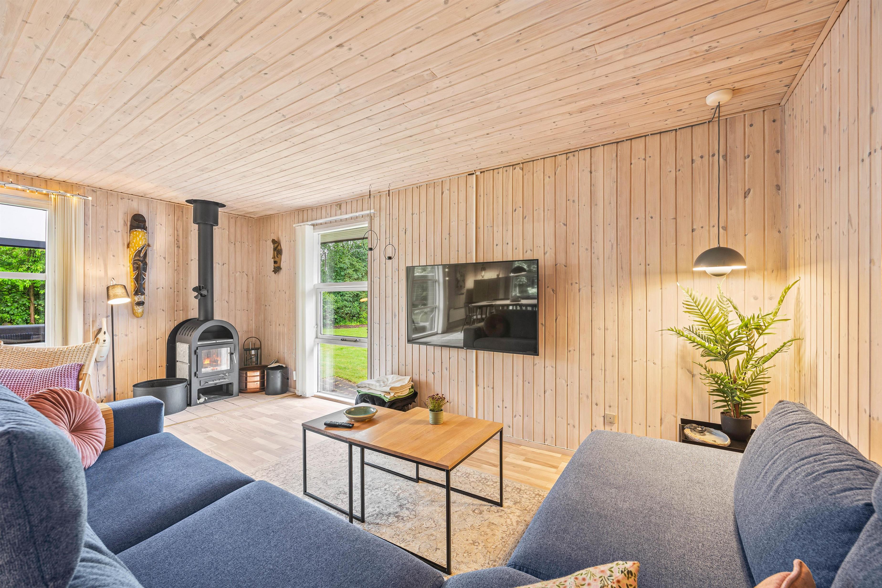 Køkkenet er udstyret med en opvaskemaskine, så oprydningen efter måltider er nem, og I hurtigt kan komme tilbage til hyggen. Stuen har en hyggelig brændeovn, som skaber en dejlig atmosfære på de kølige aftener.