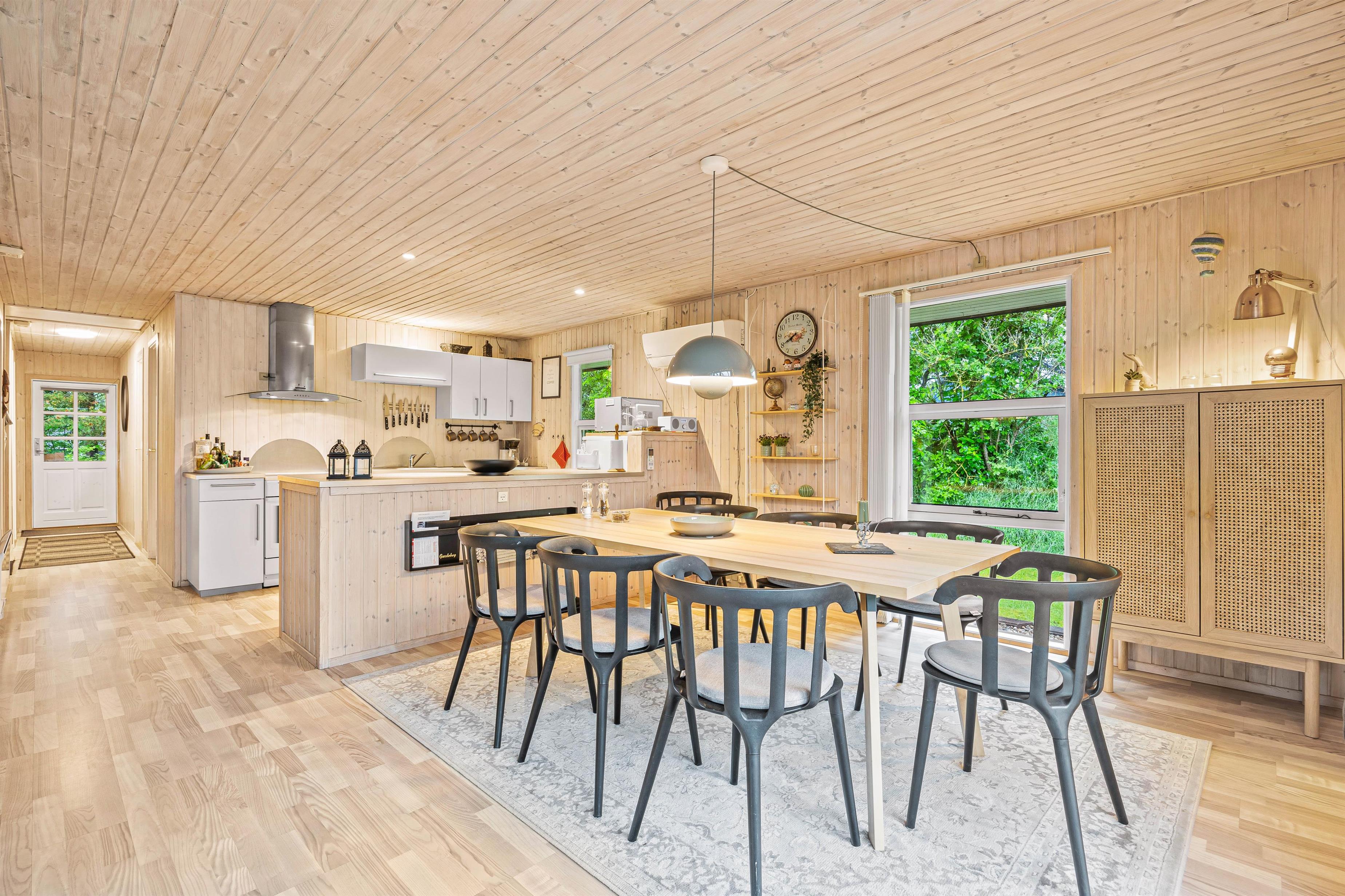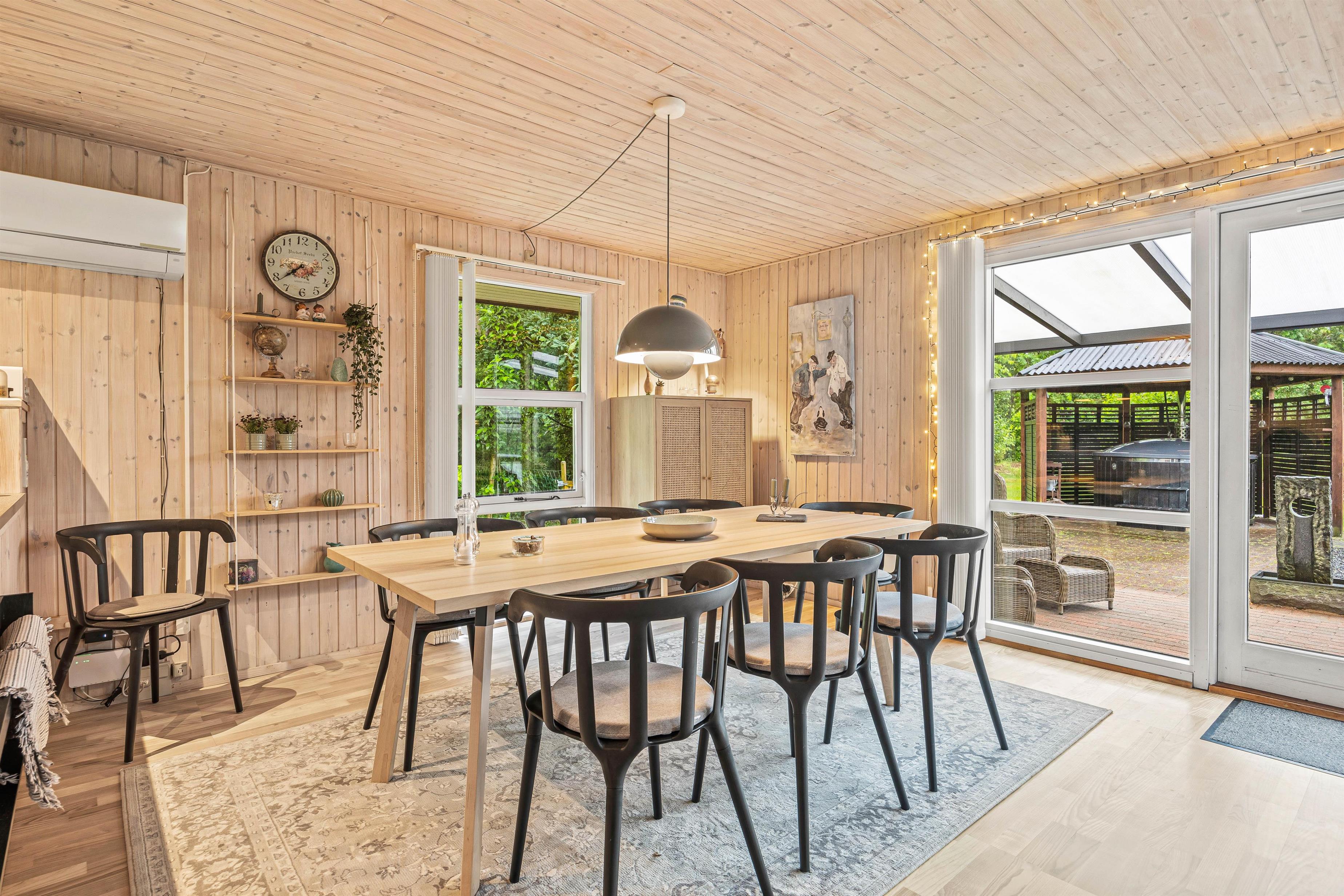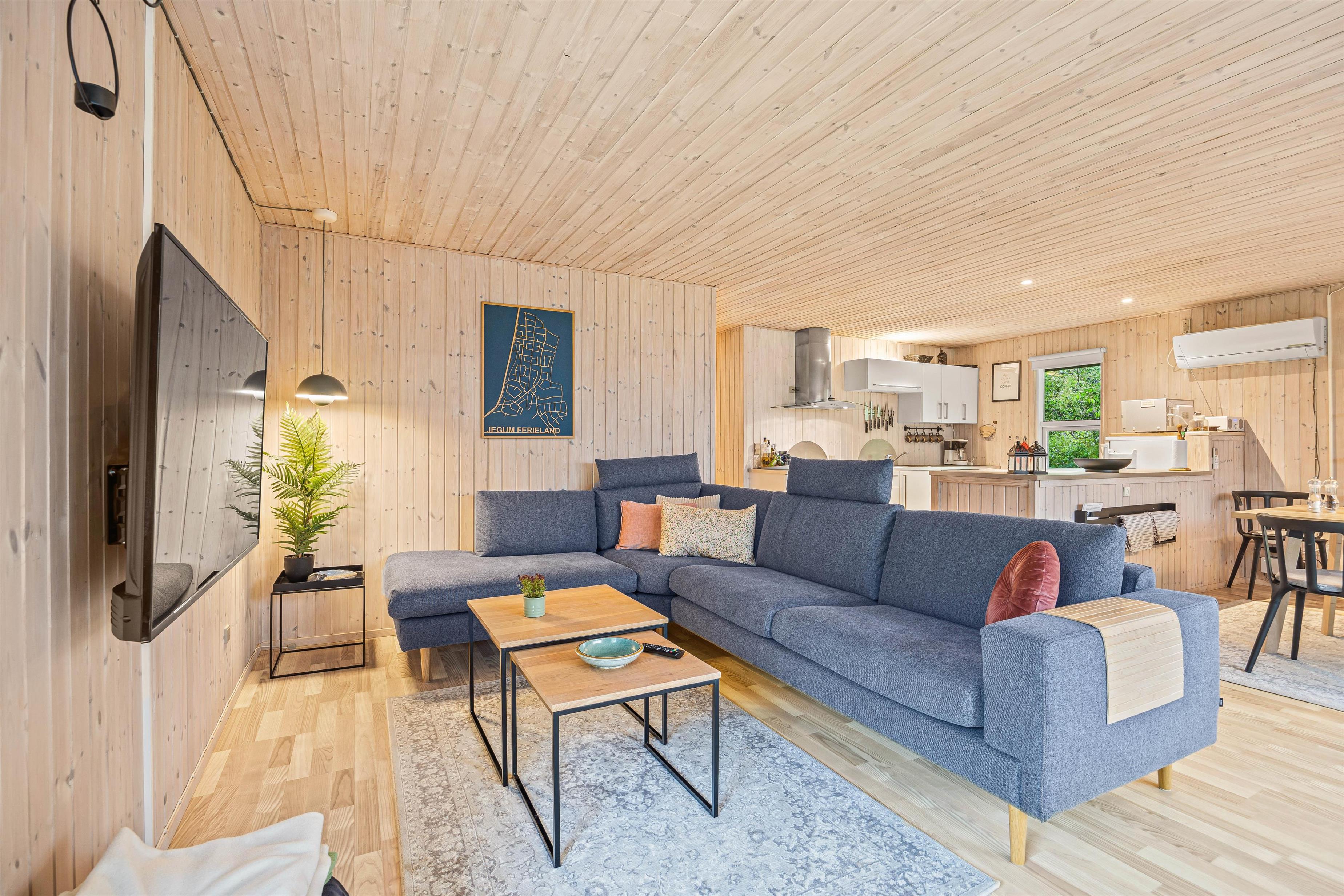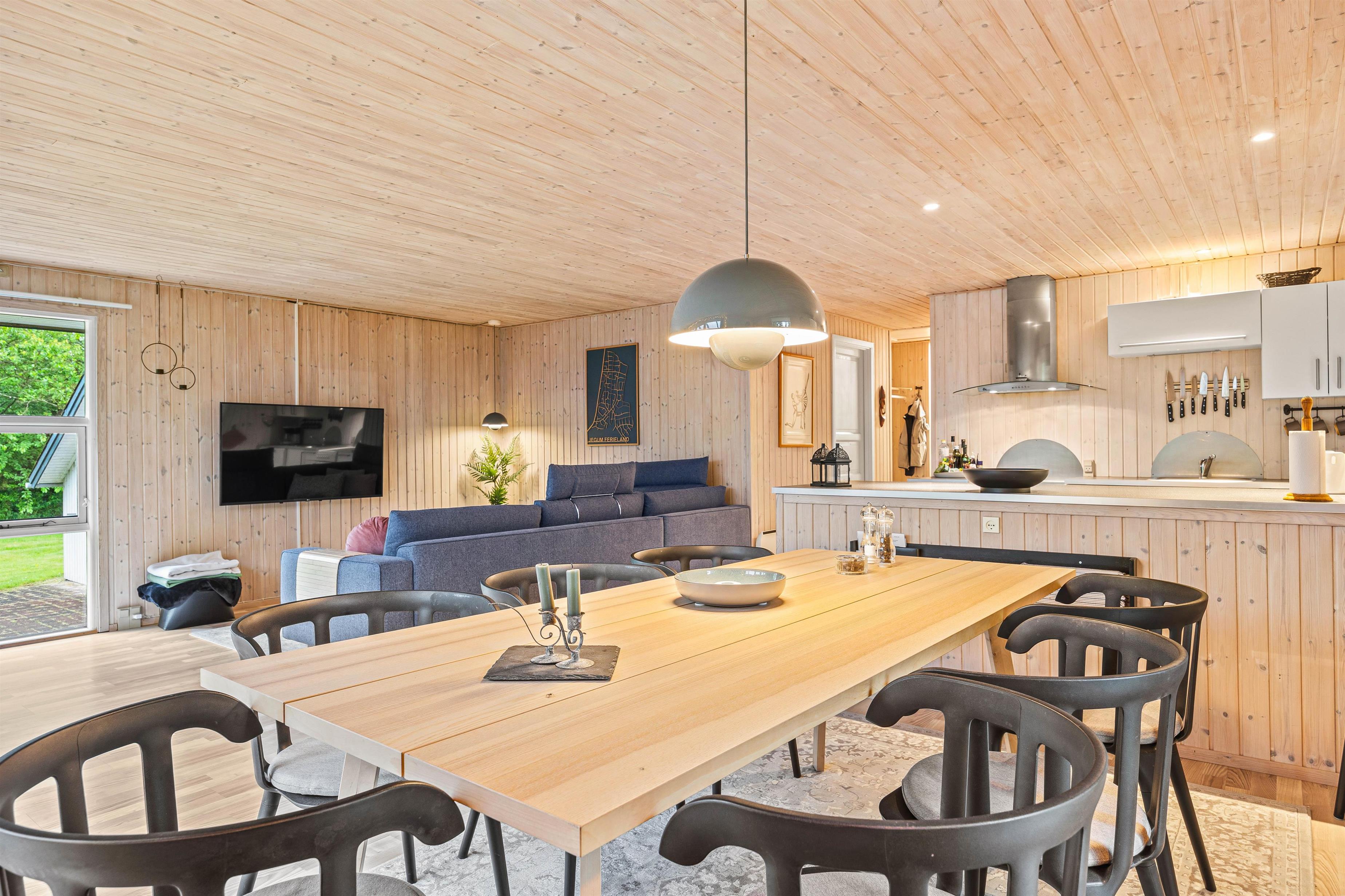 Køkkenet er udstyret med en opvaskemaskine, så oprydningen efter måltider er nem, og I hurtigt kan komme tilbage til hyggen. Stuen har en hyggelig brændeovn, som skaber en dejlig atmosfære på de kølige aftener.