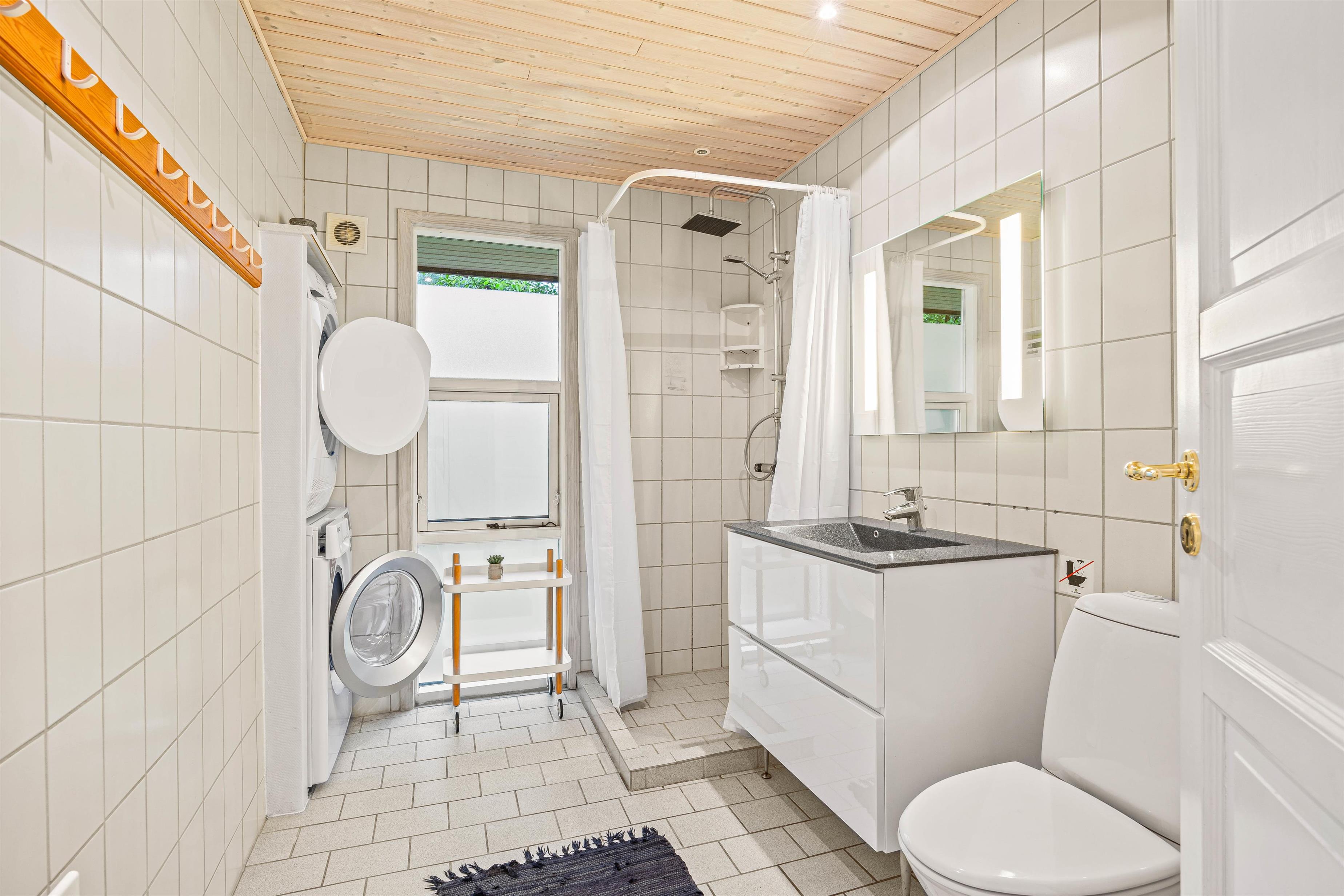 Badeværelset, som er udstyret med gulvvarme, byder på både vaskemaskine og tørretumbler, så I kan holde tøjet rent og tørt gennem hele jeres ophold. Med moderne faciliteter og en hyggelig atmosfære indenfor, er sommerhuset godt rustet til at give jer en behagelig ferieoplevelse.