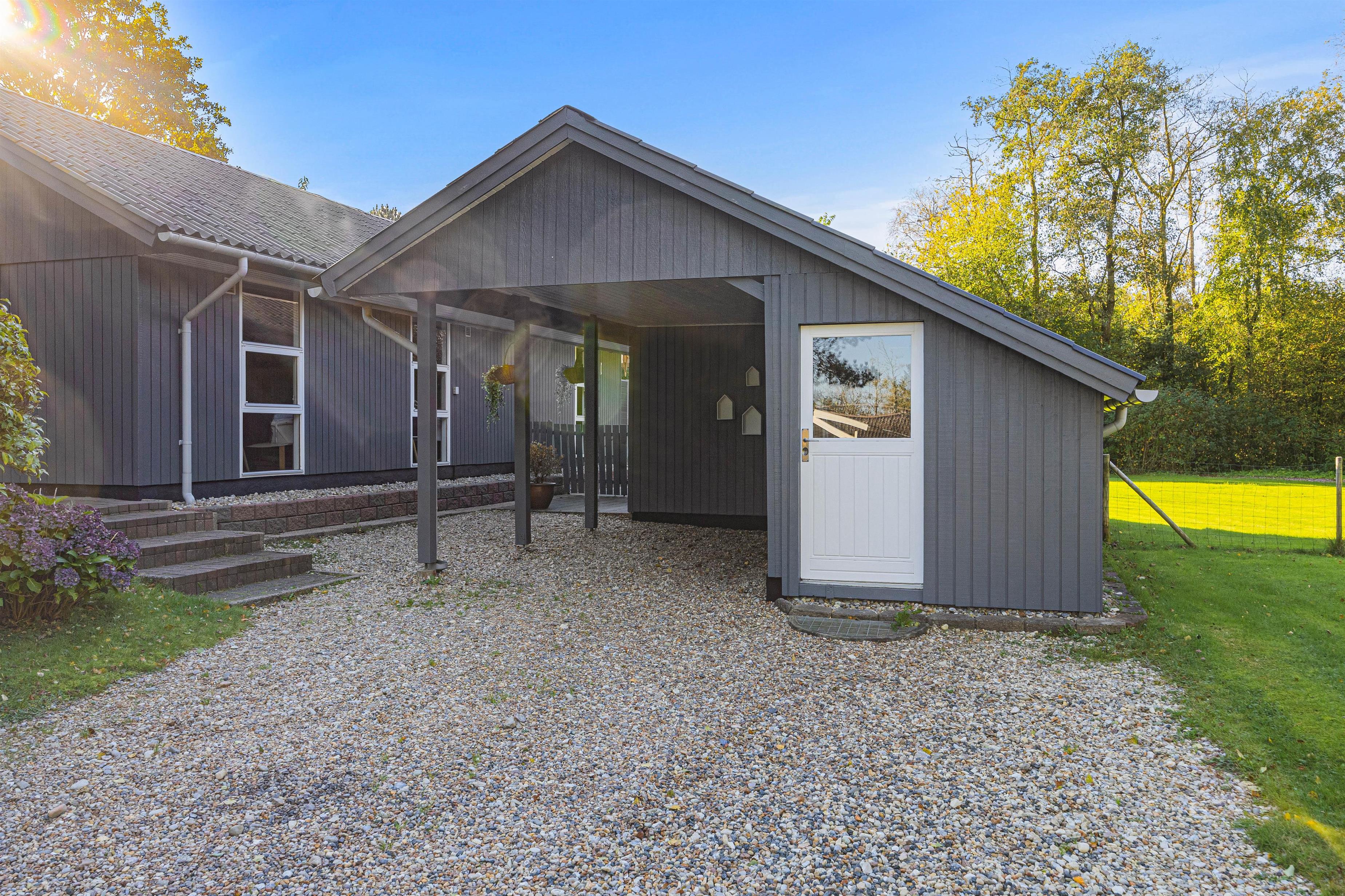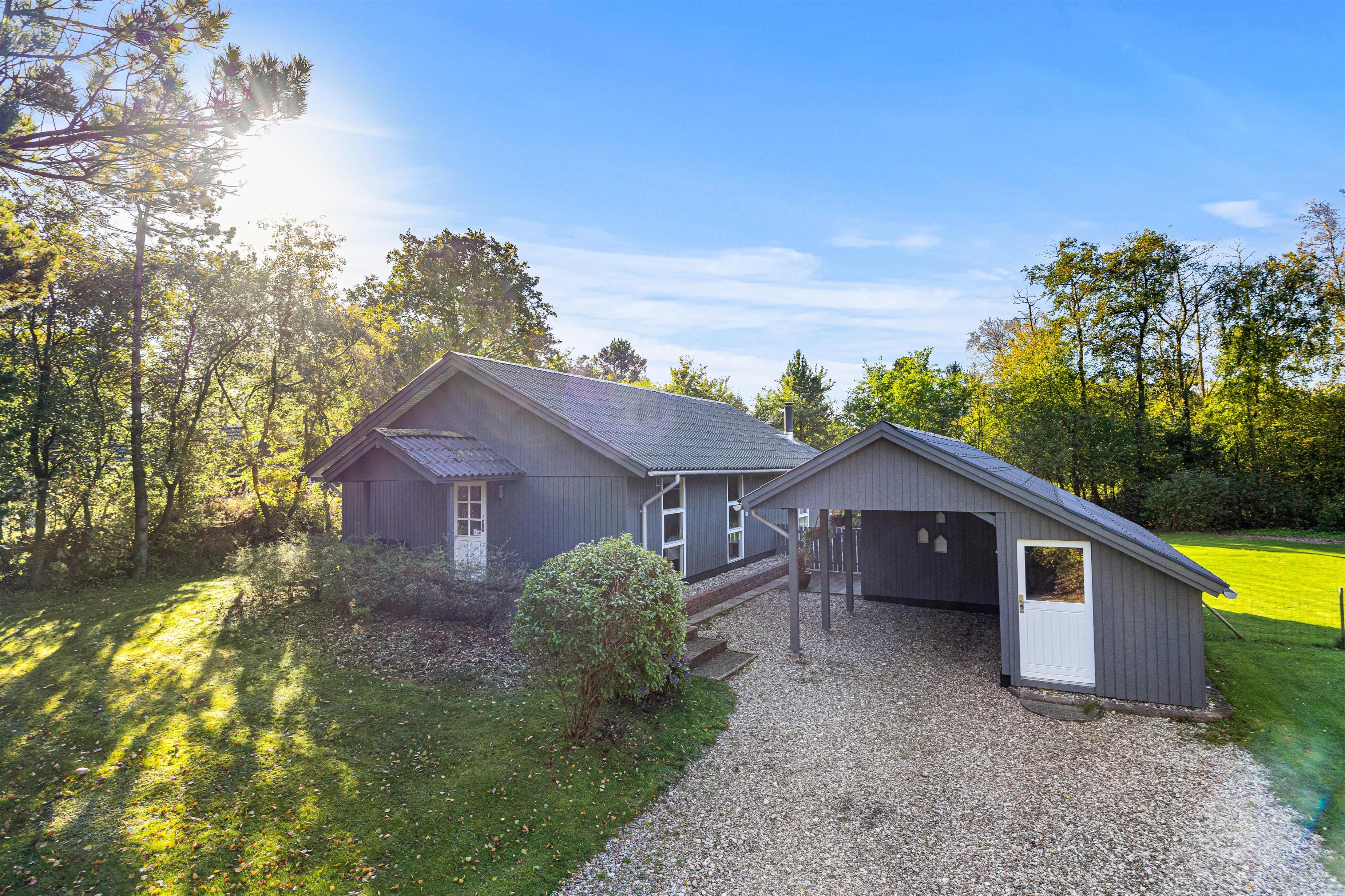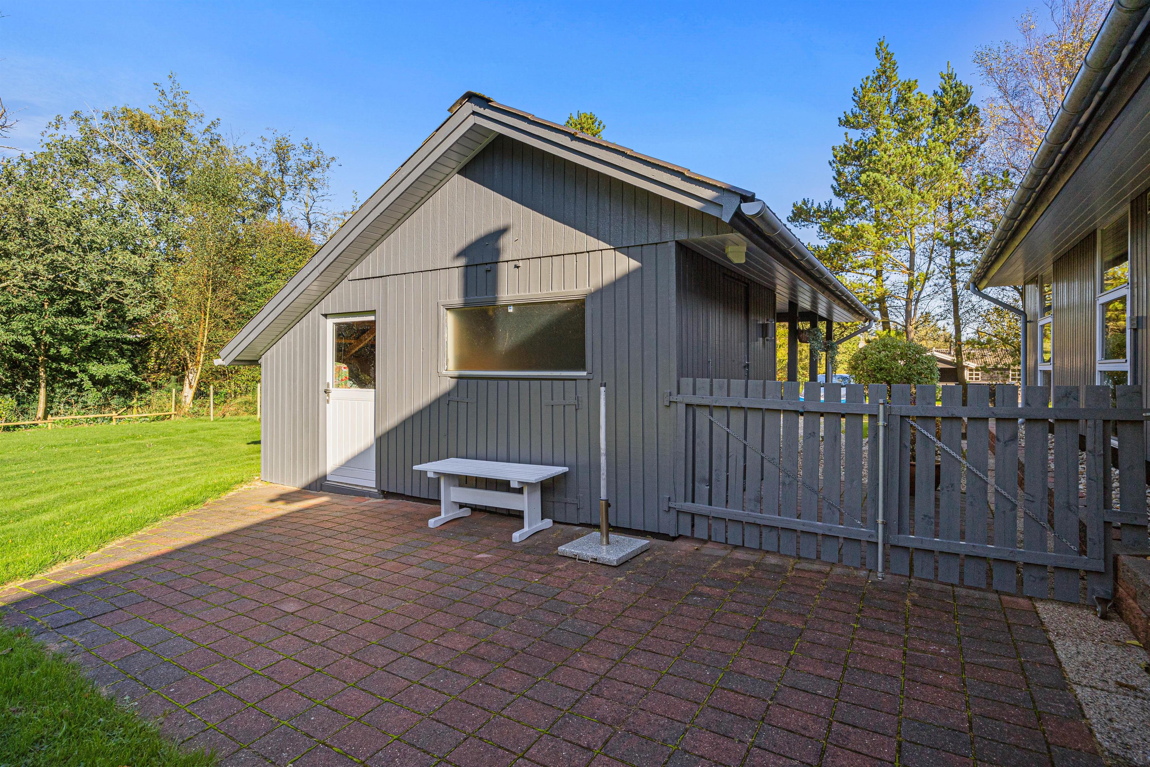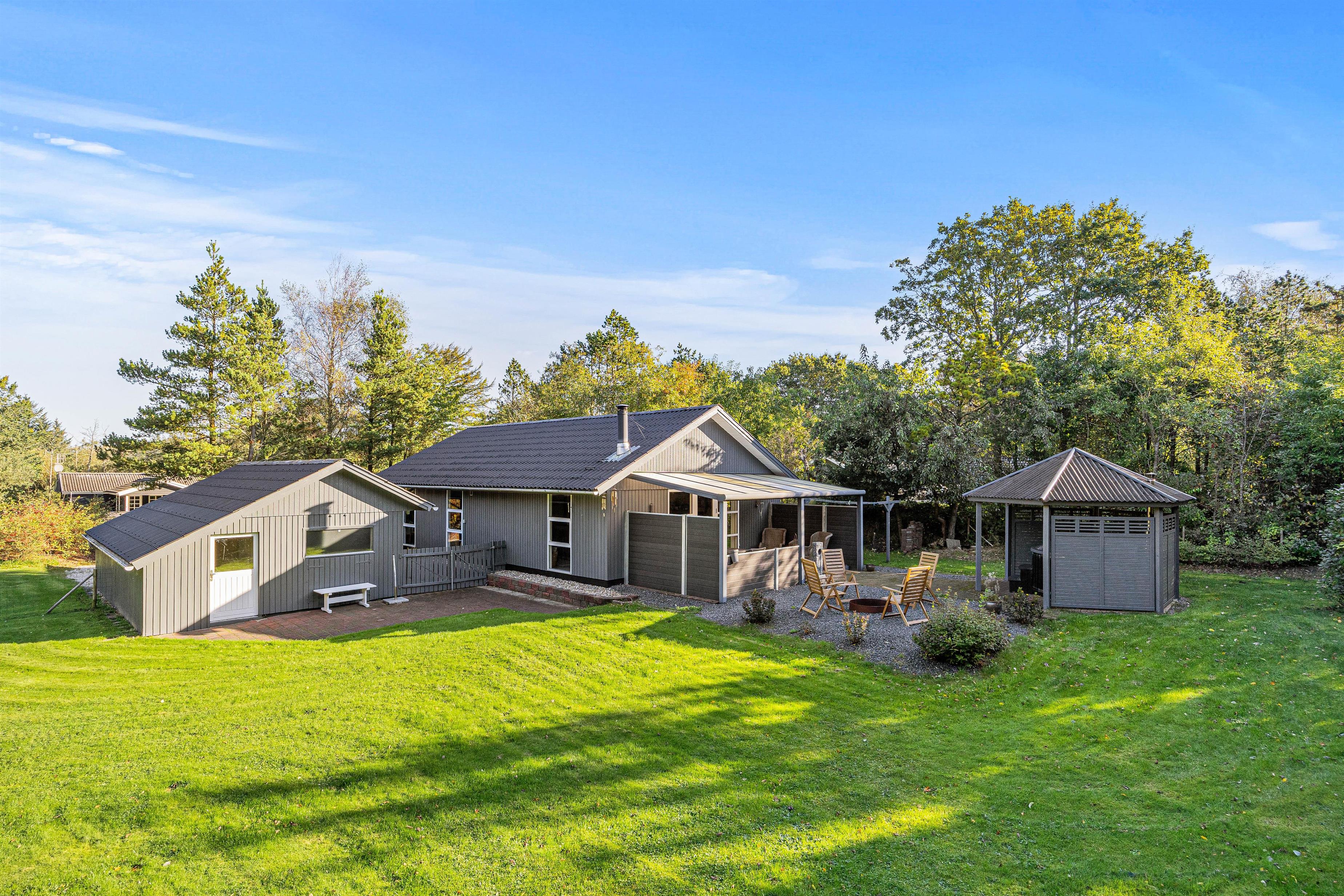 Fra stuen kan I træde direkte ud på terrassen, hvor I finder både havemøbler, grill og parasol, som inviterer til hyggelige aftener med mad under åben himmel. Sommerhuset er beliggende på en stor, 1600 kvadratmeter plænegrund, som giver masser af plads til leg og afslapning. Der er flere terrasser rundt om huset, så der er altid en plads i solen, hvor I kan nyde morgenkaffen.
