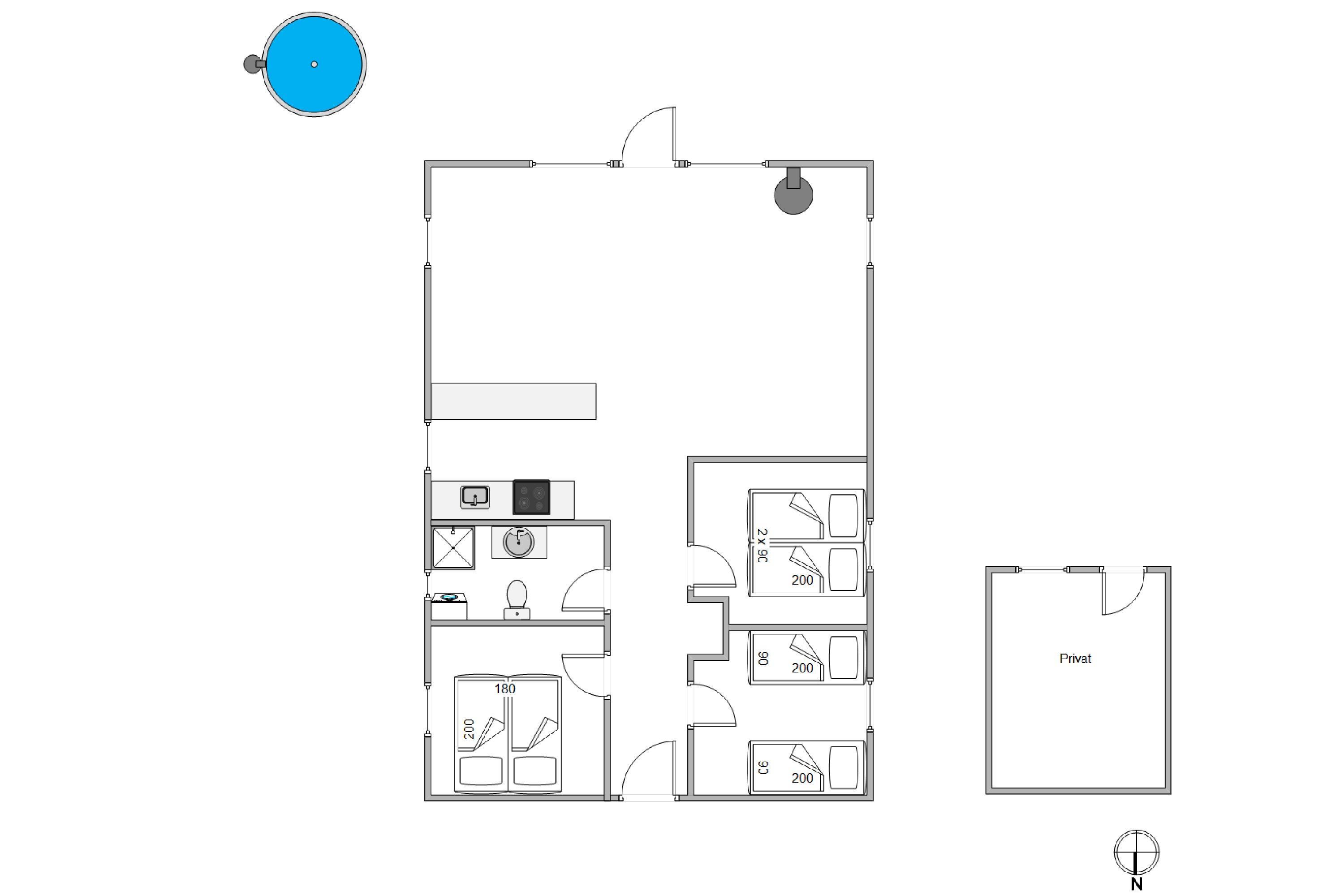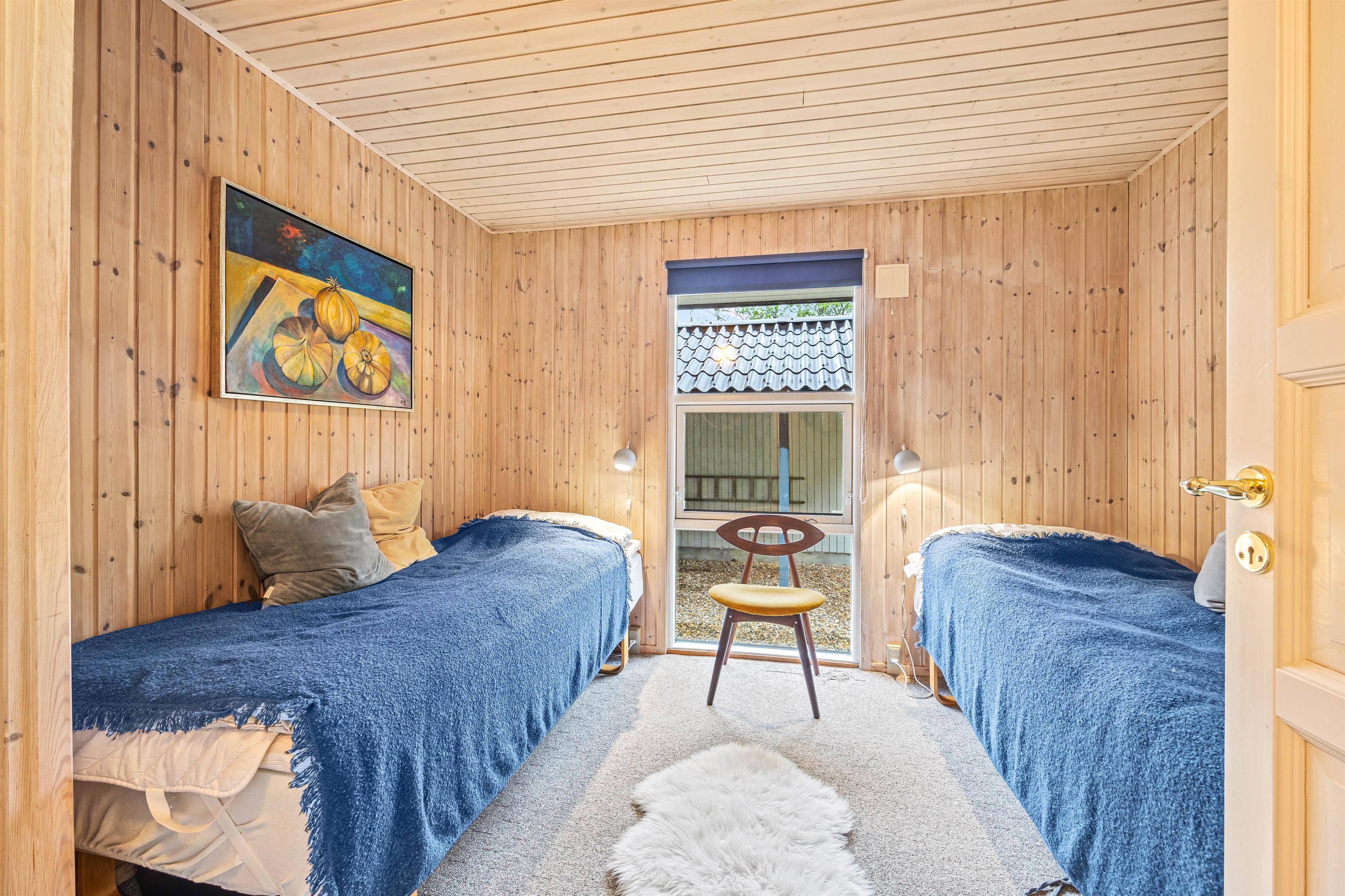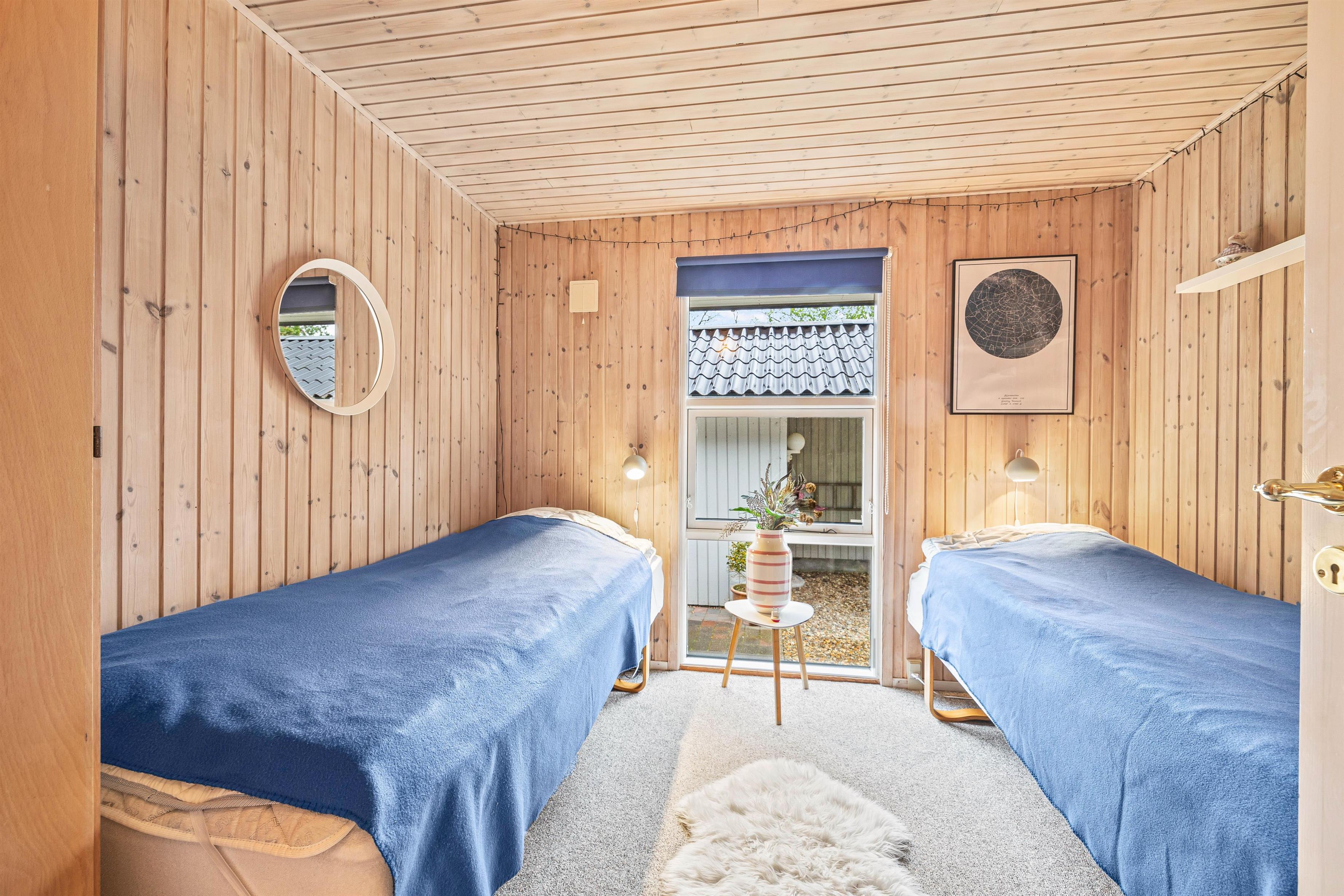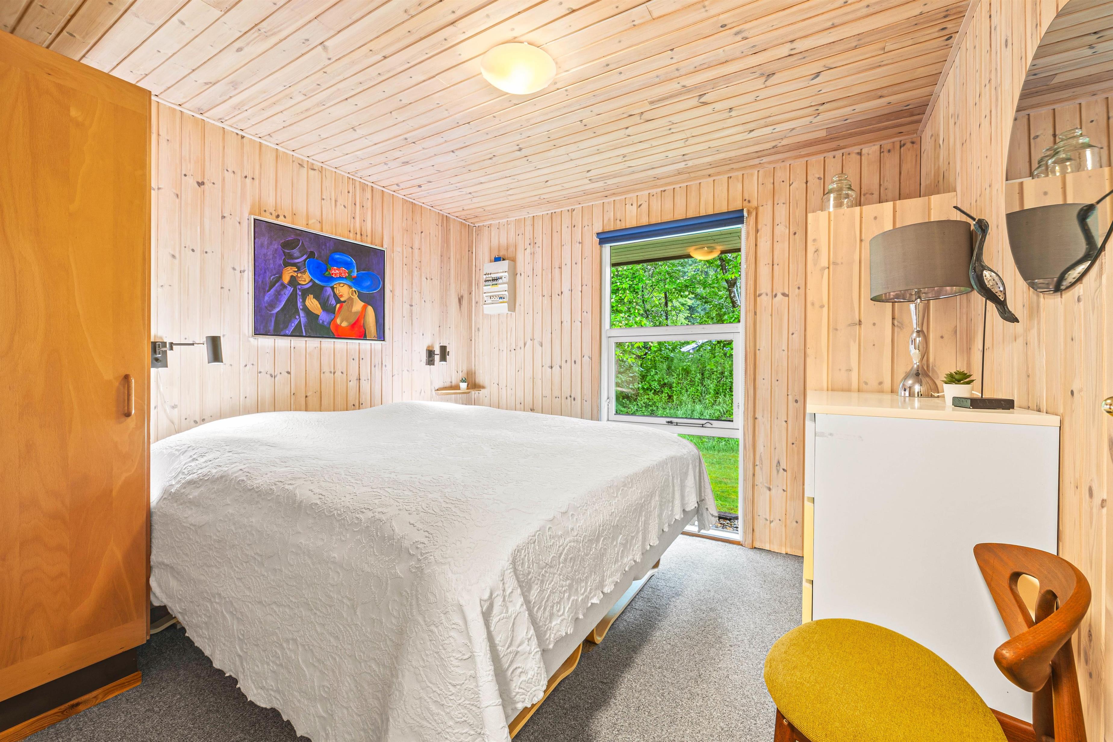I sommerhuset er der tre soveværelser. Ét af disse har en stor dobbeltseng, mens de to andre soveværelser er udstyret med to enkeltsenge hver. Denne inddeling er perfekt til børnefamilier, hvor der er plads til alle.
