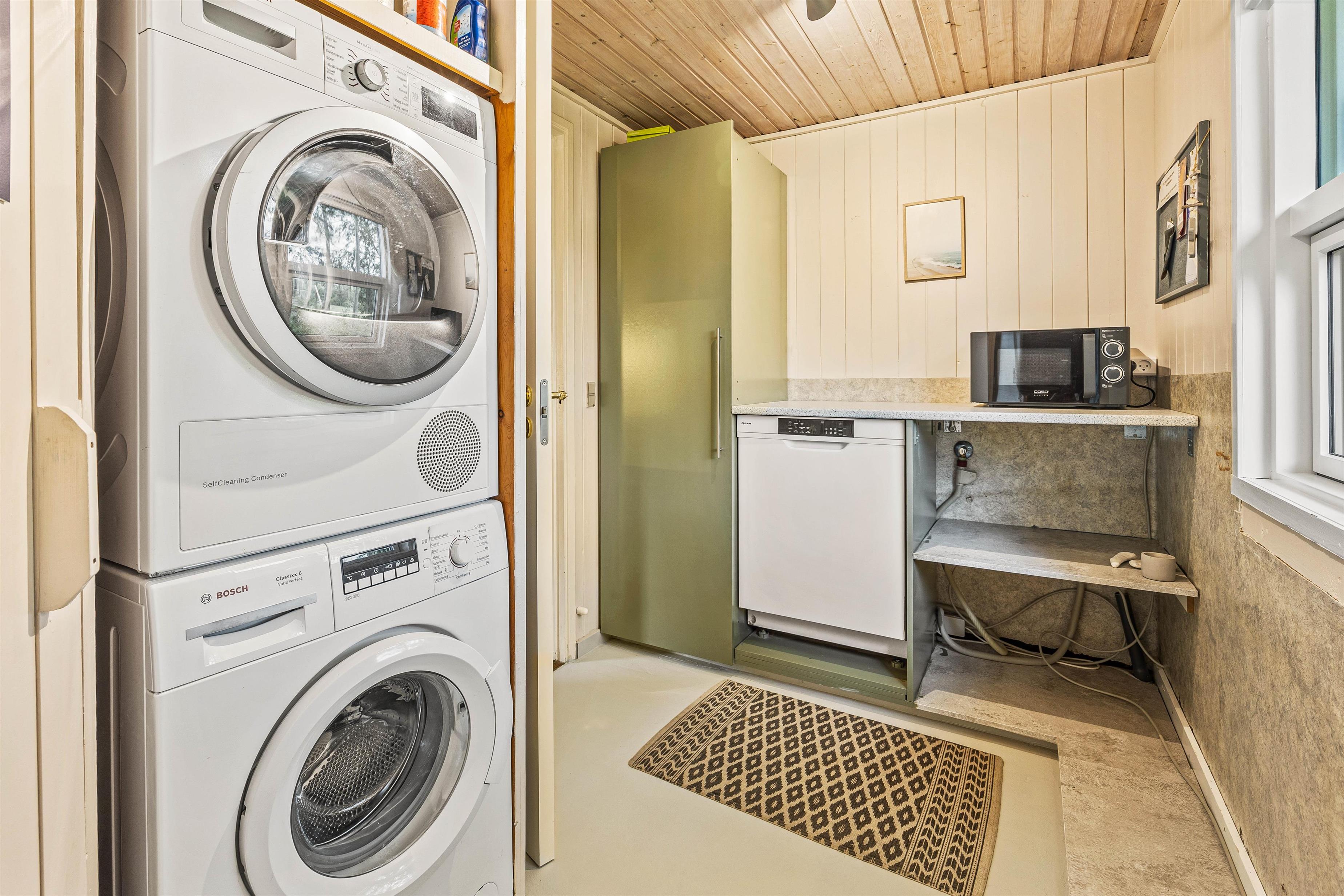 Ferieboligen har et lyst baderum med gulvvarme, hvilket er en dejlig komfort på kølige morgener eller efter en forfriskende tur i naturen. Feriehuset er udstyret med en praktisk vaskemaskine og tørretumbler, så I nemt kan få klaret diverse opgaver, mens I nyder tiden omkring spisebordet med en omgang brætspil.