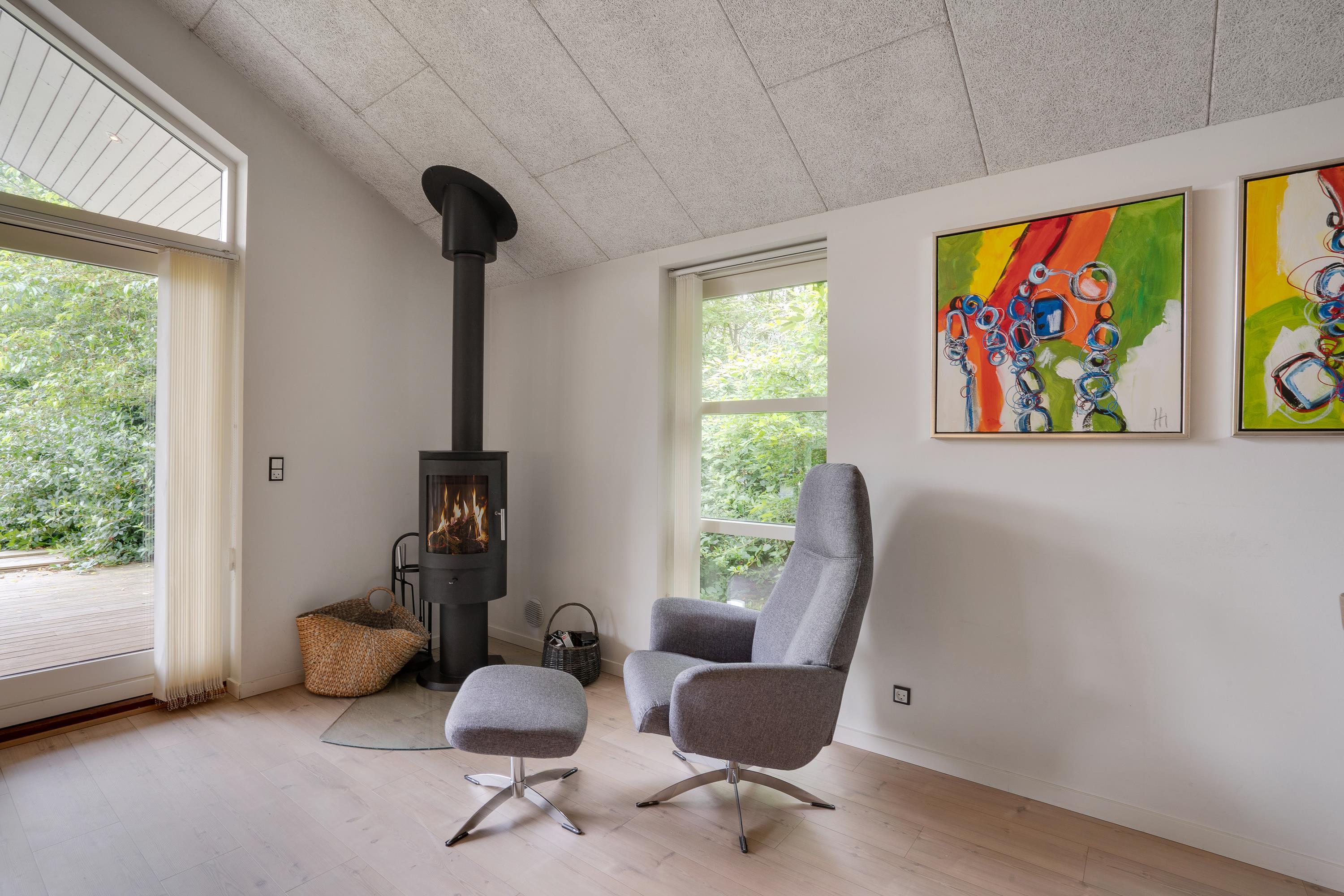 I stuen er der masser af plads til hele familien i de behagelige sofamøbler, hvor I kan nyde hyggelige aftener foran den hyggelige brændeovn, der spreder klassisk sommerhuscharme og varme. Opholdsrummet byder desuden på gulvvarme, som sikrer behagelig temperatur året rundt.