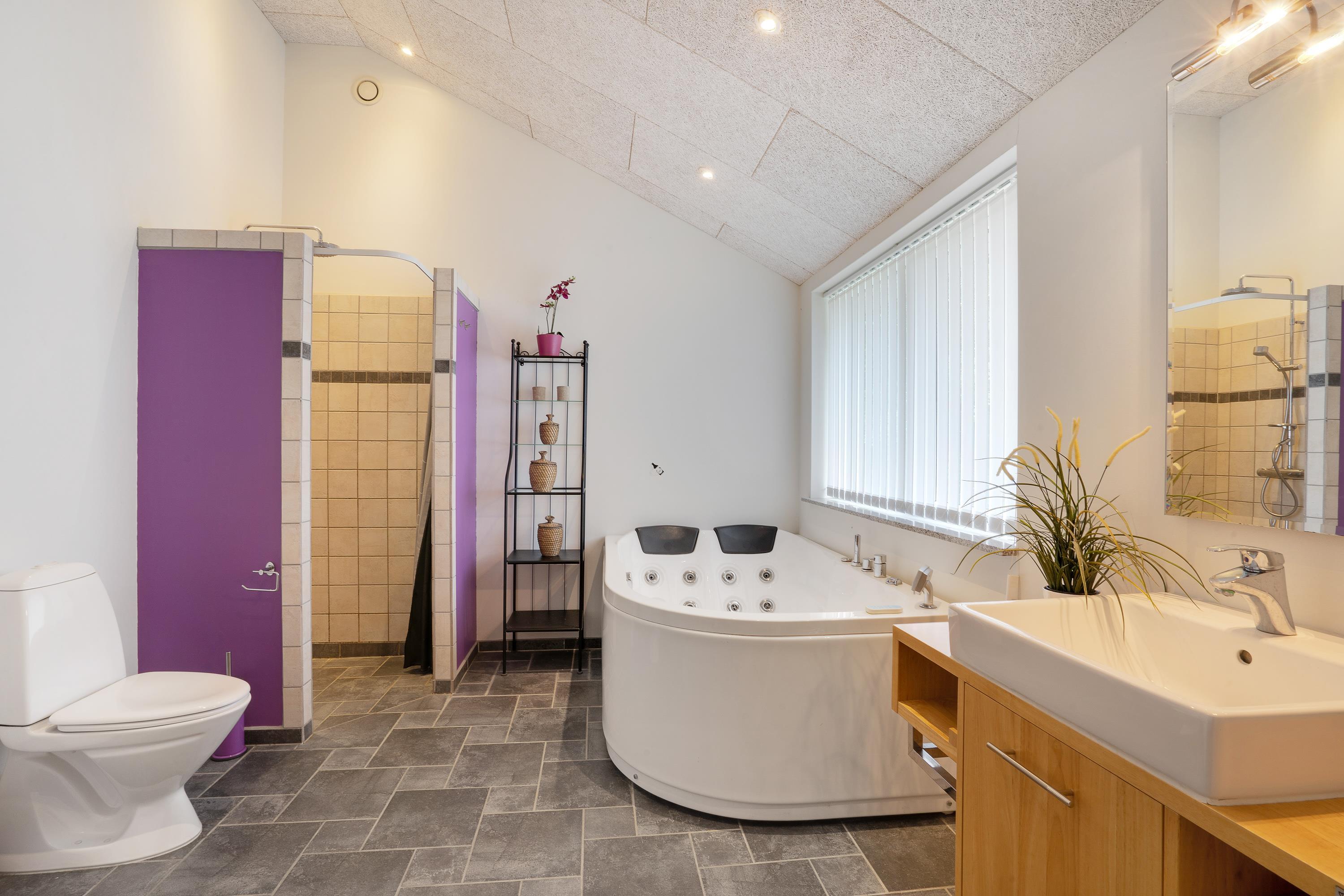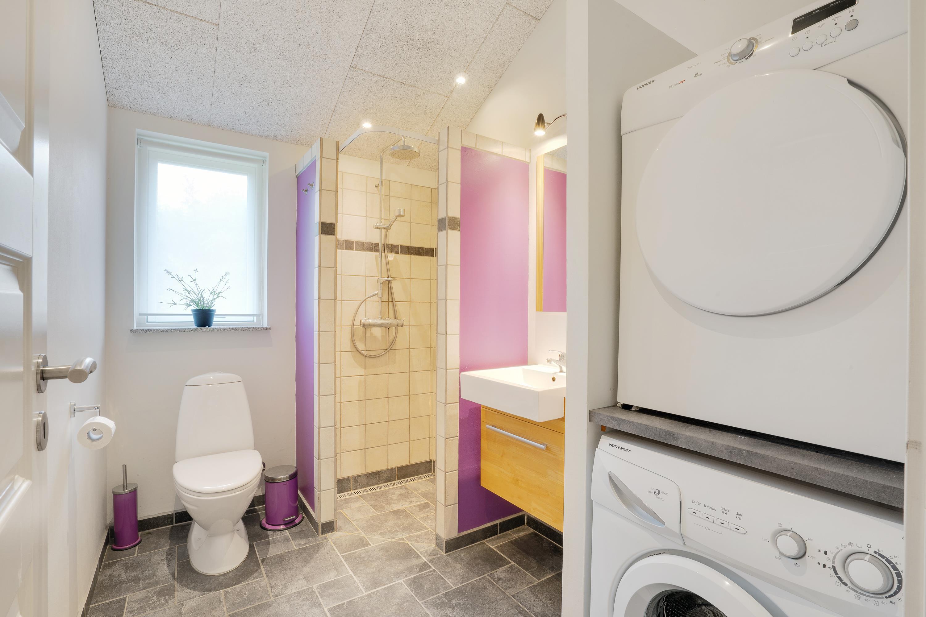 Badeværelset i sommerhuset er udstyret med gulvvarme og byder på både sauna og tømmespa, der gør det muligt for jer at lade musklerne hvile efter en oplevelsesrig dag ved vestkysten. Dertil kommer et gæstetoilet, også med behagelig gulvvarme. For at gøre jeres ophold endnu mere bekvemt er der både vaskemaskine og tørretumbler til rådighed.
