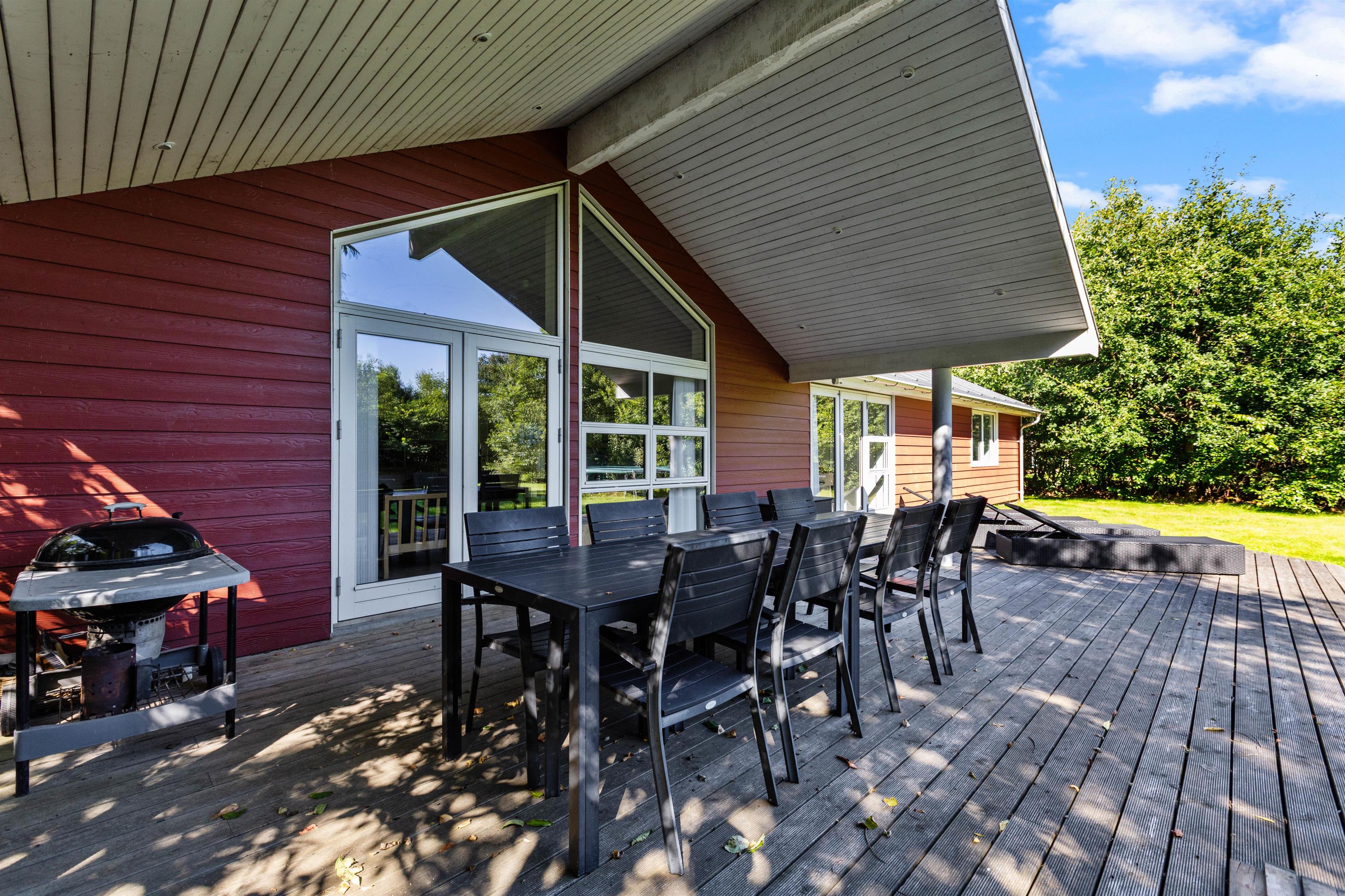 Udenfor venter en dejlig, åben og delvist overdækket terrasse, hvor I finder alt, hvad I behøver til en aften med BBQ eller en afslappet brunch i morgensolen. Her kan I benytte de komfortable havemøbler, mens I nyder et godt måltid i det fri.