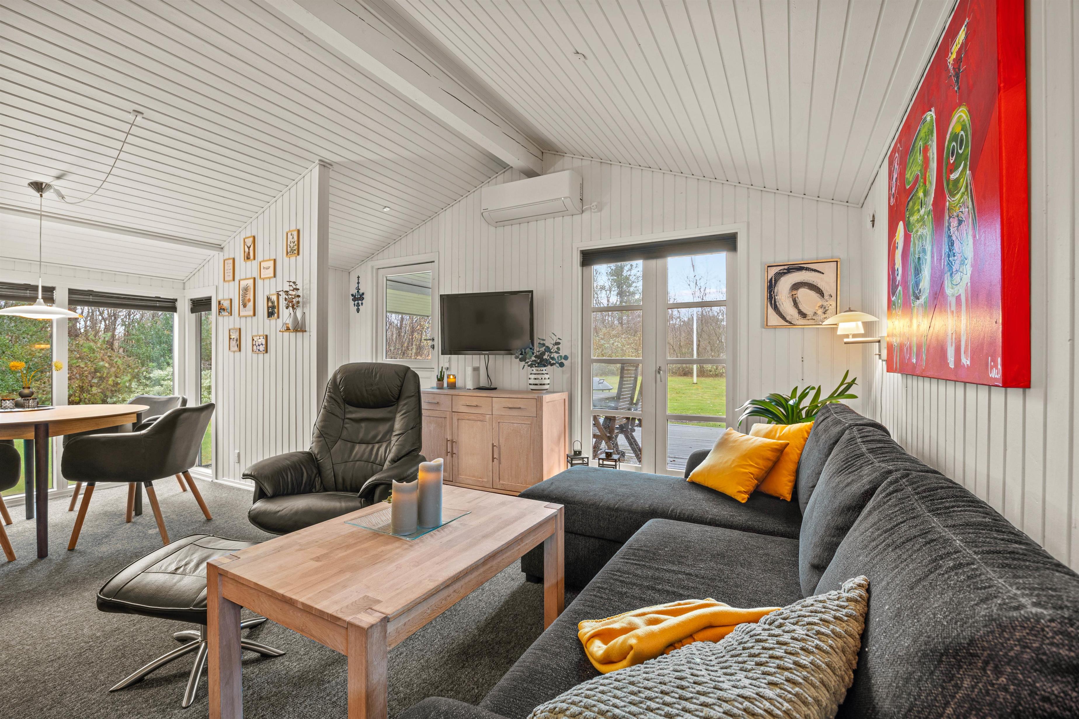 Stuen ligger i åben forbindelse med køkkenet, perfekt til hyggelige aftener med god mad og fælles madlavning. Det moderne køkken er udstyret med alt, hvad I behøver: opvaskemaskine, mikroovn, køleskab, frysemulighed på 71 l og induktionskogeplade.