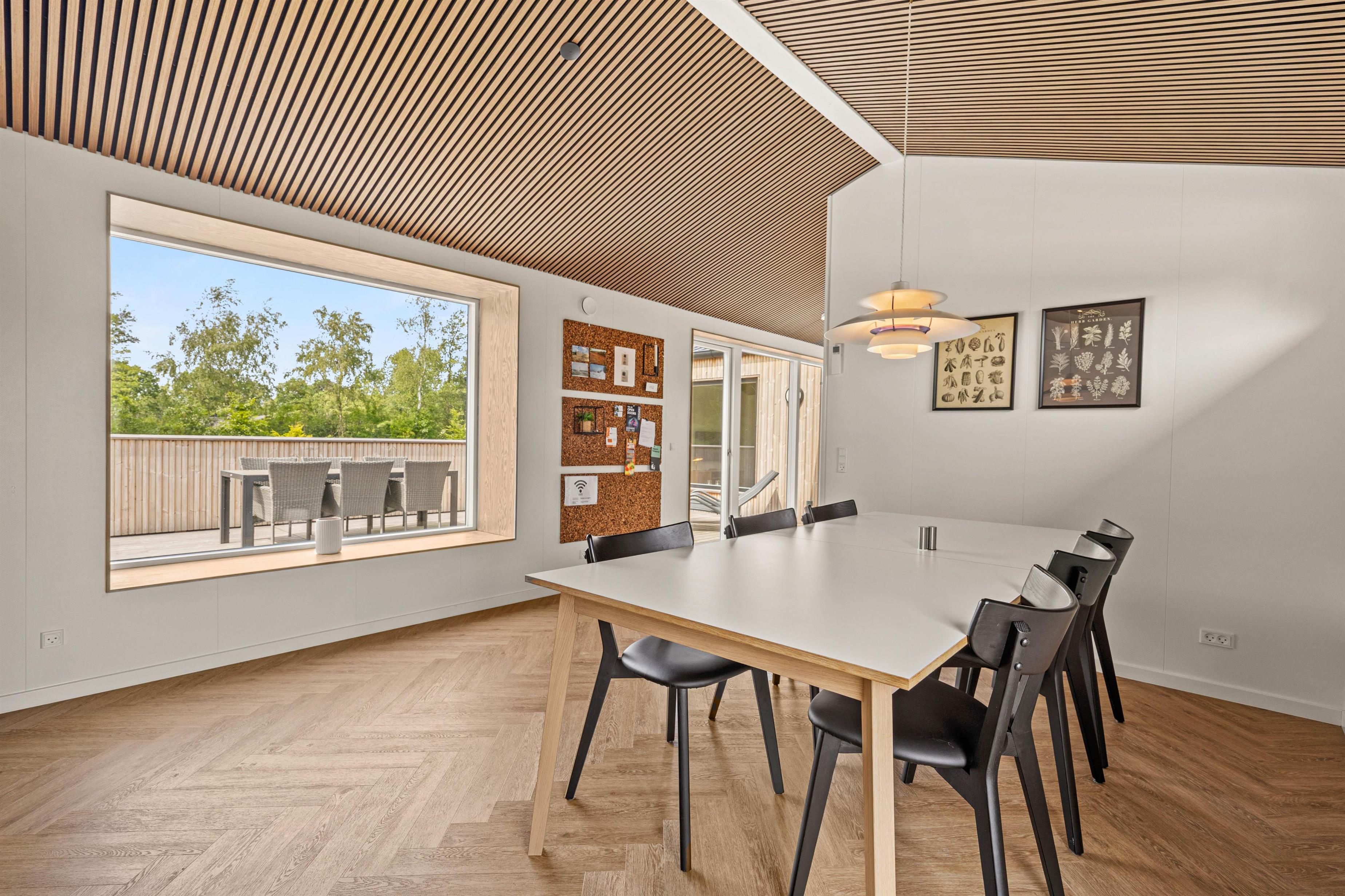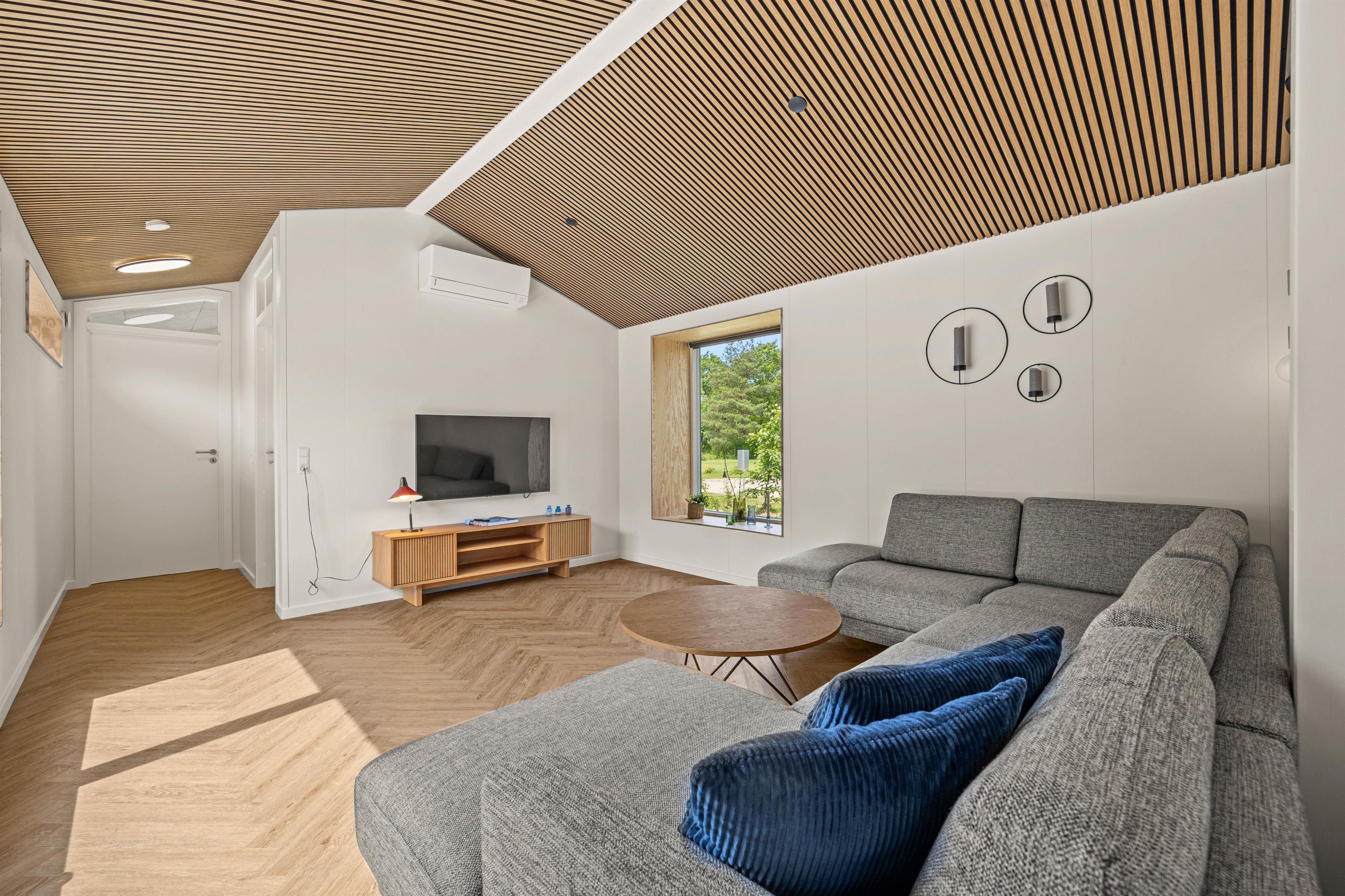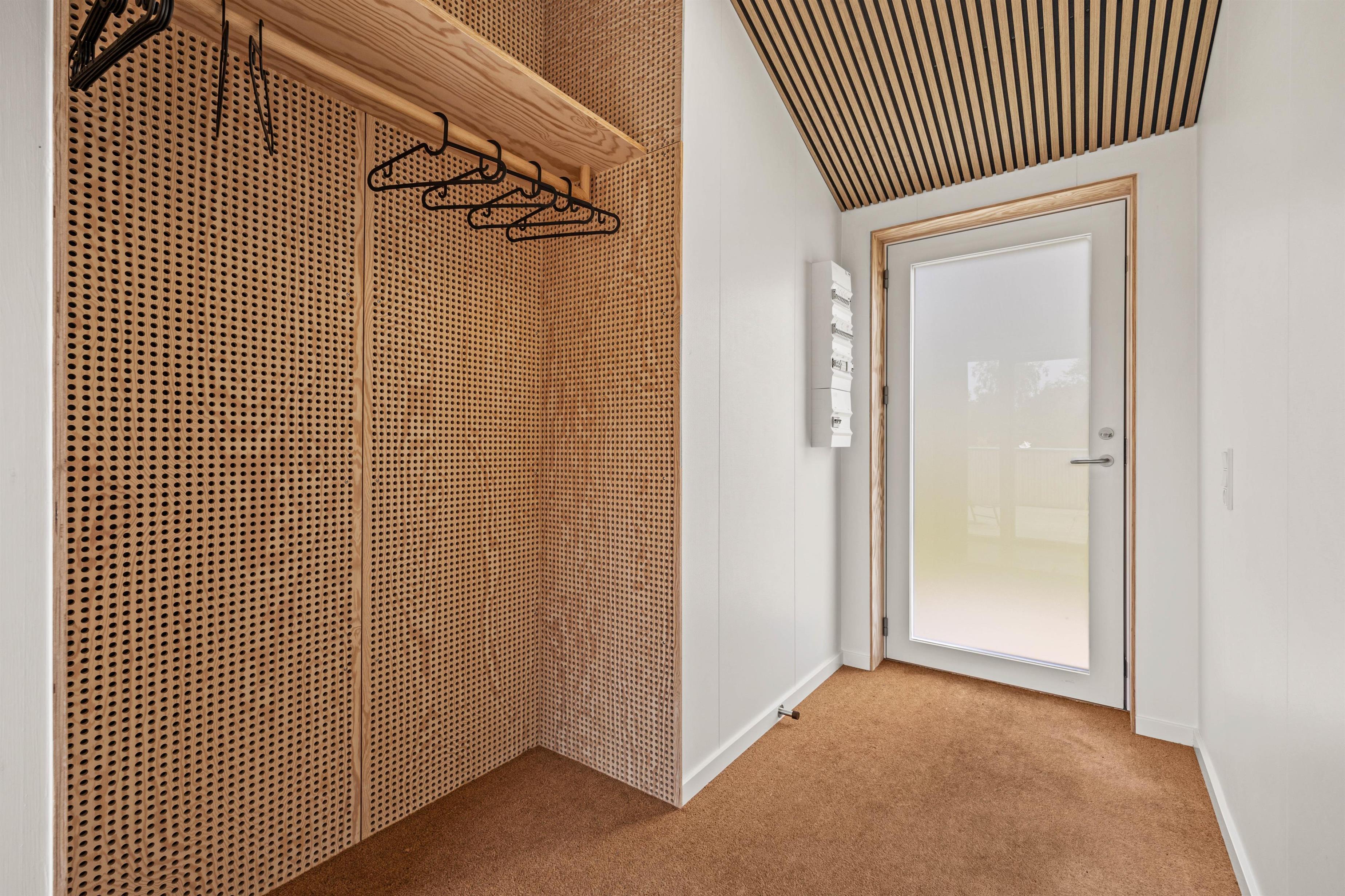 Badeværelset byder på et rummeligt bruseområde og god opbevaringsplads, så alle let kan dele faciliteterne. Her finder I også en vaskemaskine, som er praktisk til længere ophold. Den energivenlige luft-til-luft varmepumpe sørger samtidig for et behageligt og lunt indeklima – ideelt efter en dag ude i naturen.