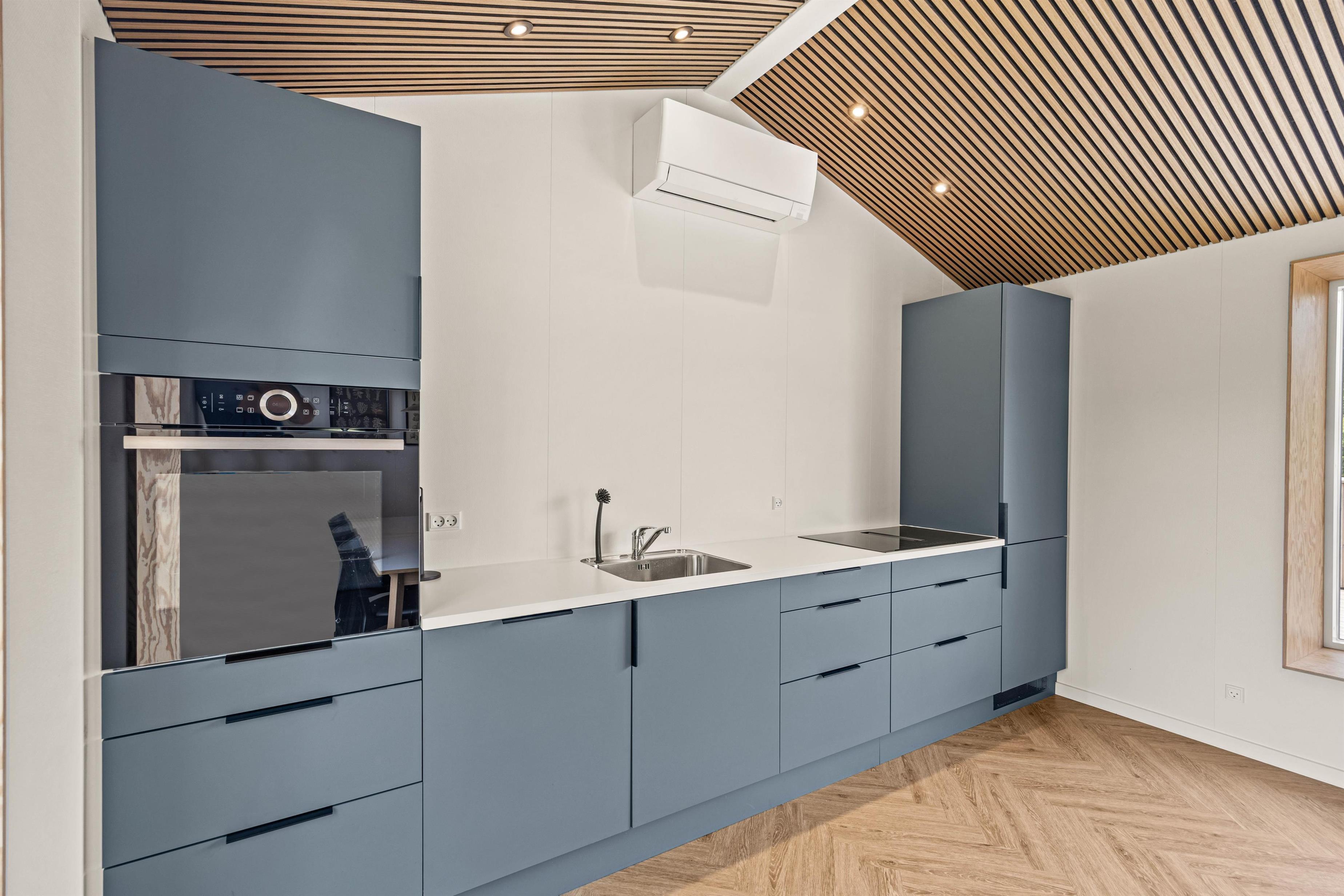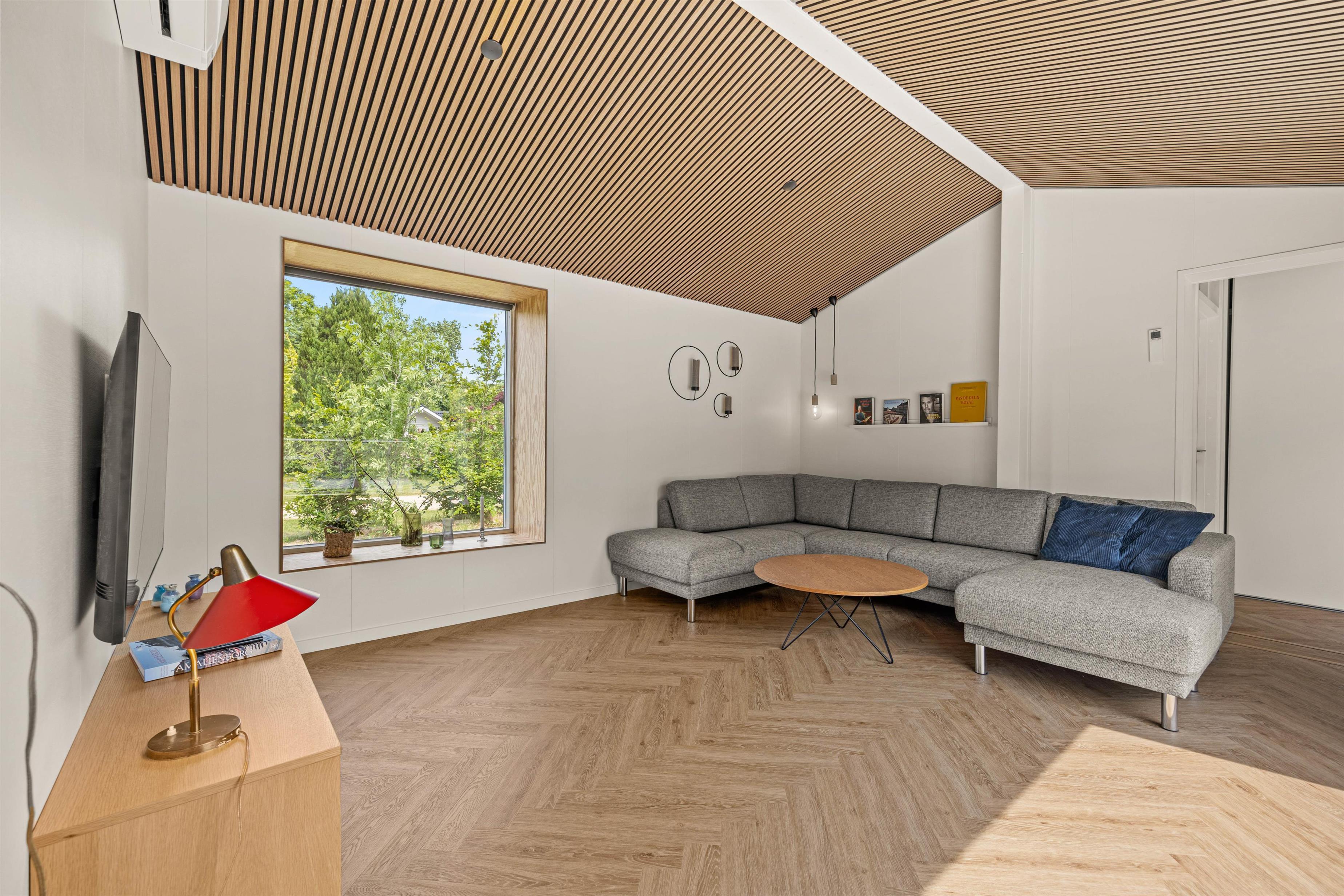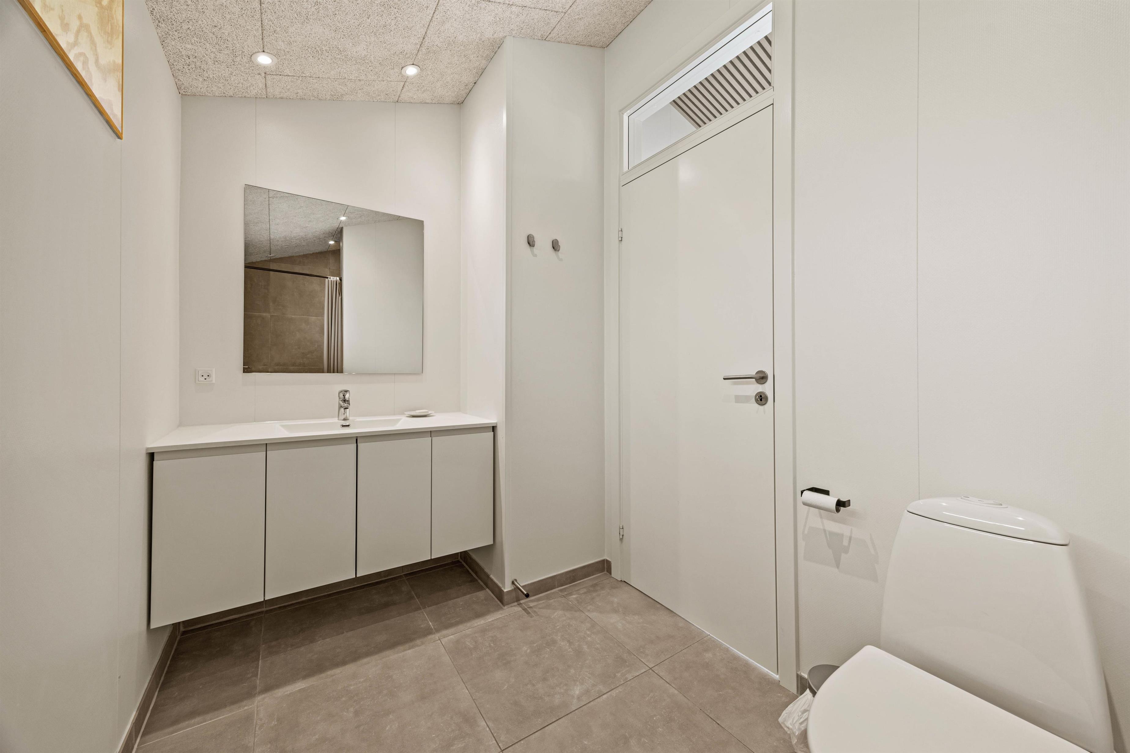 Badeværelset byder på et rummeligt bruseområde og god opbevaringsplads, så alle let kan dele faciliteterne. Her finder I også en vaskemaskine, som er praktisk til længere ophold. Den energivenlige luft-til-luft varmepumpe sørger samtidig for et behageligt og lunt indeklima – ideelt efter en dag ude i naturen.