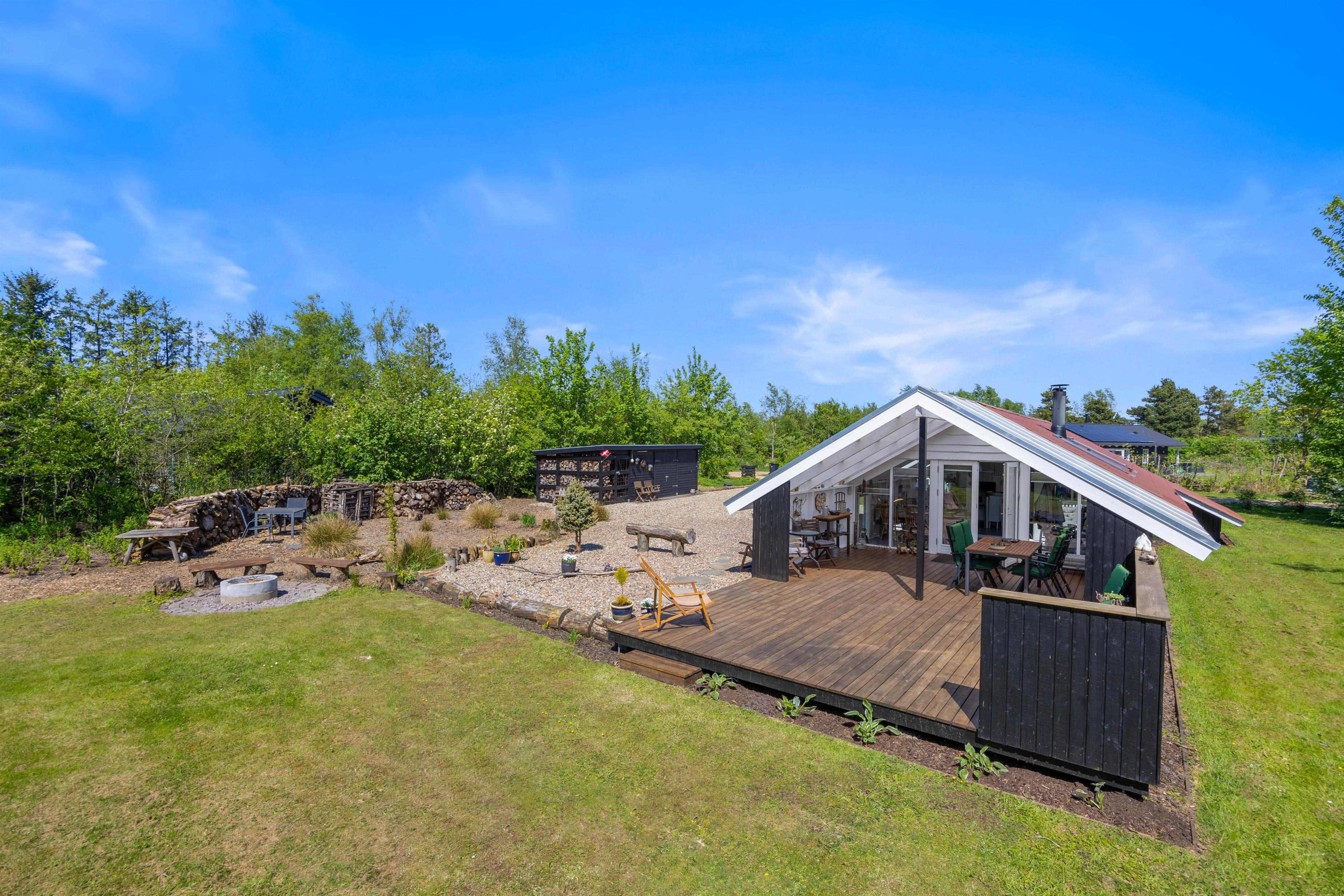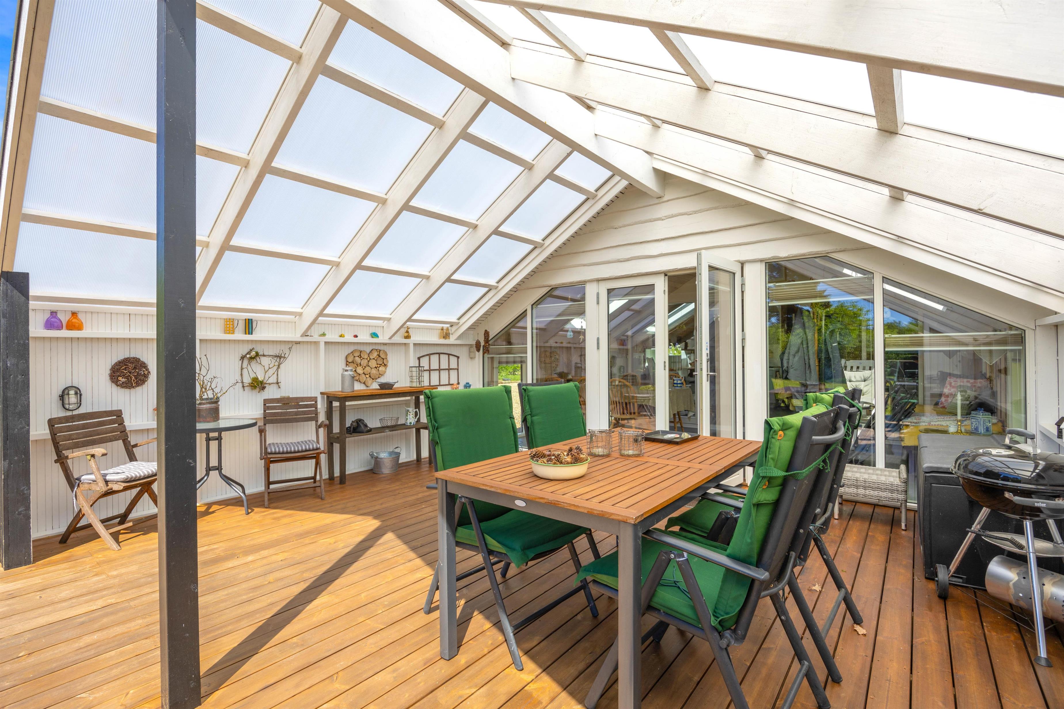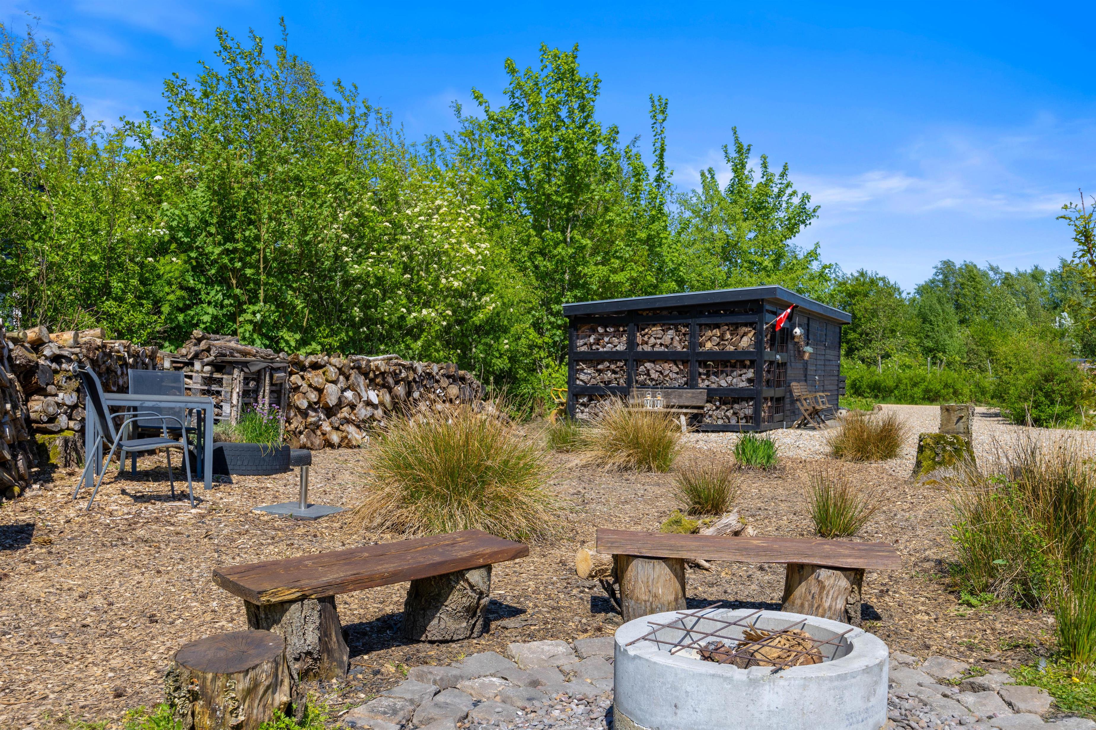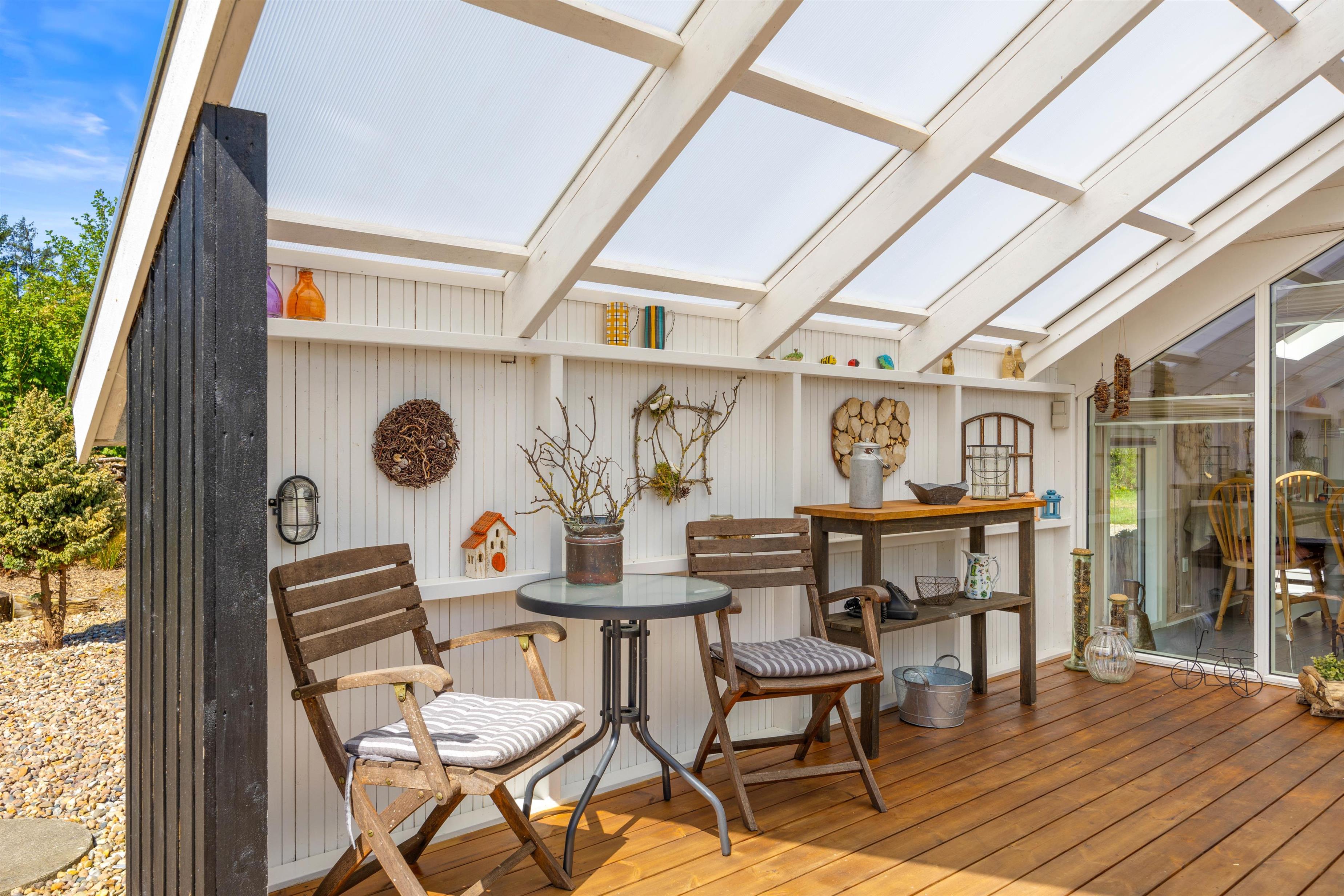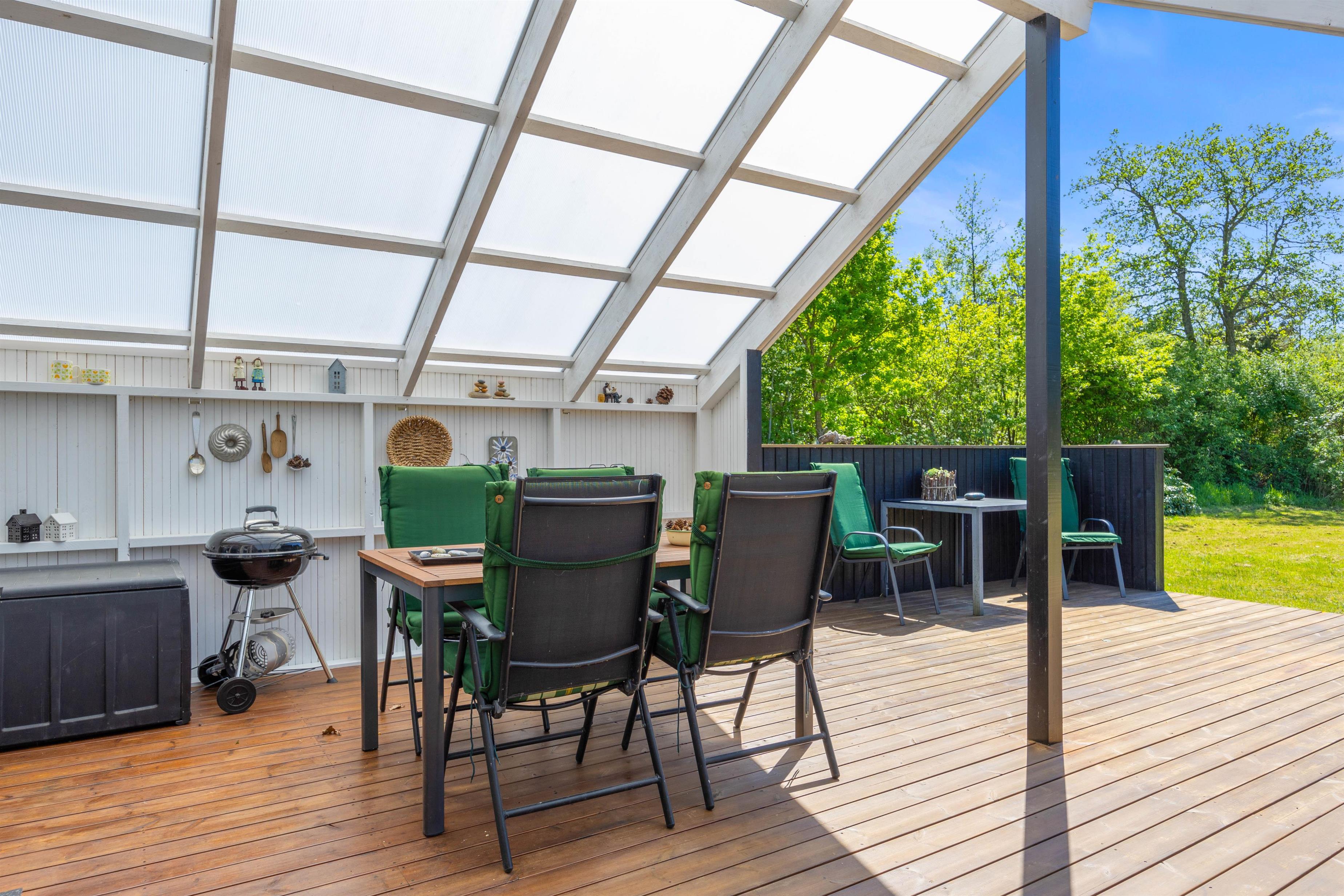 Den overdækkede terrasse er et perfekt sted til at starte dagen med morgenkaffen eller afslutte aftenen med et glas vin, mens I nyder lyden af vinden i træerne. Der er mulighed for at fyre op i grillen eller bålstedet og arrangere hyggelige grillmiddage sammen med familie og venner.