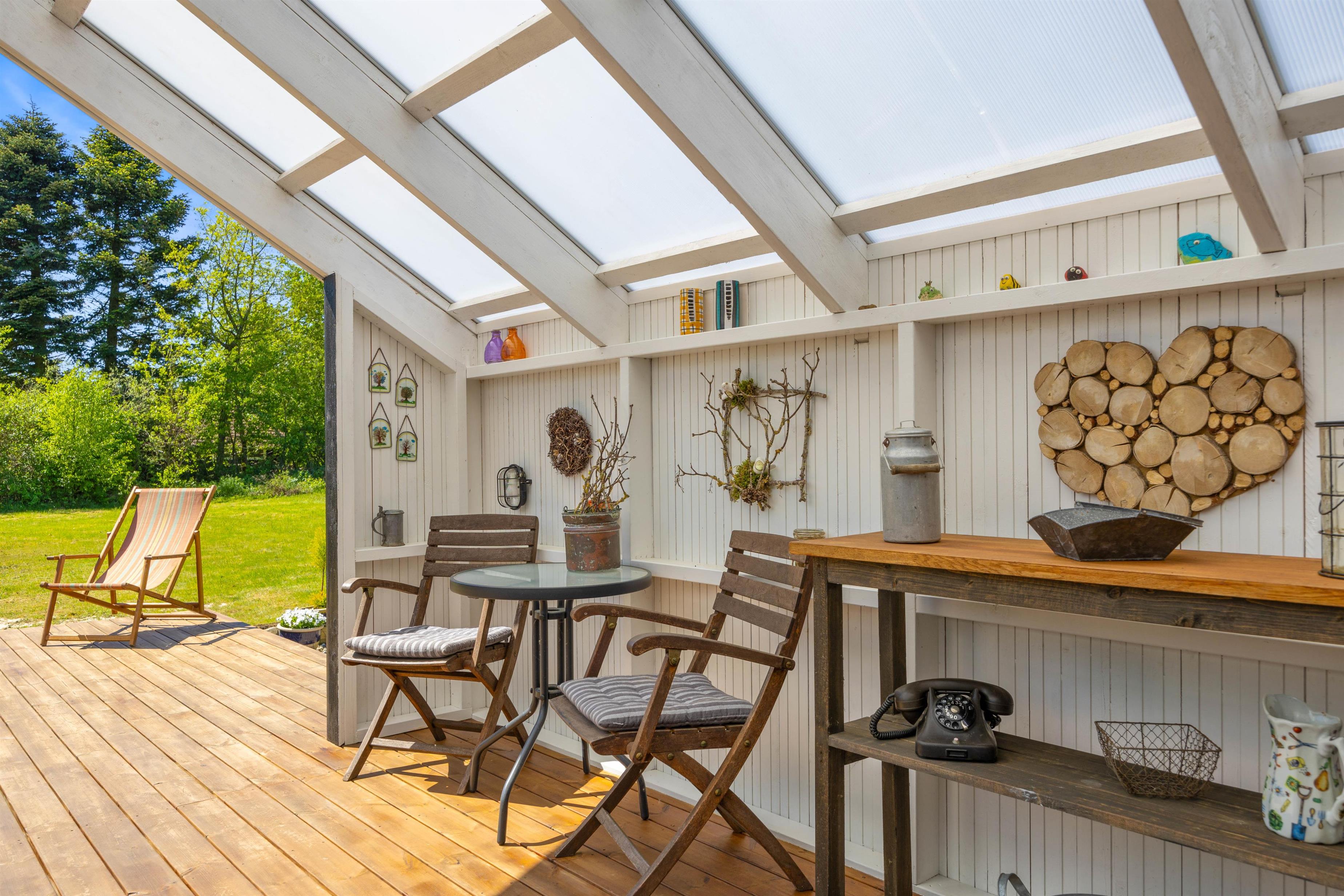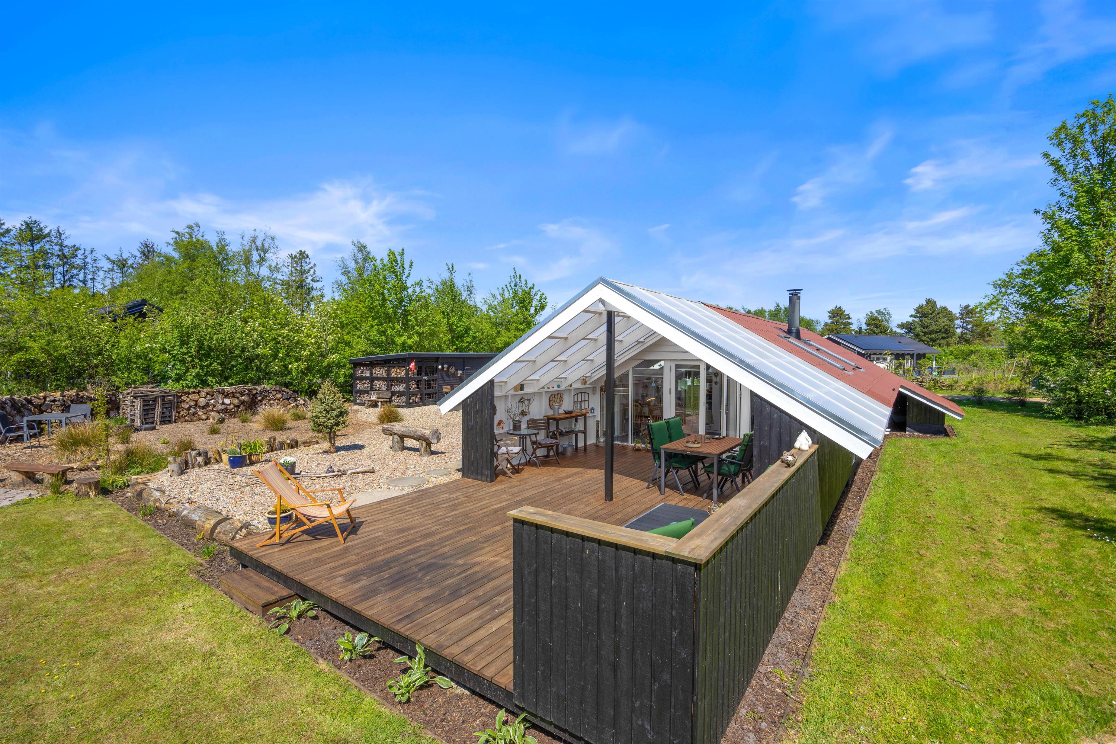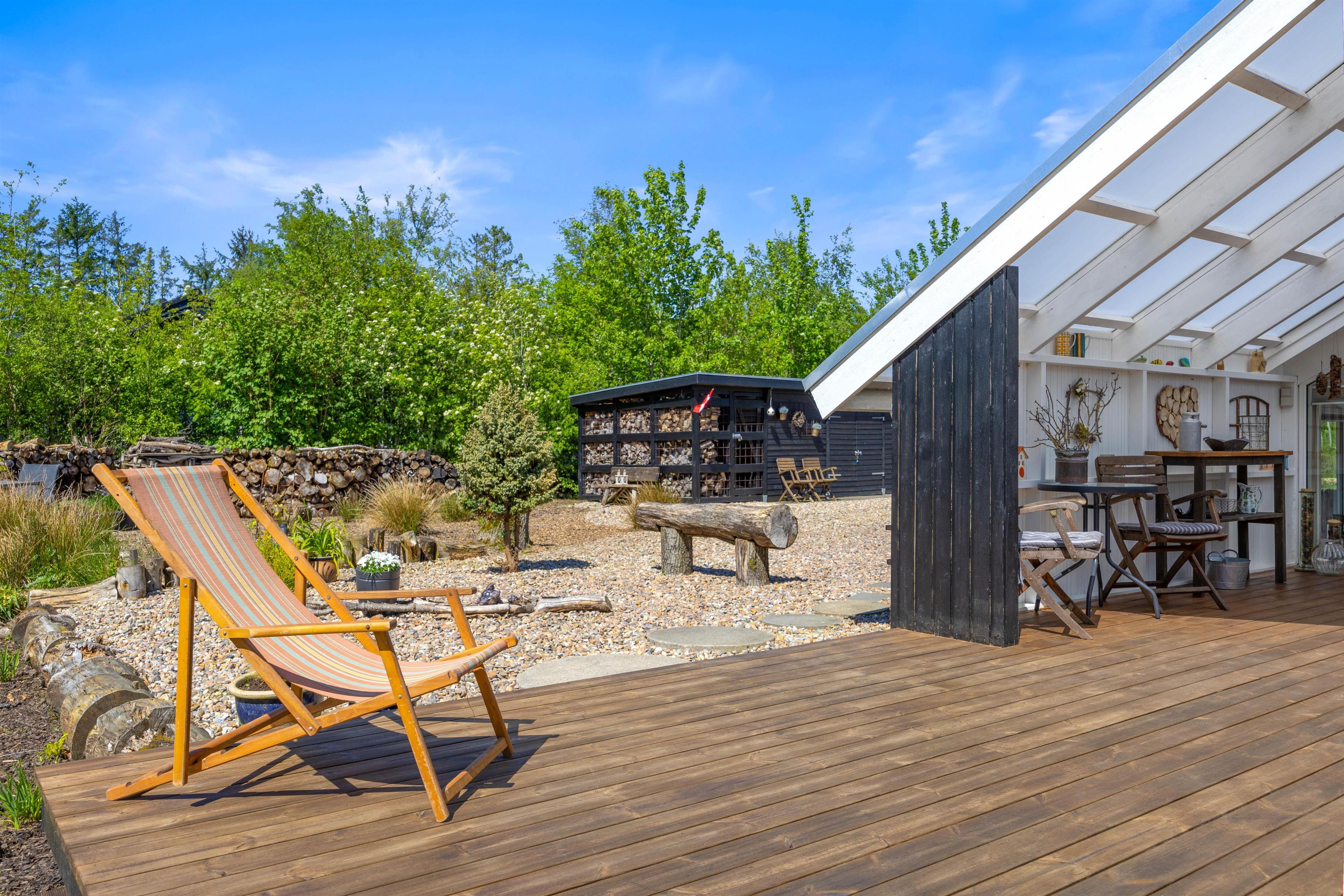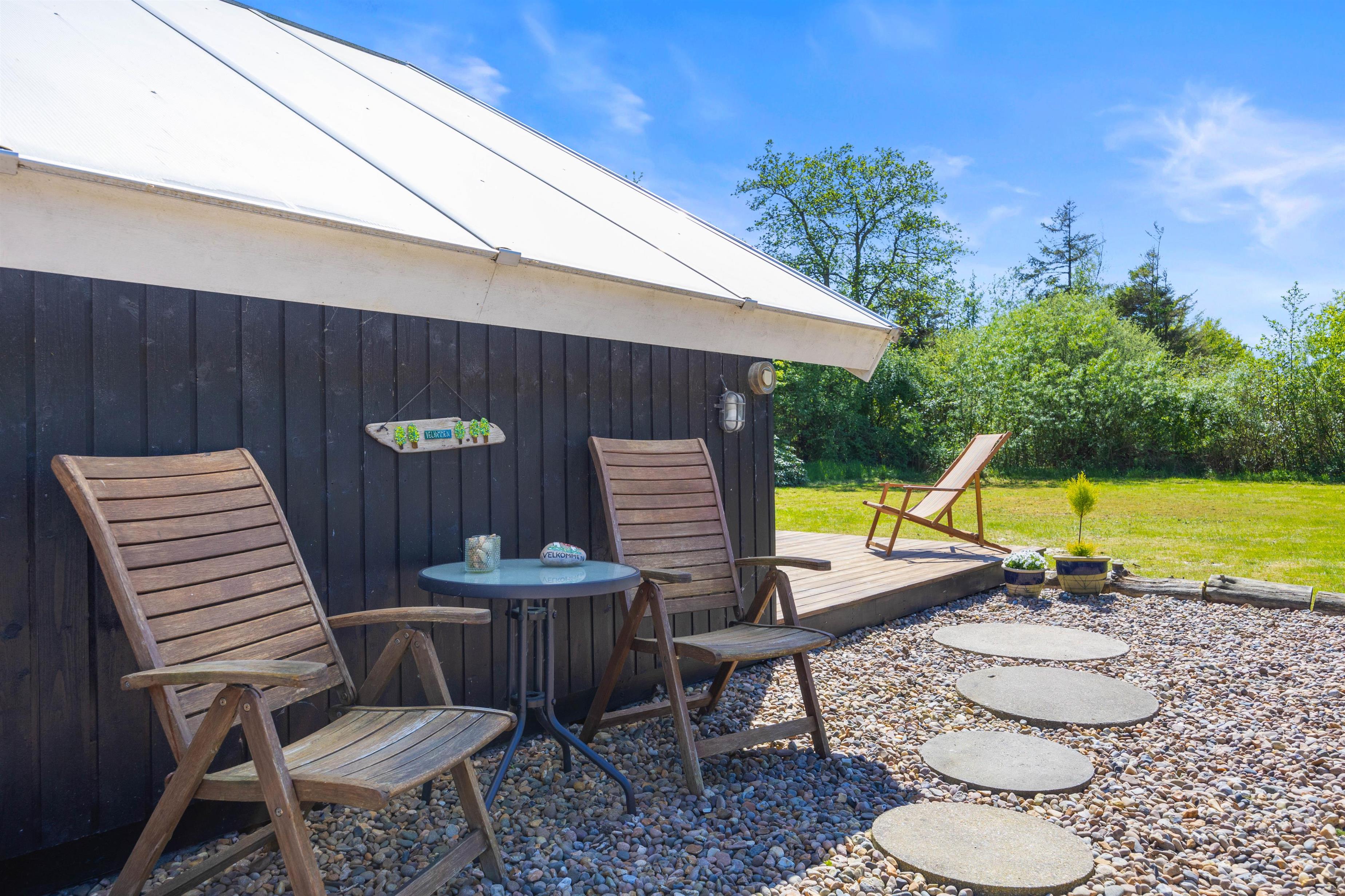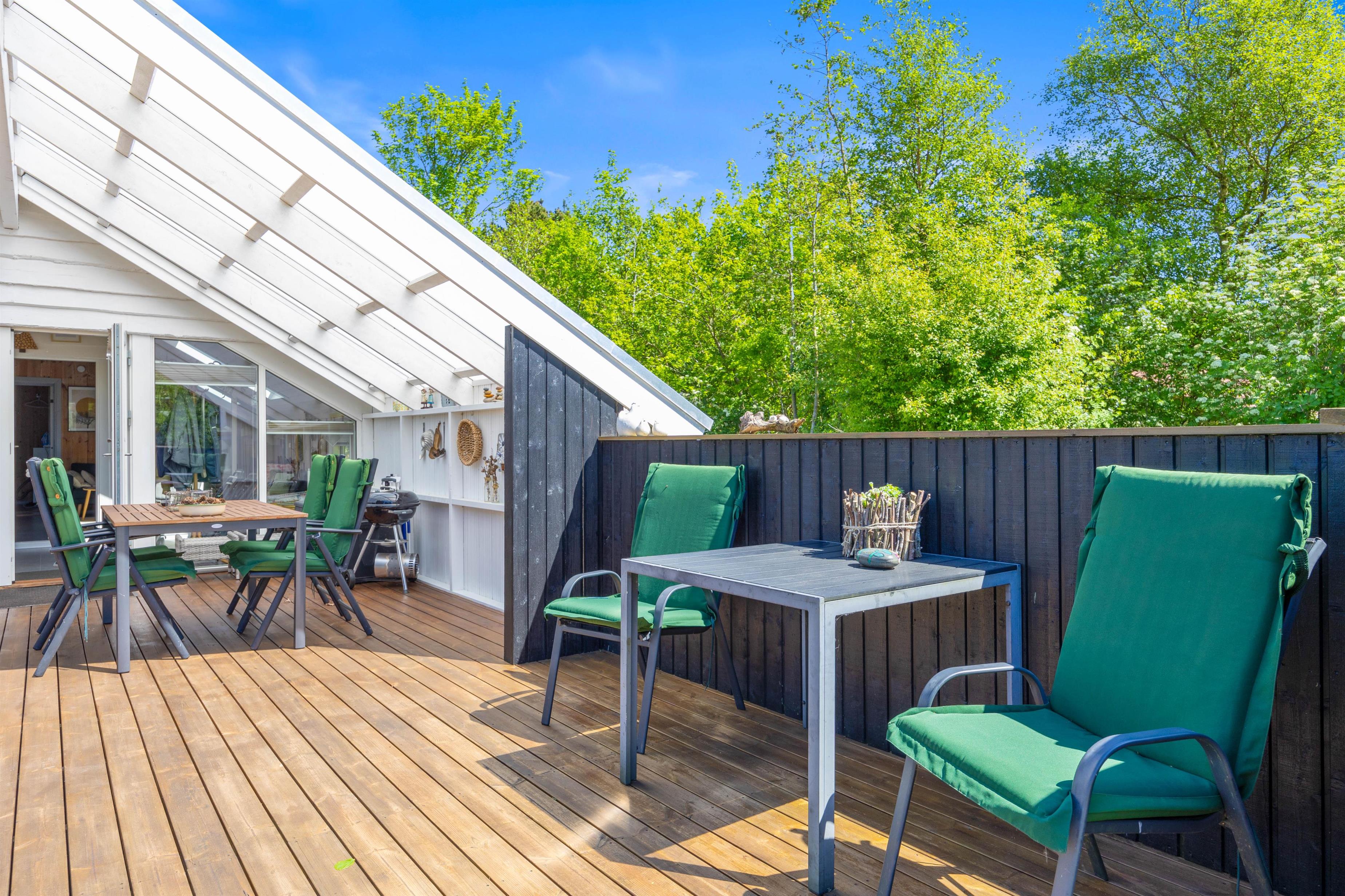 Den overdækkede terrasse er et perfekt sted til at starte dagen med morgenkaffen eller afslutte aftenen med et glas vin, mens I nyder lyden af vinden i træerne. Der er mulighed for at fyre op i grillen eller bålstedet og arrangere hyggelige grillmiddage sammen med familie og venner.