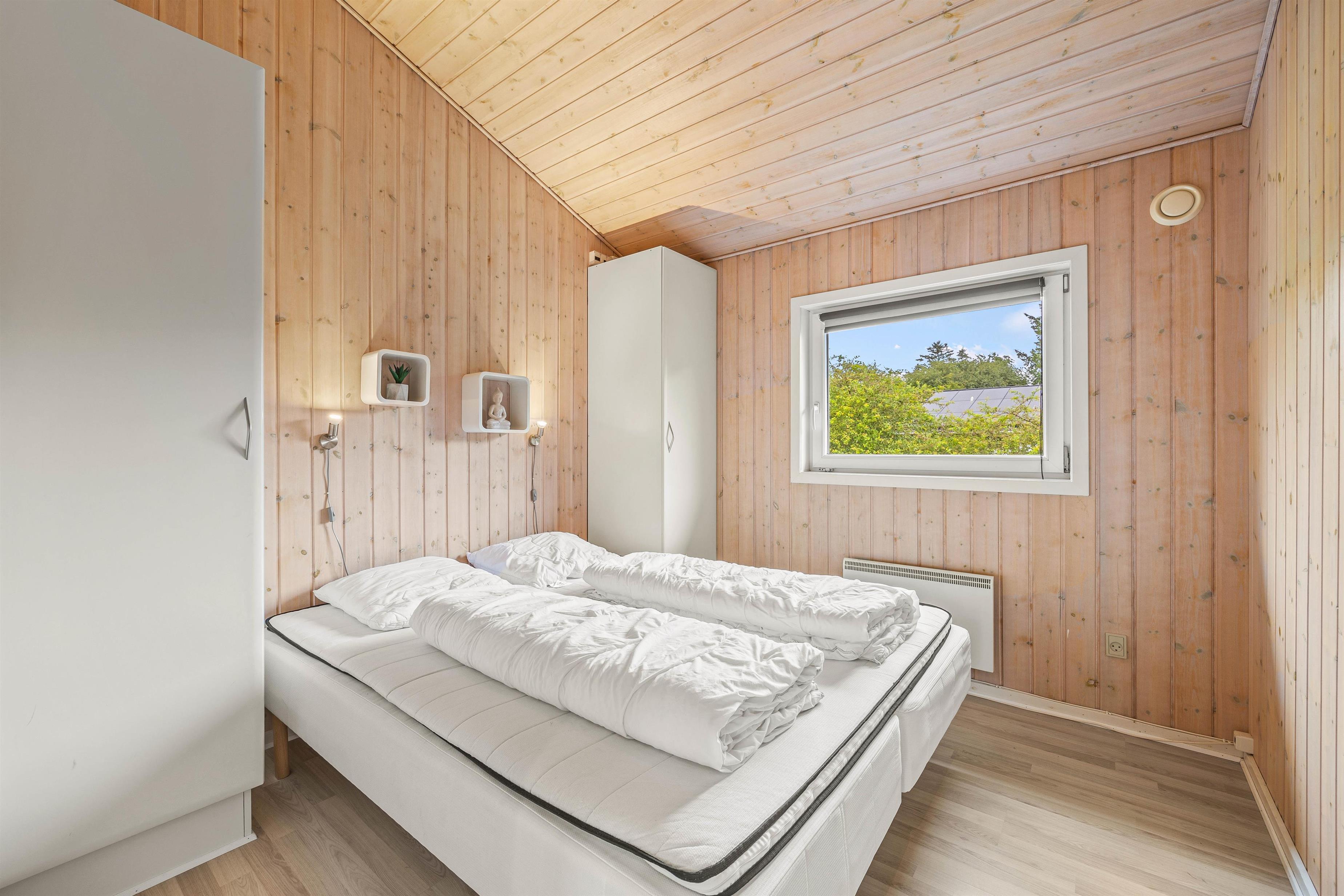 Sommerhuset har 2 soveværelser med dobbeltsenge og et tredje værelse med 2 enkeltsenge - er oplagt sted for børnene at have deres eget rum. Alle værelser er lyst indrettet, hvilket skaber en behagelig atmosfære.