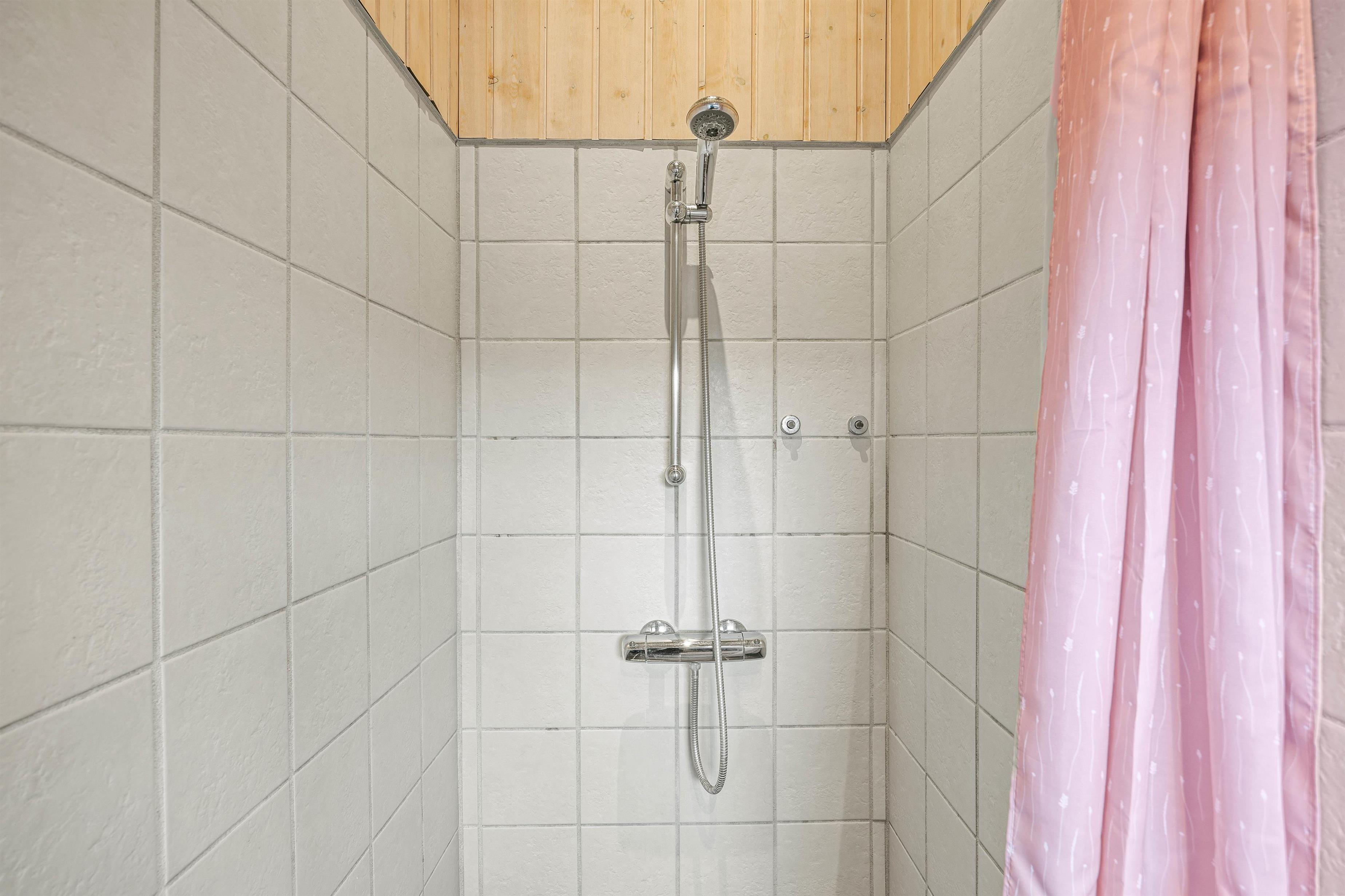 Badeværelset er lyst indrettet med plads til afslapning. Her er der en rummelig tømmespa til 2 personer og en sauna, perfekt til at slappe af efter en dag fyldt med sjove aktiviteter. Der er også et praktisk vasketårn til rådighed, så I kan holde jeres garderobe ren under opholdet.