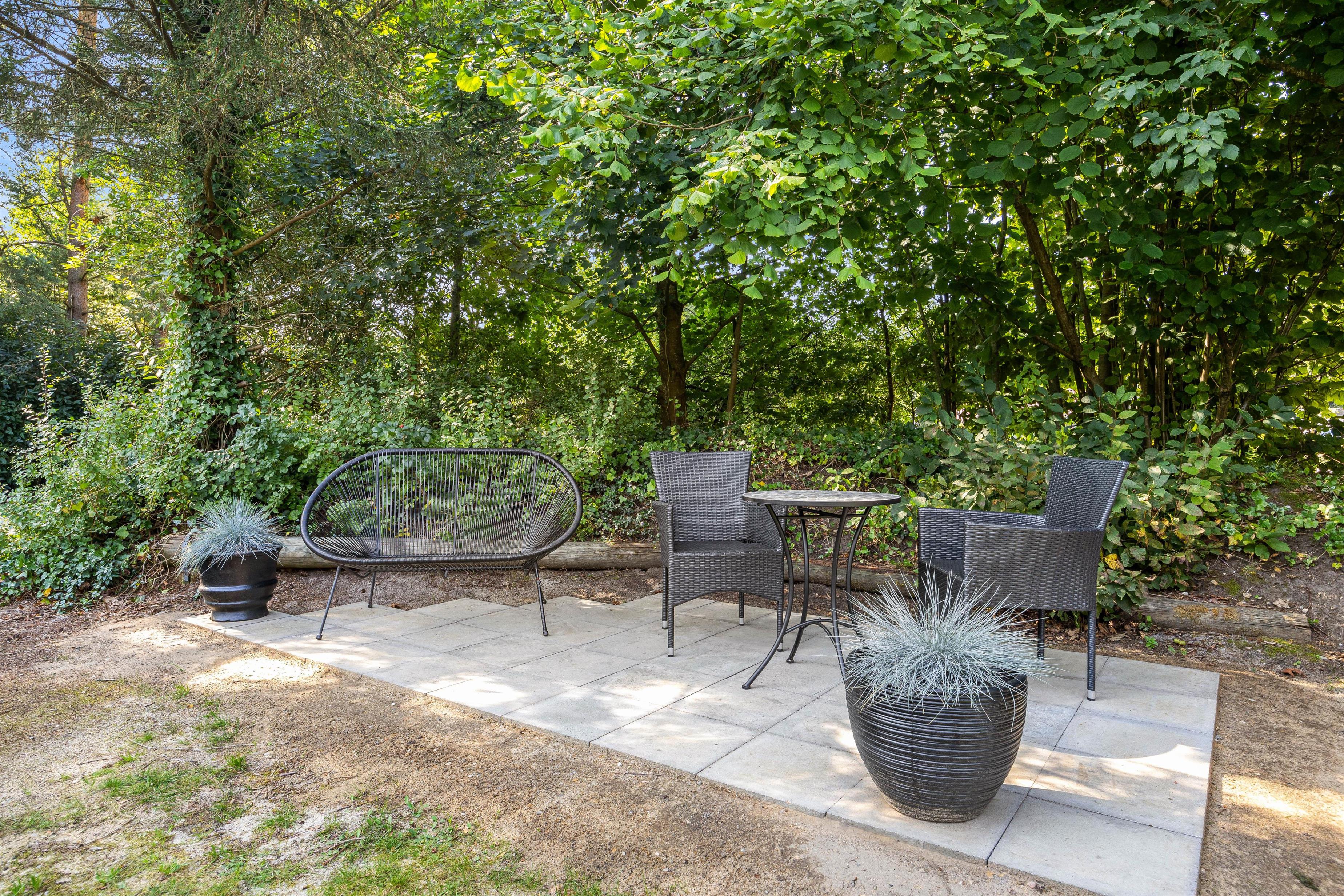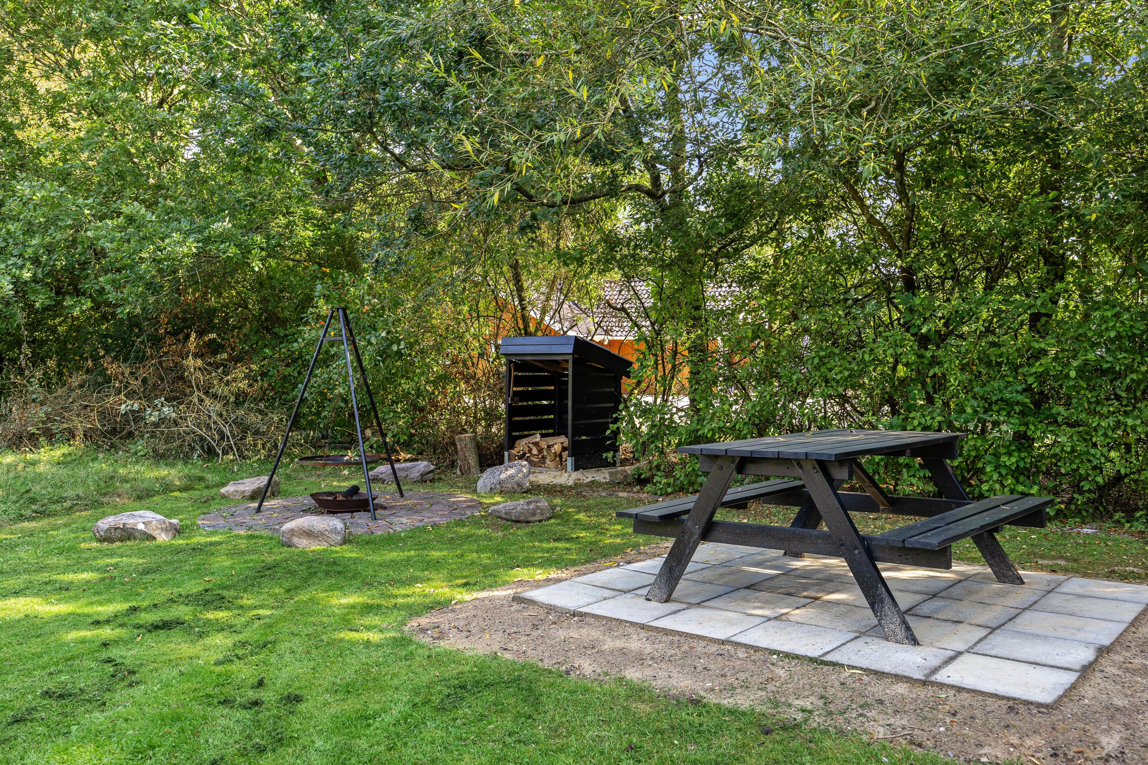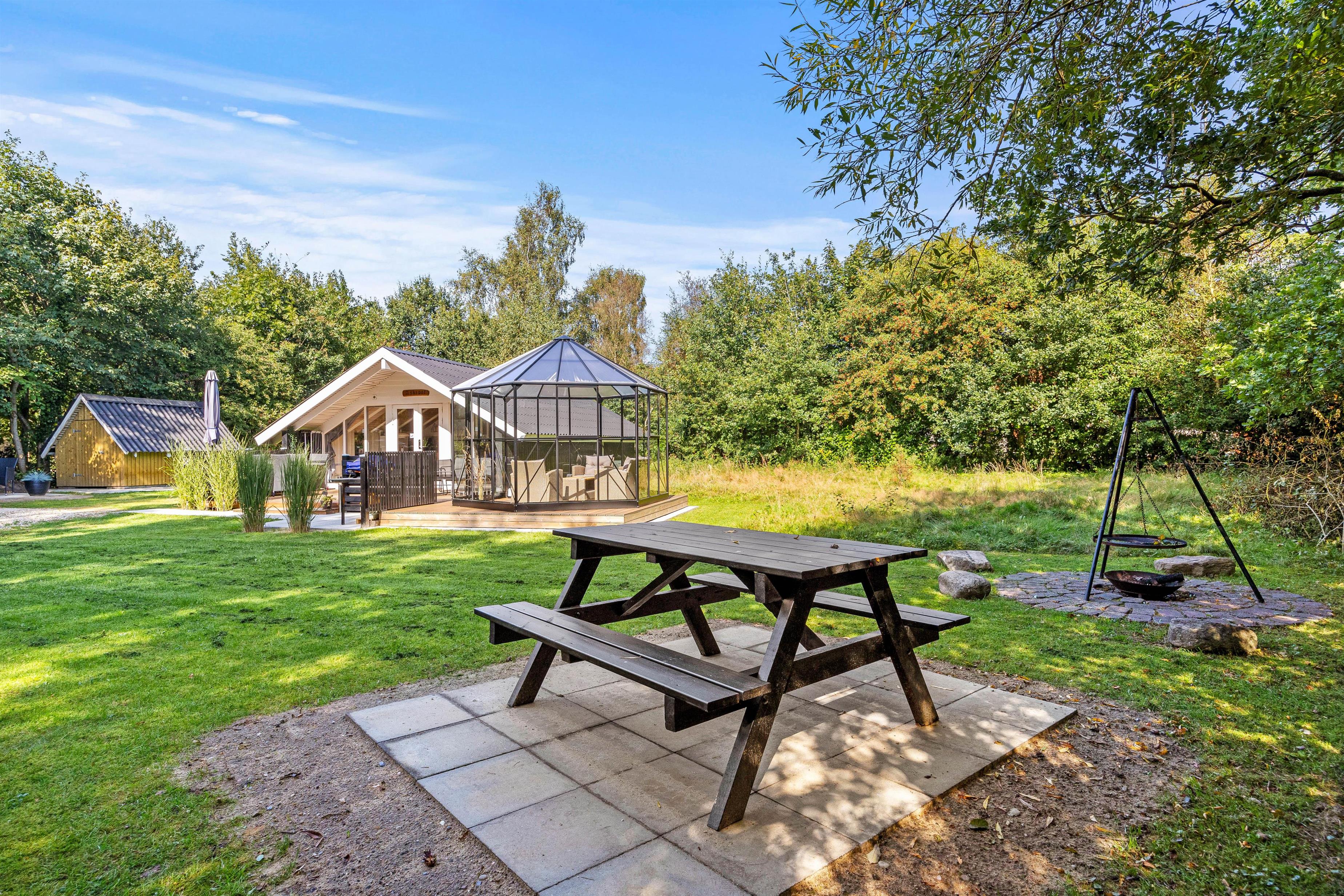 Feriehusets træterrasse er indrettet med komfortable havemøbler og solvogne, så I kan nyde de lange sommerdage i fulde drag. Sæt jer til rette med en god bog, og nyd lyden af fuglekvidder fra de omkringliggende træer og buske, der omkranser feriehuset og giver ro og læ på terrassen. Her står jer også en grill til rådighed, som I kan tænde op i og nyde lækre måltider under åben himmel. Feriehuset har desuden en pavilion, hvor I kan sidde og hygge jer selv på regnfulde dage, hvilket giver et ekstra element af komfort og hygge.