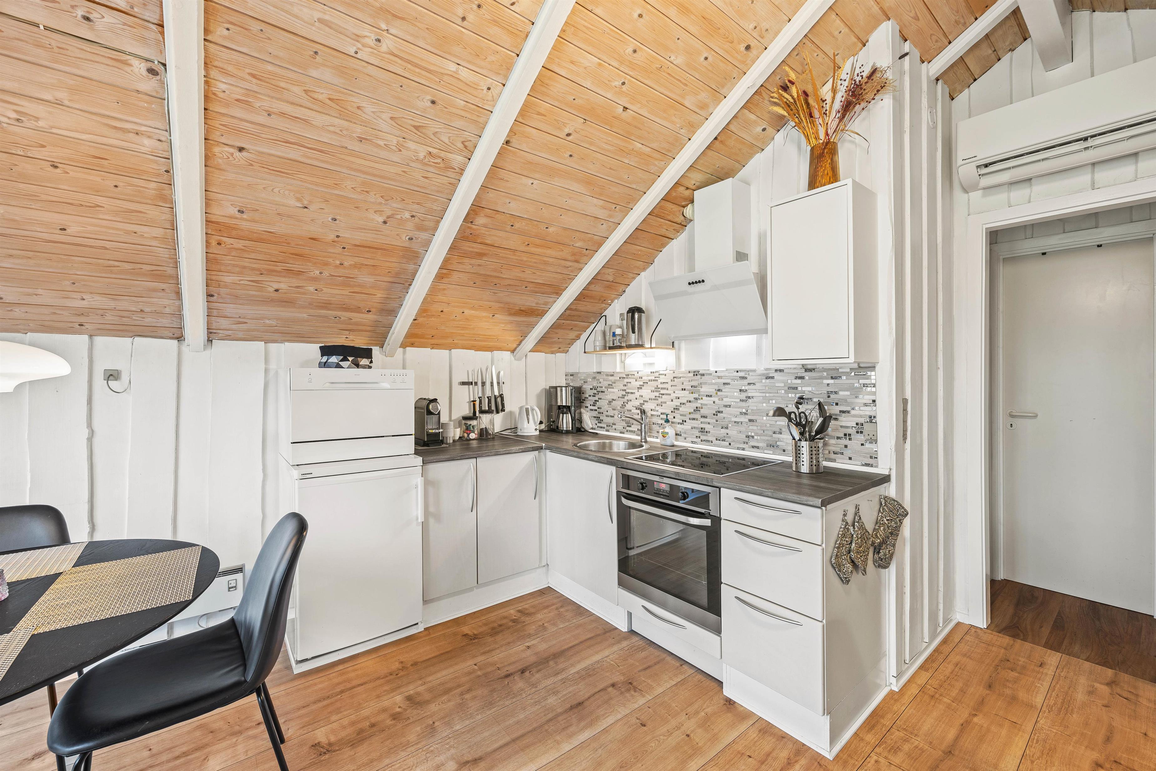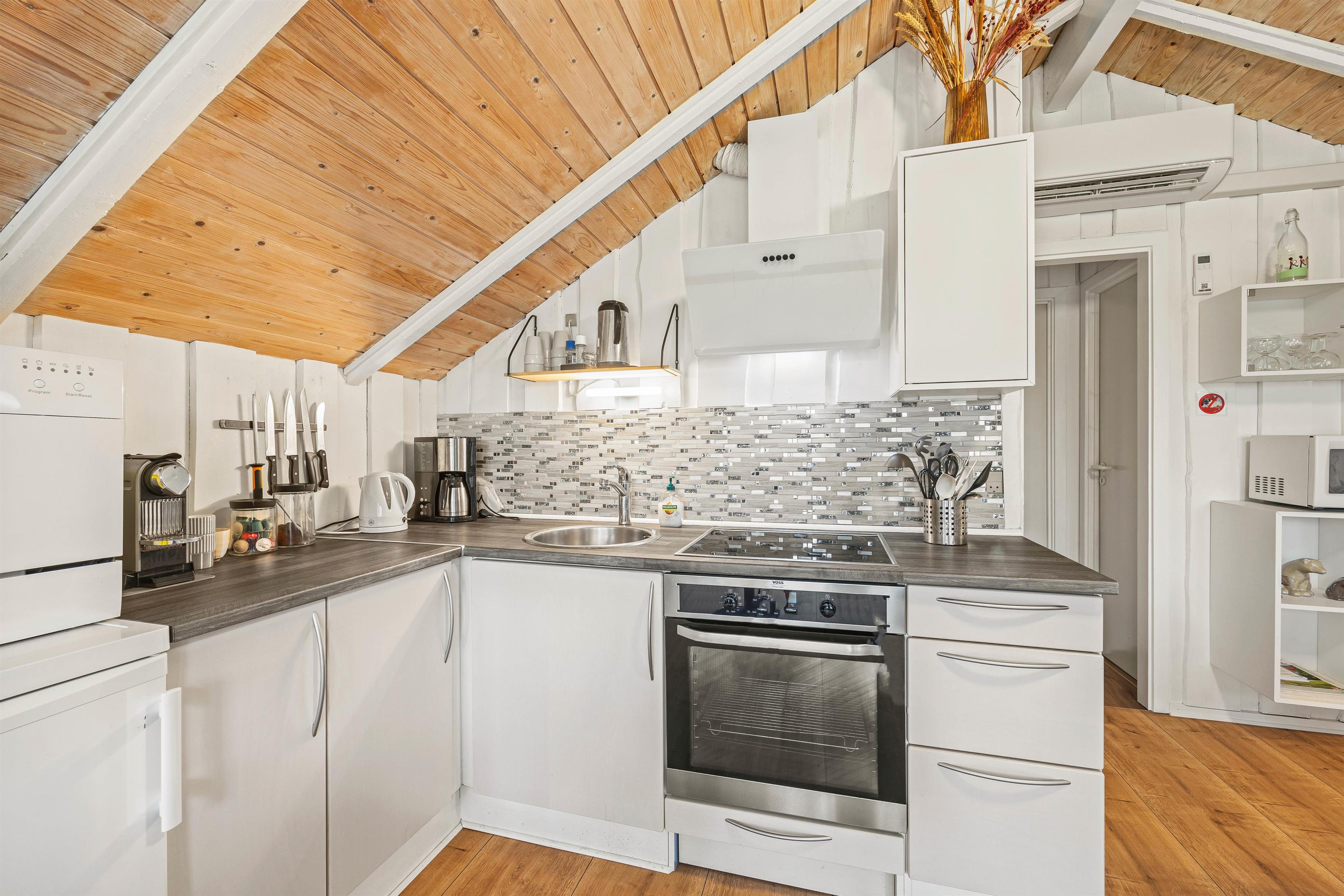 Hjertet af feriehuset er det lyse og lette alrum, hvor køkkenet ligger i åben forbindelse til spiseplads og stue. Her kan I sætte jer til rette i den bløde sofa og se en god film, som I kan caste med Chromecast. I det veludstyrede køkken venter jer en opvaskemaskine, der letter oprydningen efter aftensmaden.
