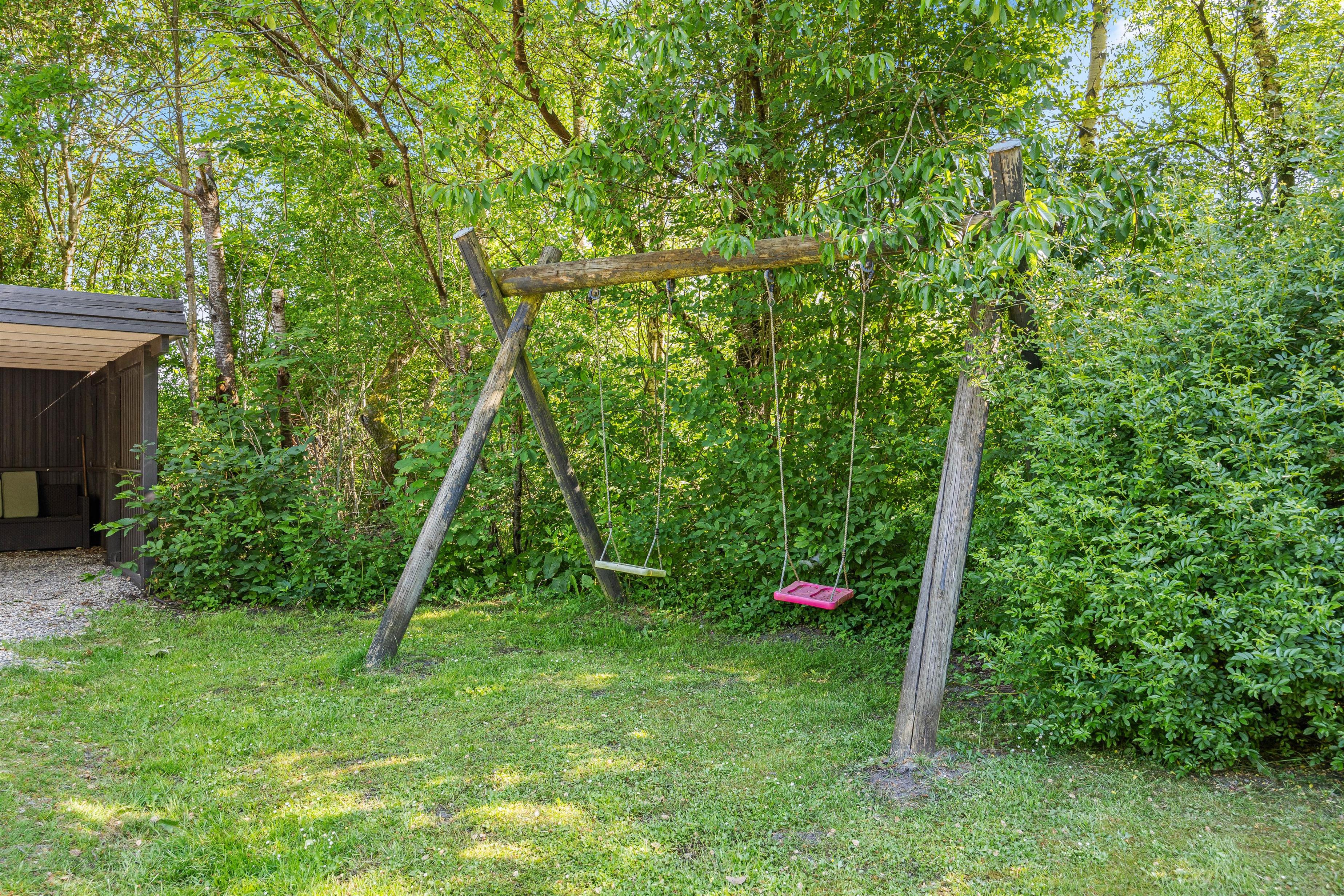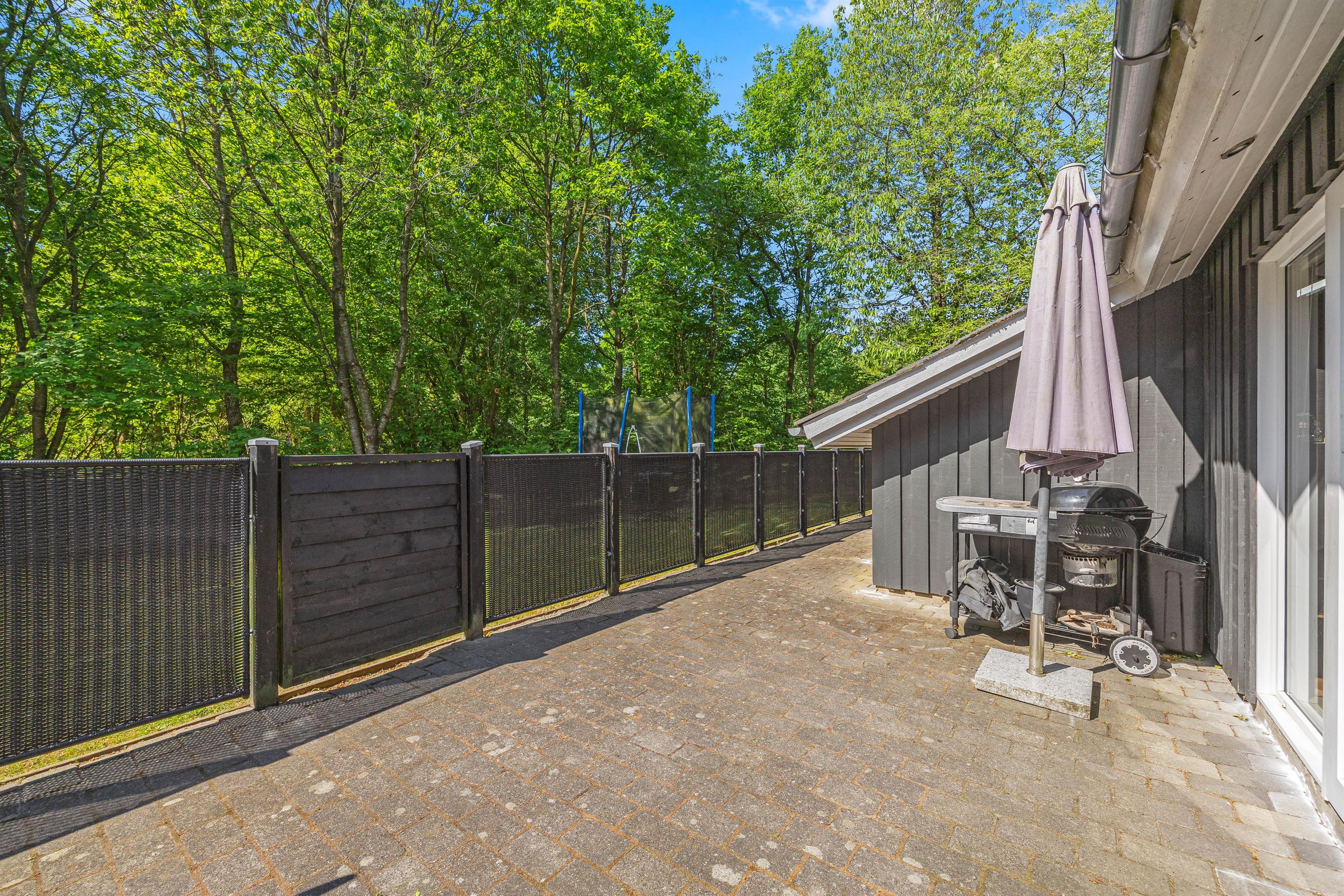 Indhegnet grund med lukket terrasse, gynge, sandkasse og trampolin